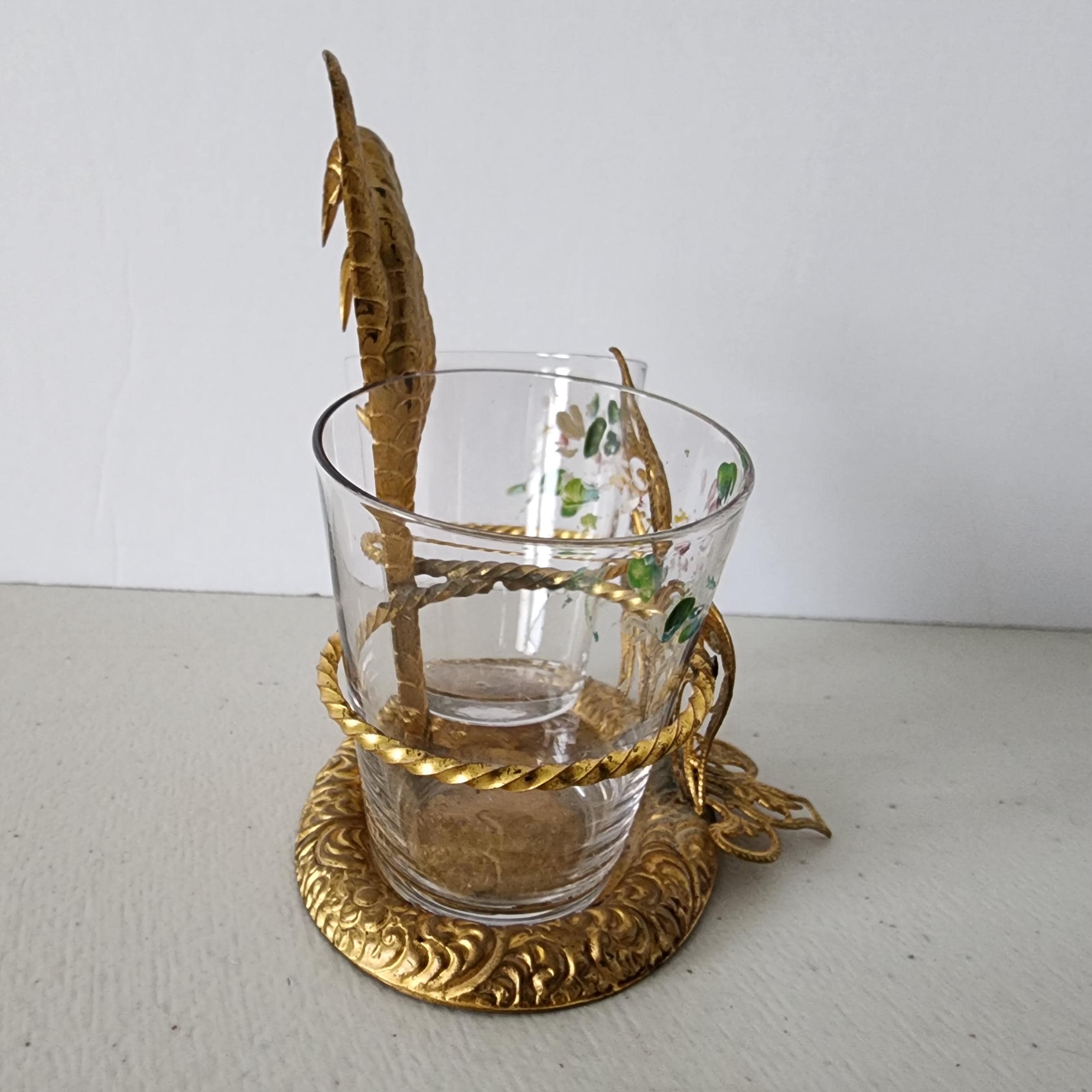 An antique unique metal talon or claw handled toothpick and/or match holder. The glass holders have painted floral foliage designs. There are no markings on the piece.