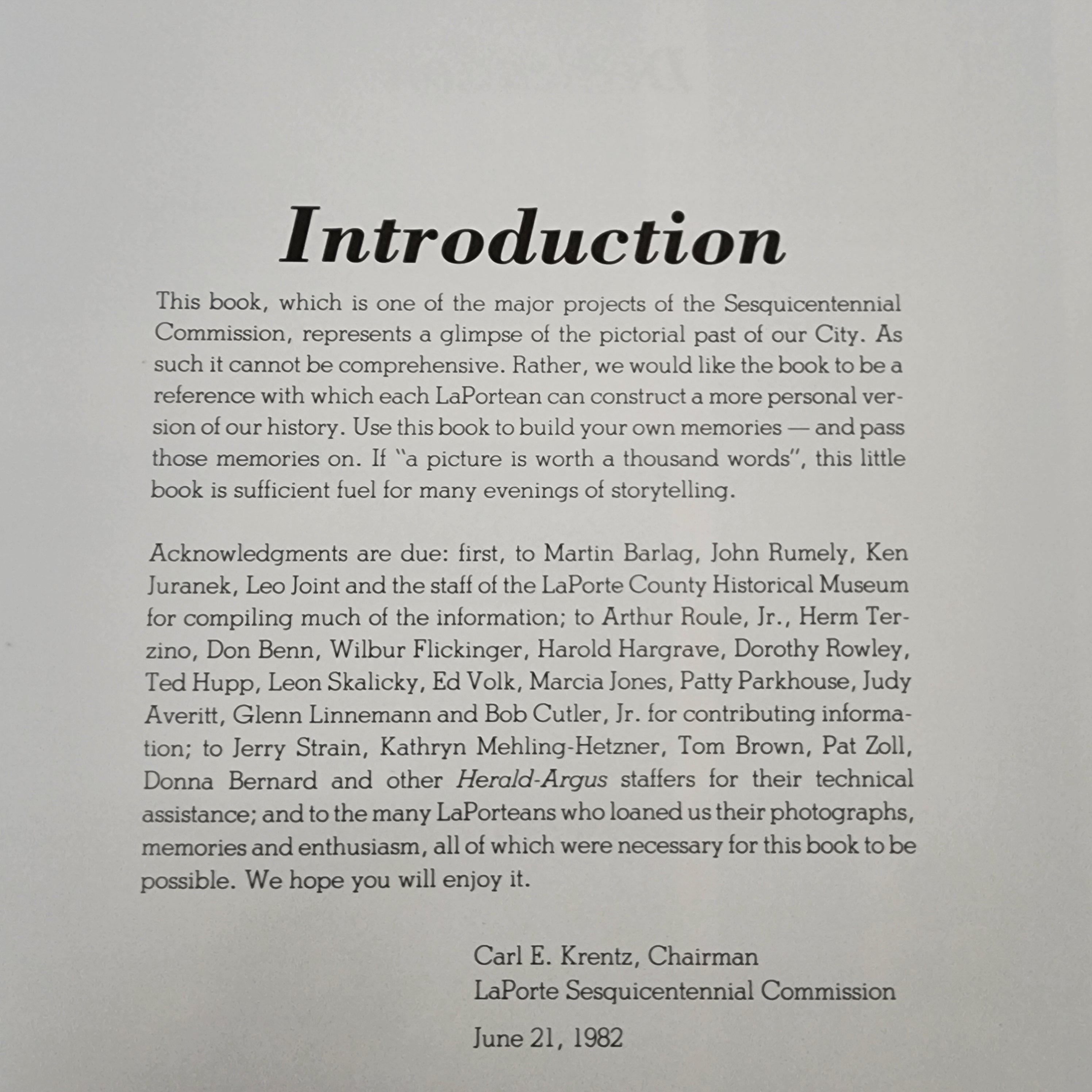 This is the hard back with dust jacket book titled LaPorte - Now & Then 1982 - 1832. It was put together for the sesquicentennial anniversary of the city. 159 pages with many photos. It is numbered on the cover page #1451 of 2500 and has a signature below it.