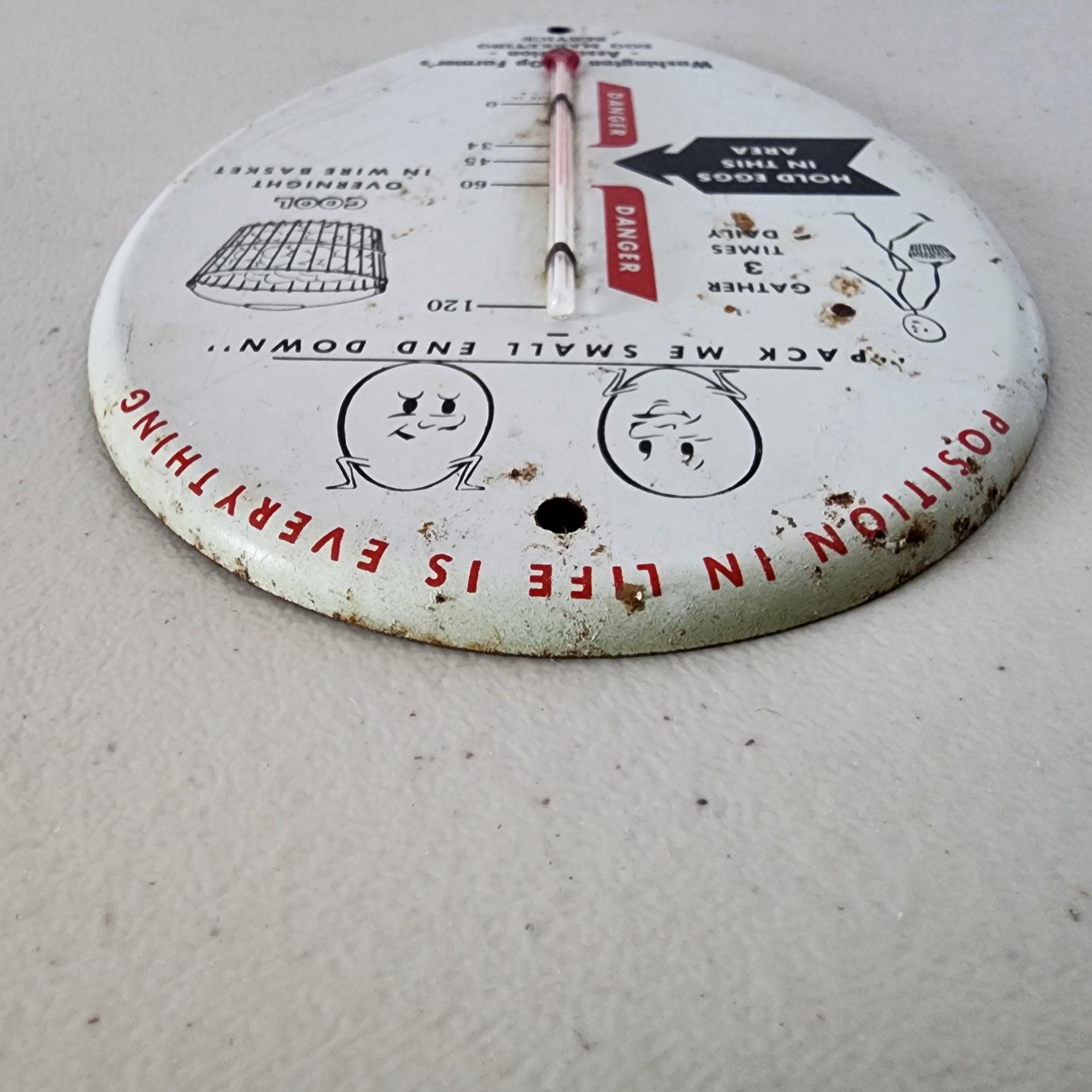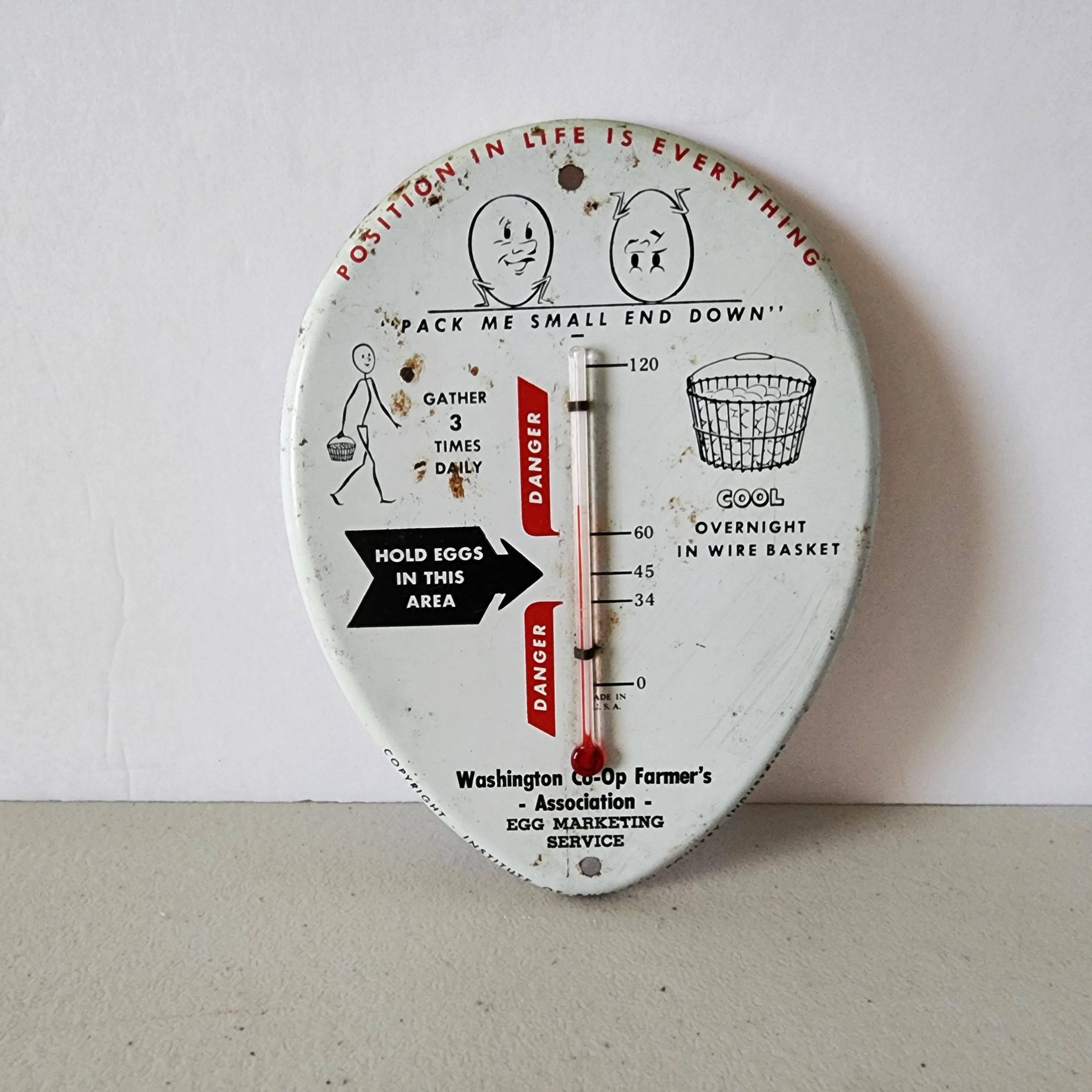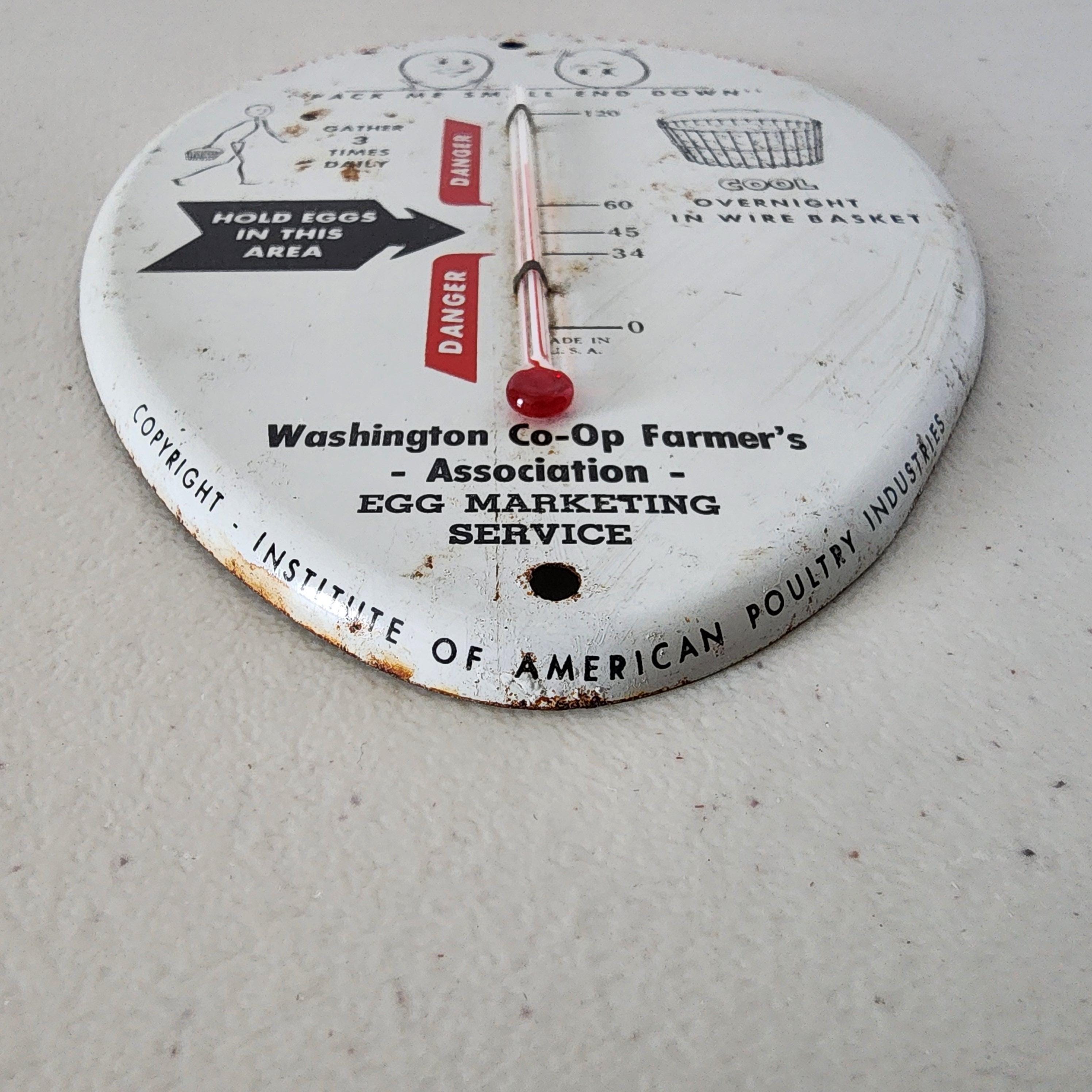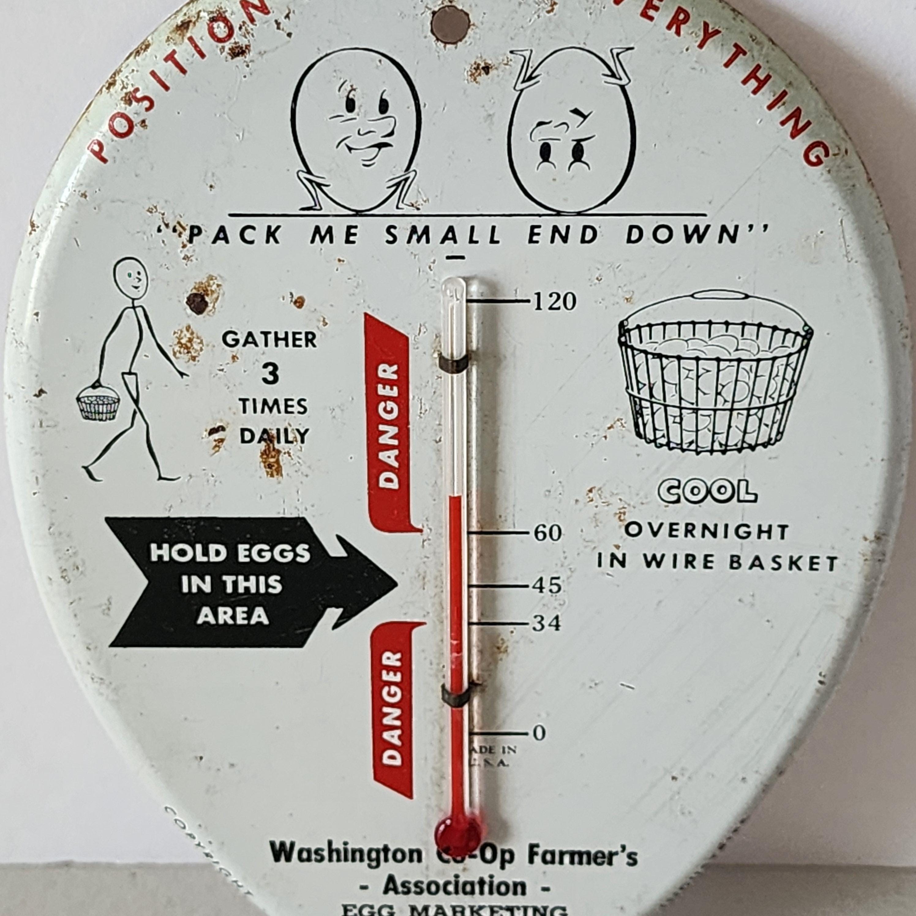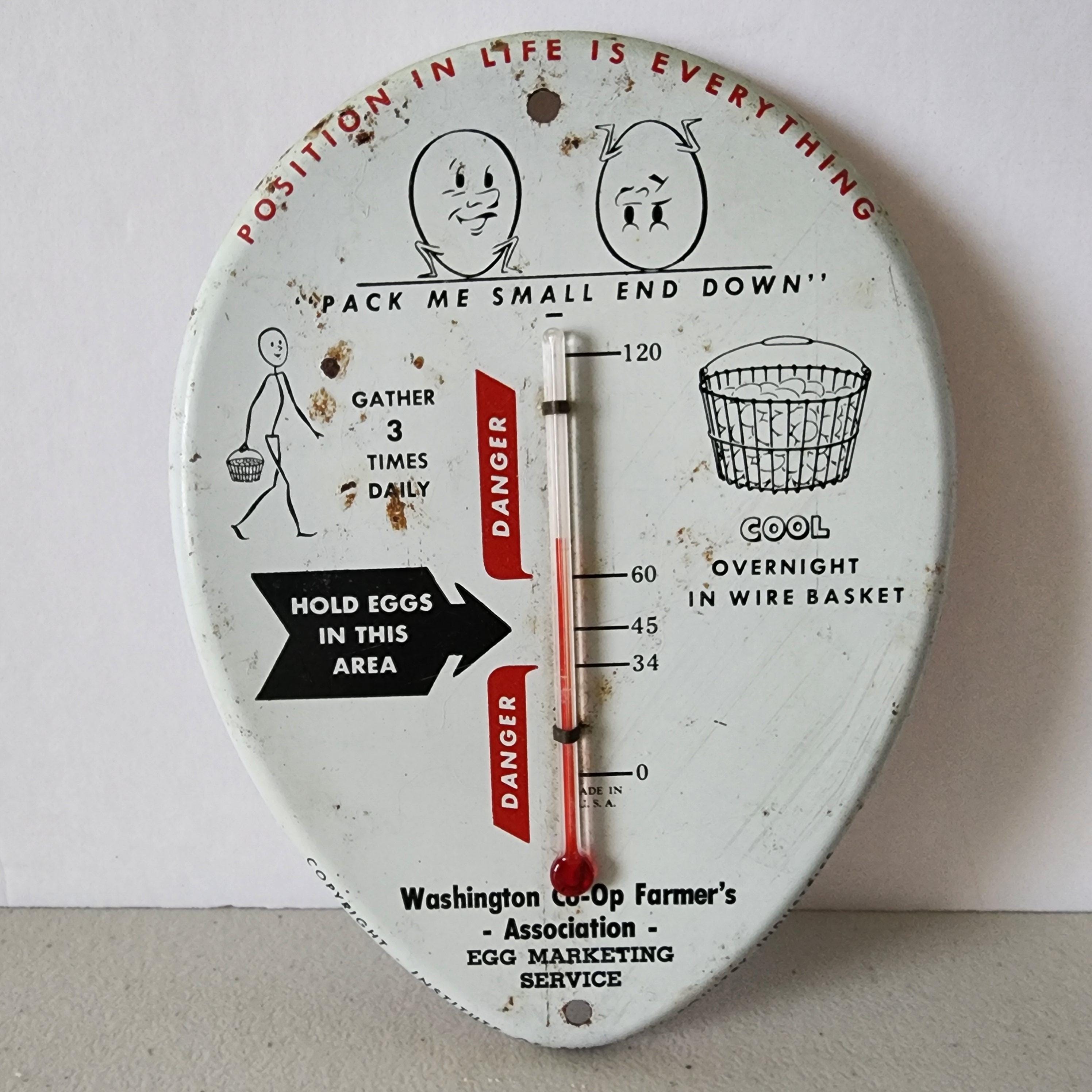 A vintage 1950s era cute egg shaped metal thermometer sign from the Washington Co-op Farmer's Association egg marketing service. Copyright by the Institute of American Poultry Industries. It shows which way to pack eggs, how often to gather, and how to store safely.
