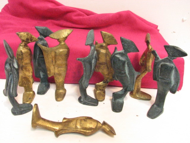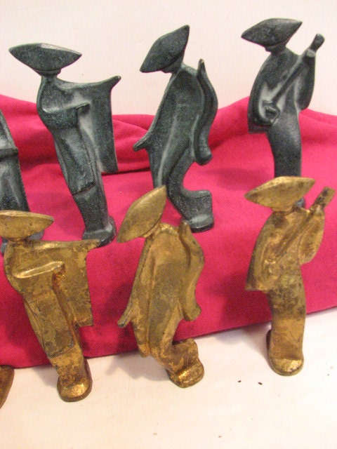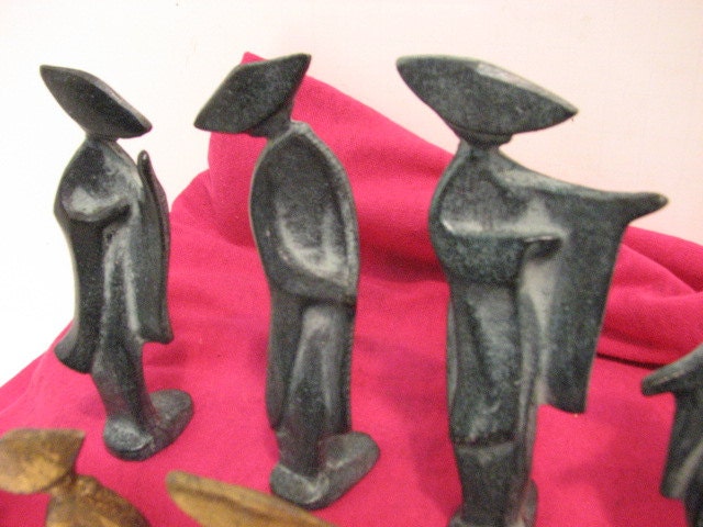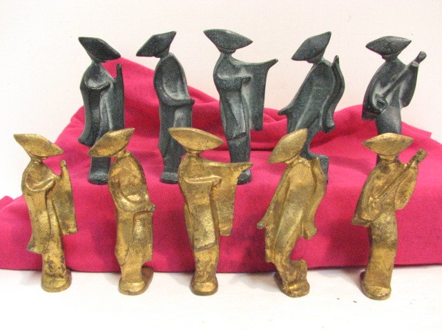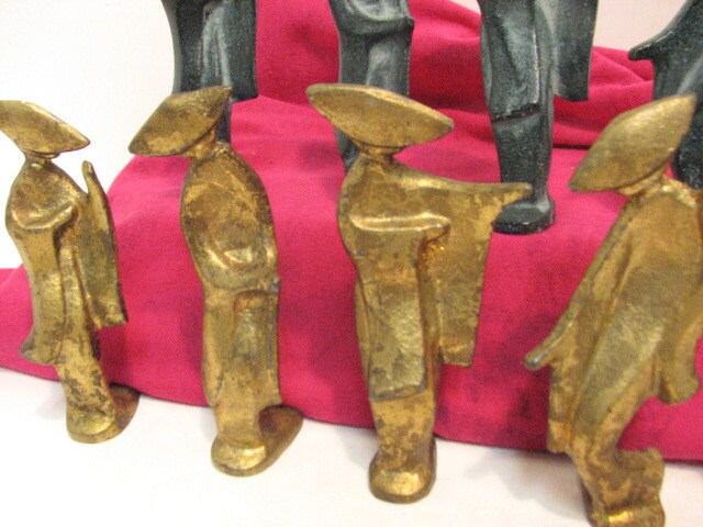 This is a lot of 10 vintage Japanese Geisha Girl cast iron figures. Each figure figures stand approximately 4.0" tall and are heavy as they are made of cast iron. There are 2 of each figure, 1 in gold and one in green finish. They would be wonderful in many types of decor, but especially a modern minimalist look.