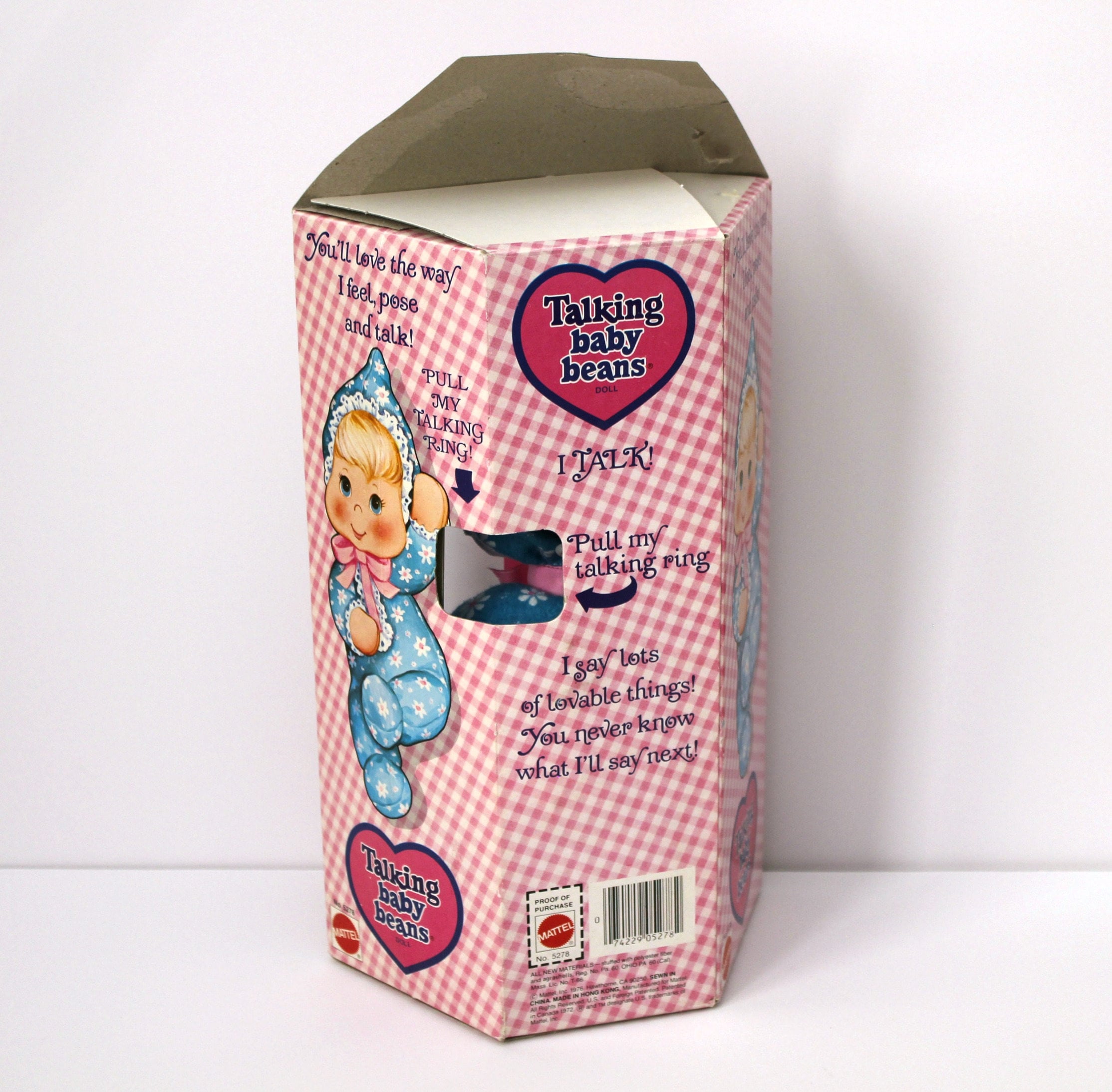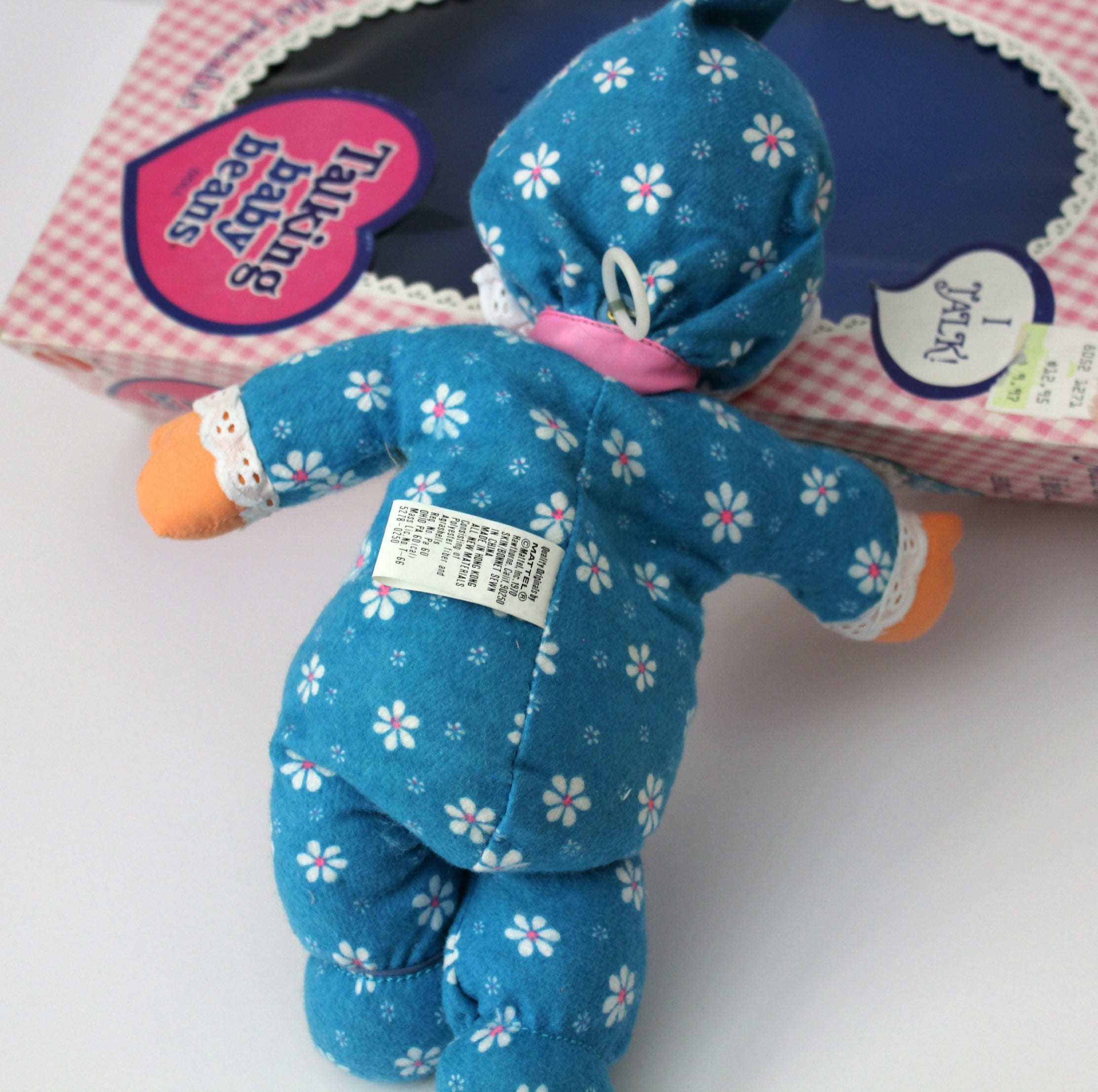 This is a vintage Talking Baby Beans doll by Mattel from 1976 in excellent shape. She comes in the original box with the tie string still on her legs. Pulling the string on her back will get her to say various phrases such as "I love you", and she still talks great.