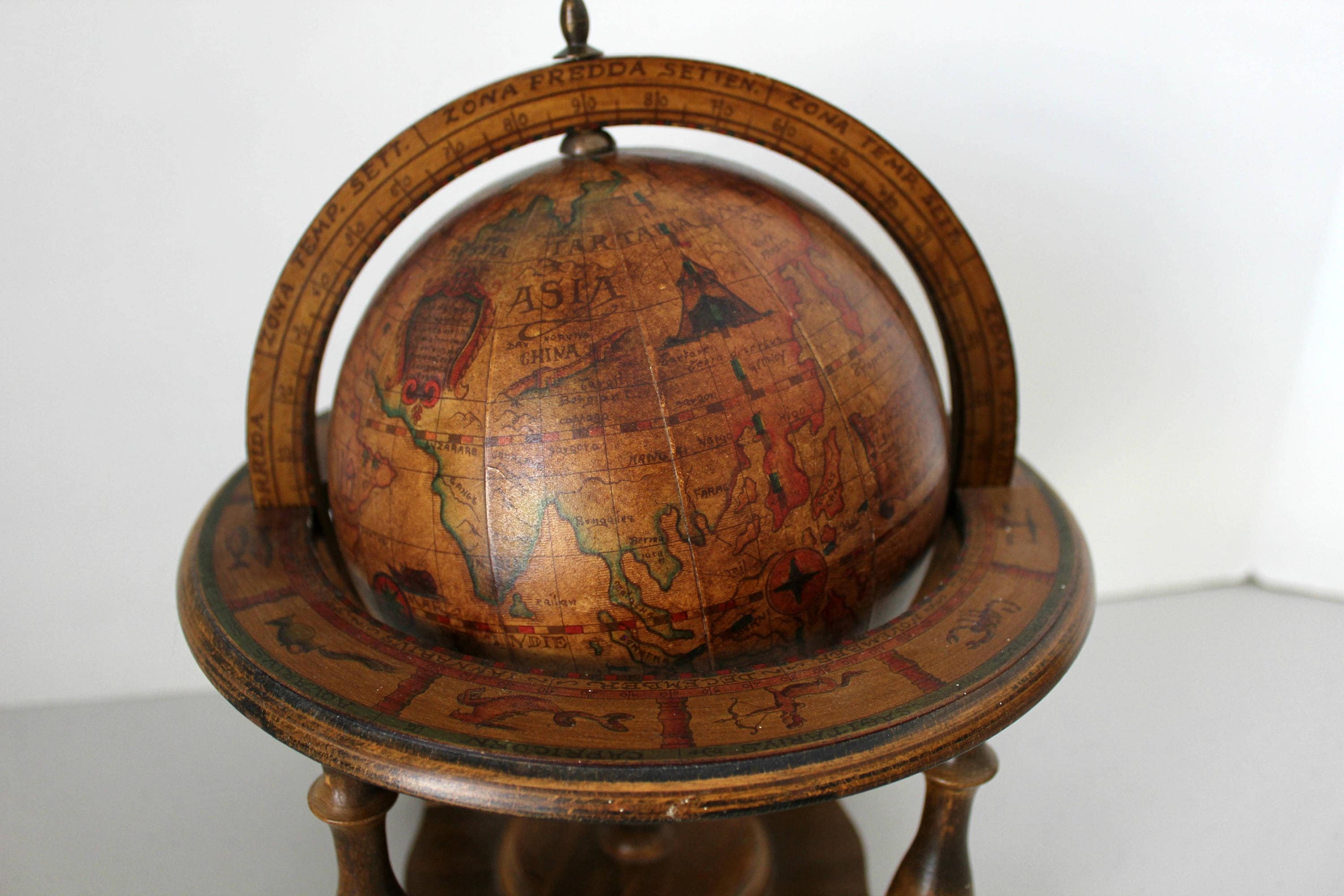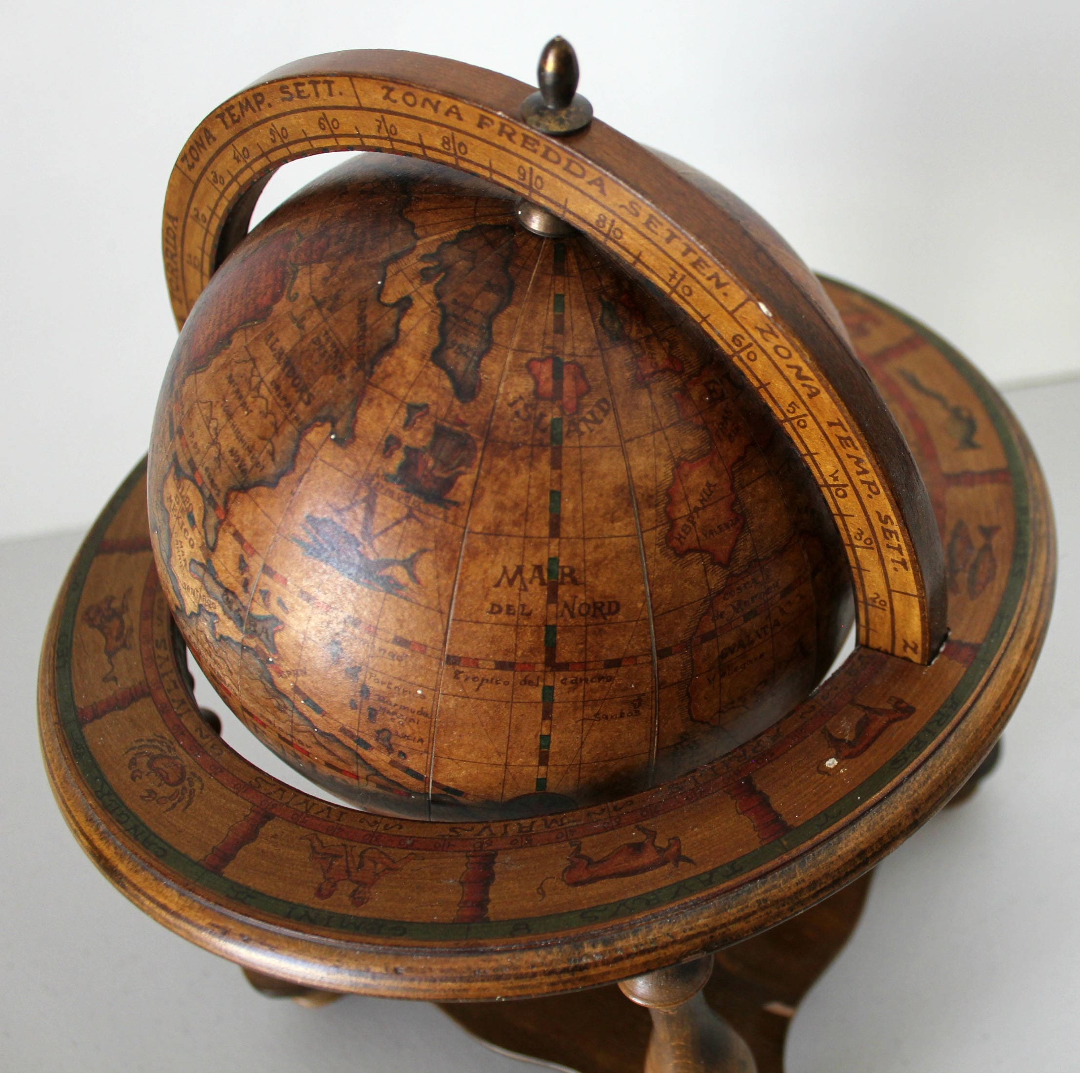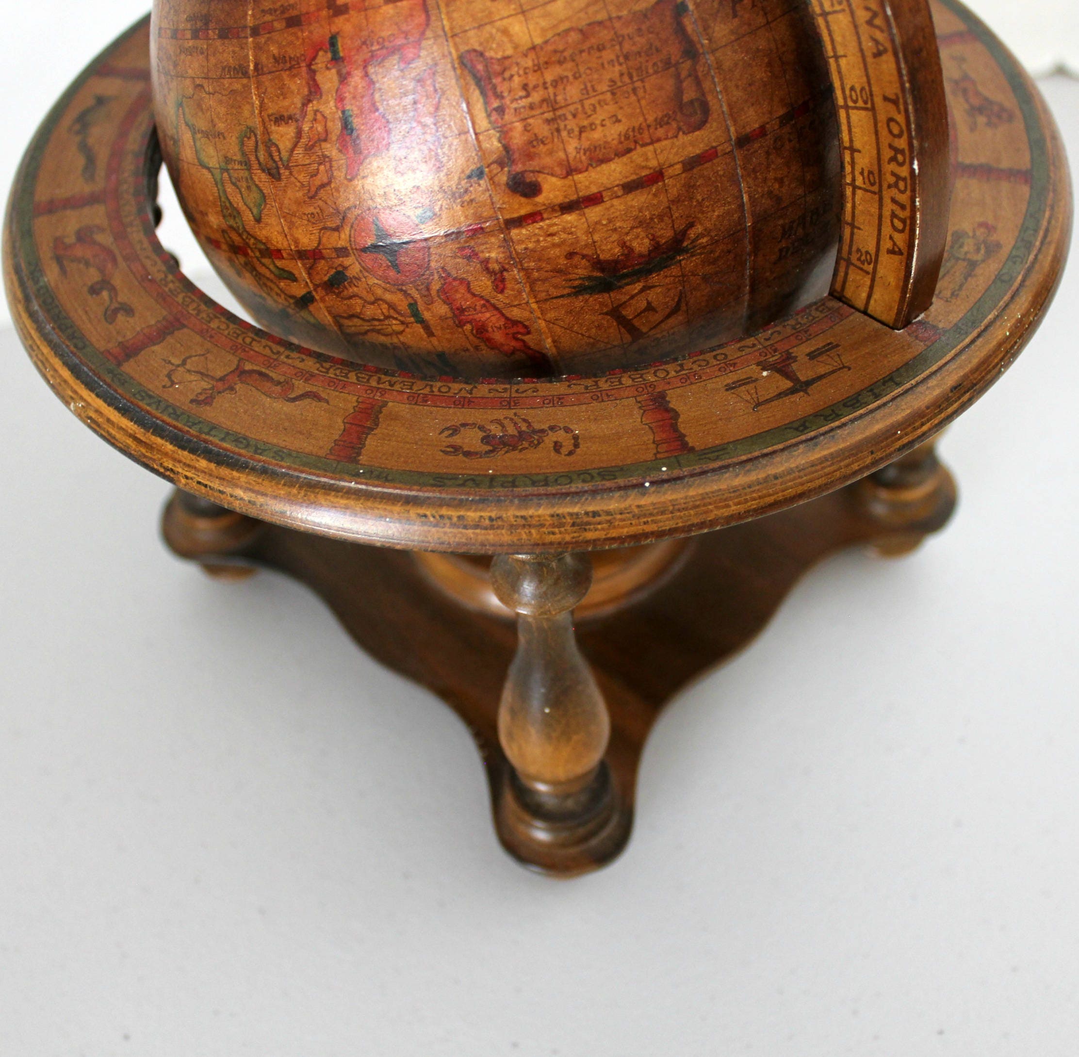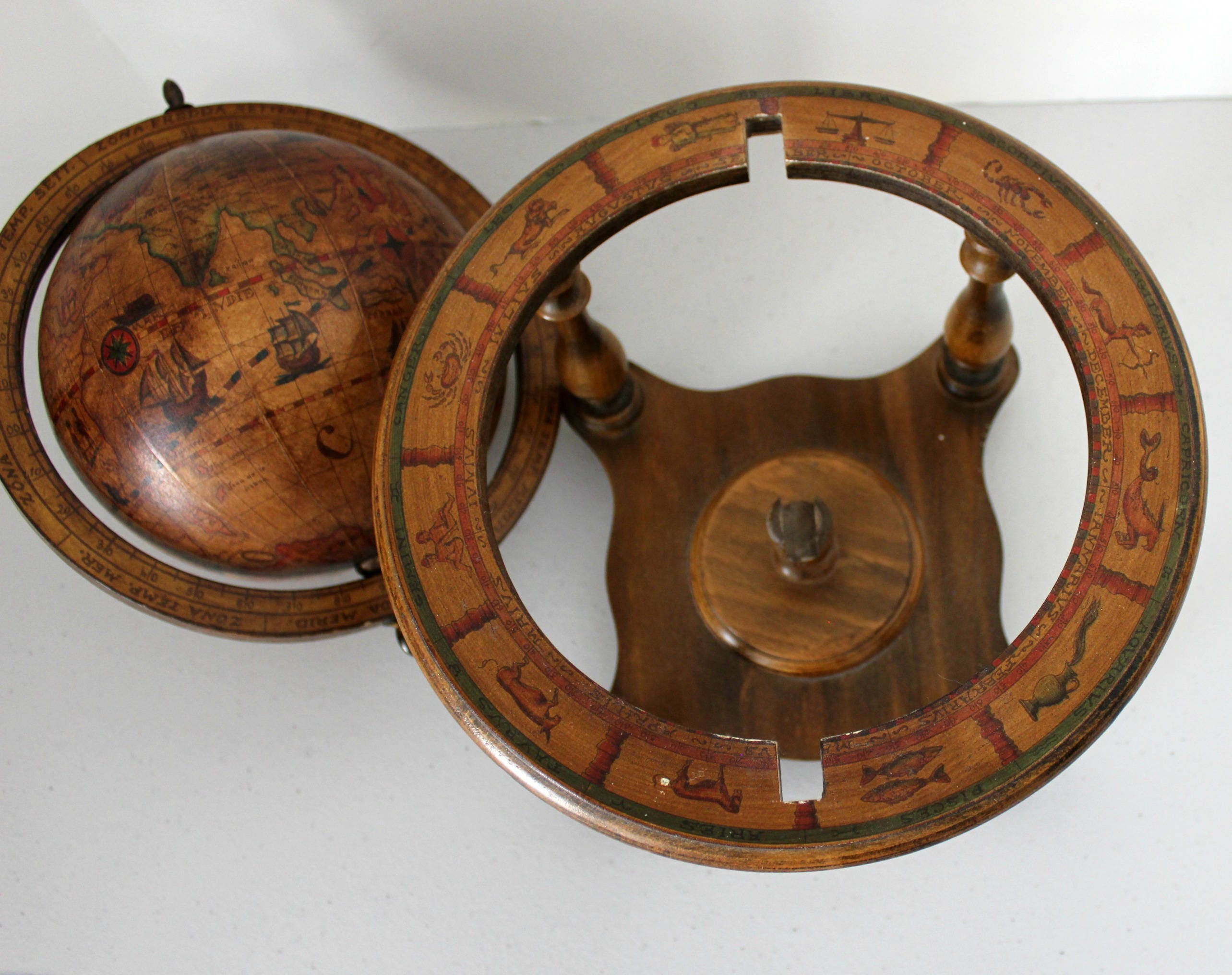 This is a nice Italian old world mini globe. It stands about 11" tall and 9.25" in diameter. The miniature globe portion can be positioned and removed completely from the base. Around the upper base are all 12 zodiac signs.