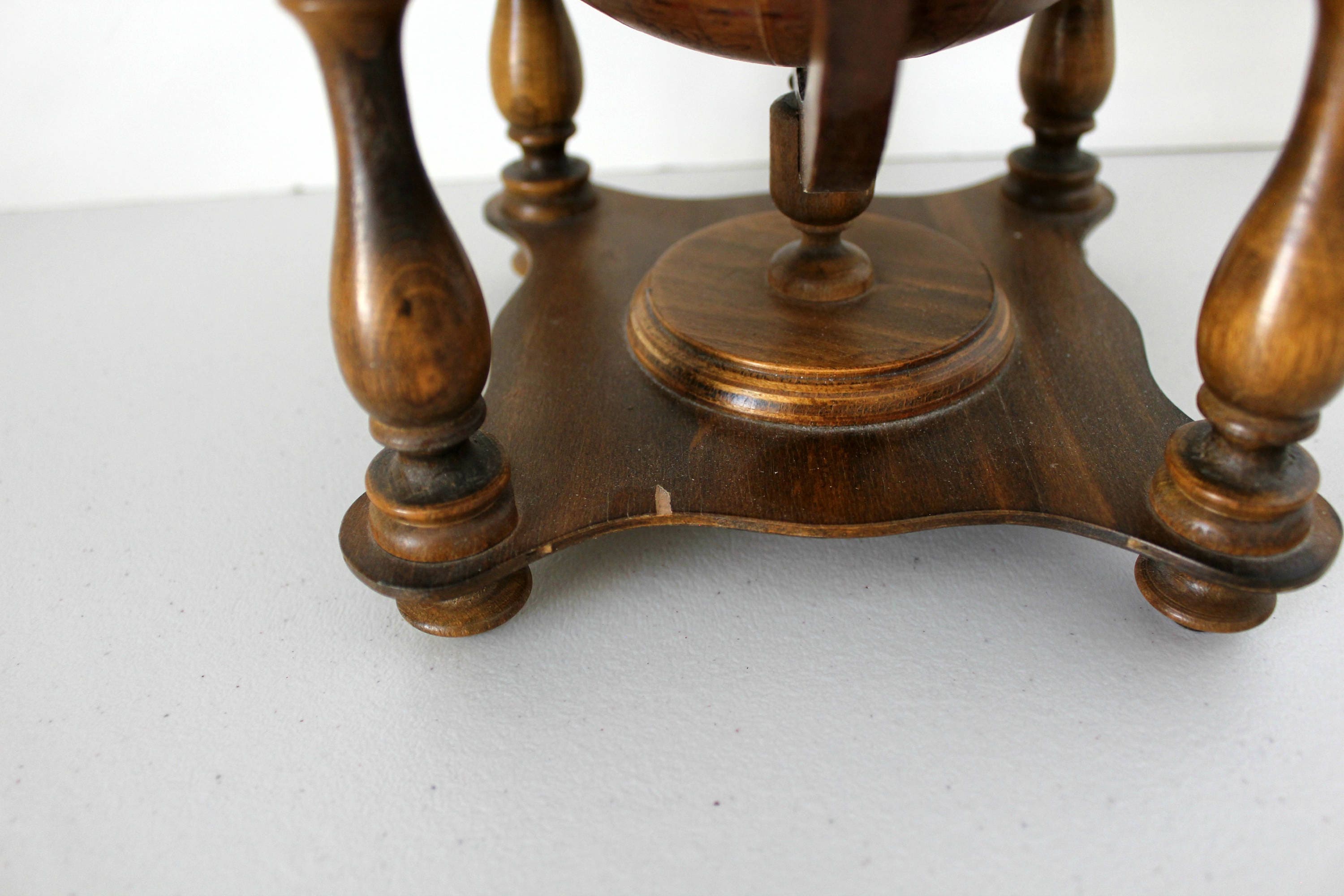 Made of wood it has a chip on the bottom of the base, as well as a few other spots where the finish is marred. Please see all the photos as I tried to show the condition well. Still displays nicely.
