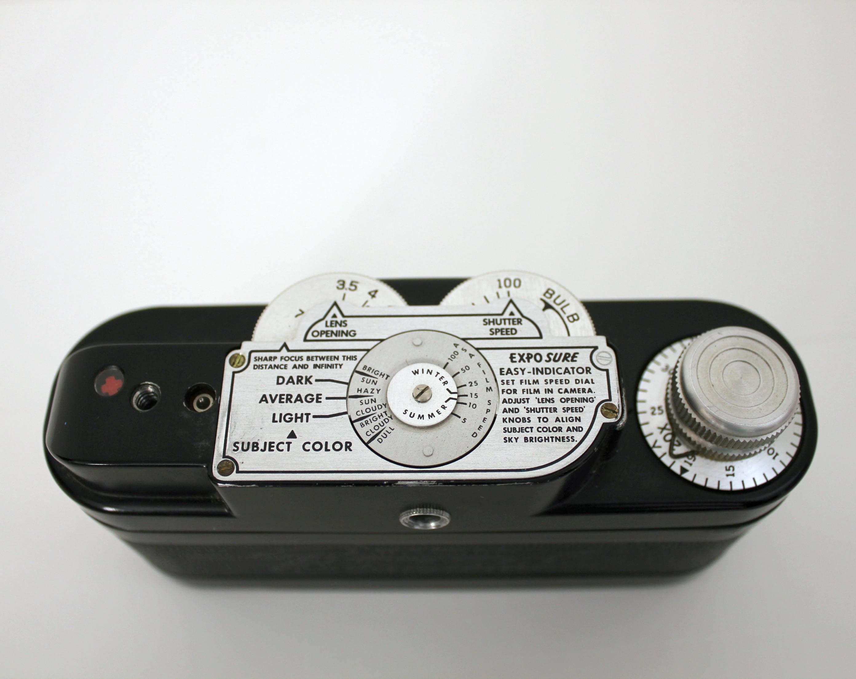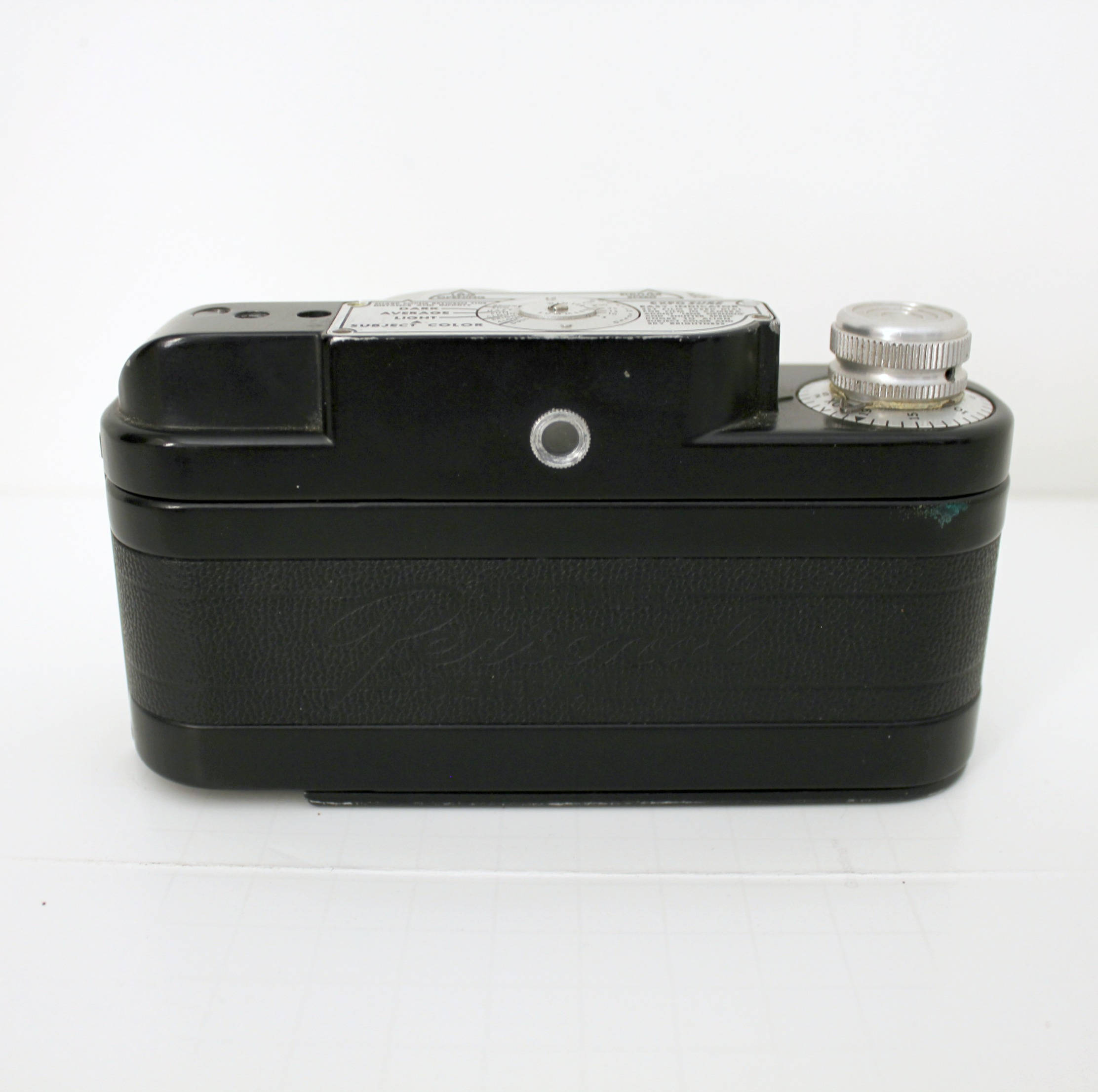 The camera shows only minor cosmetic signs of use. The case has some numerous marks. There was a label/sticker on the top at one time that had the previous owner's name on it, and a previous owner's name is written inside the case lid on the felt.