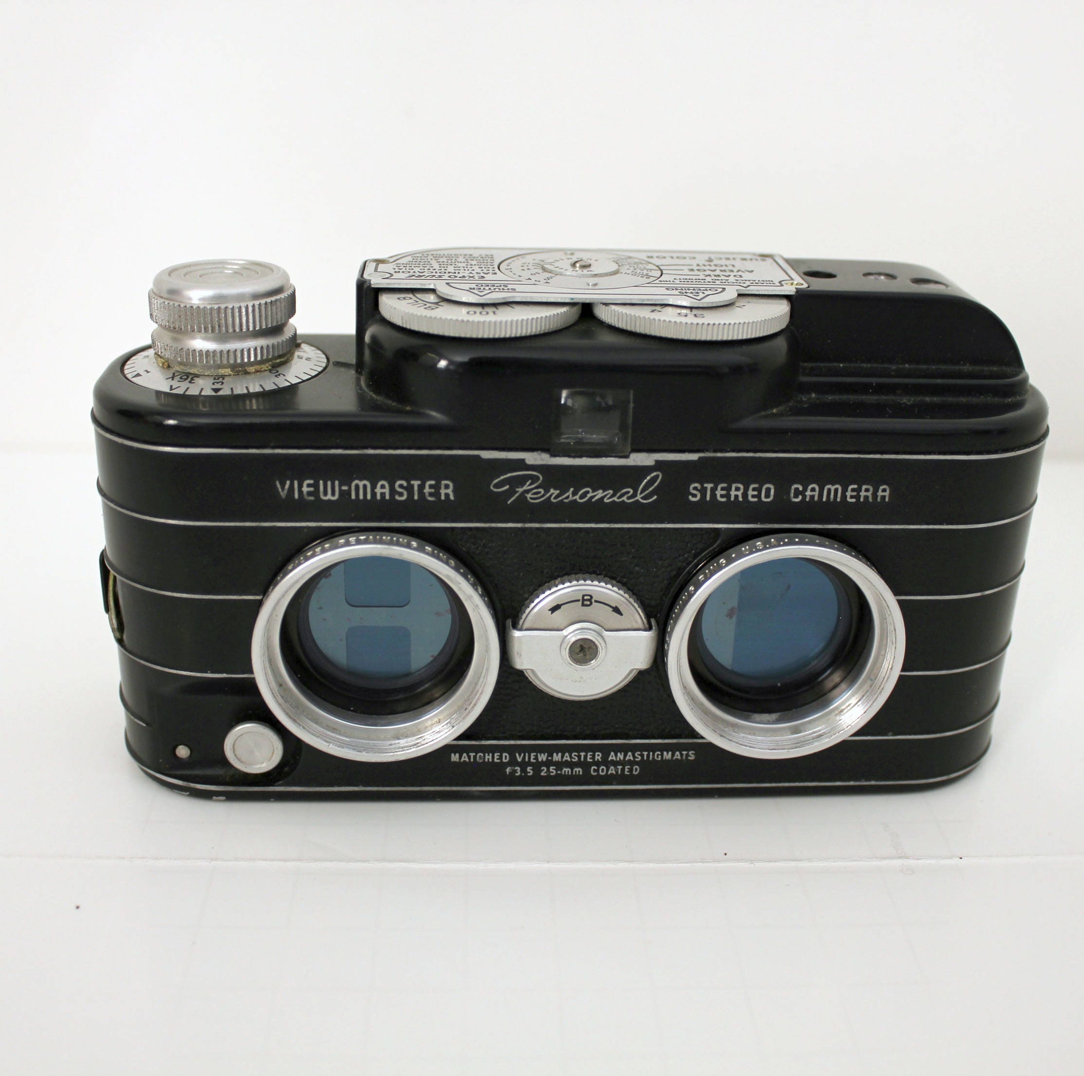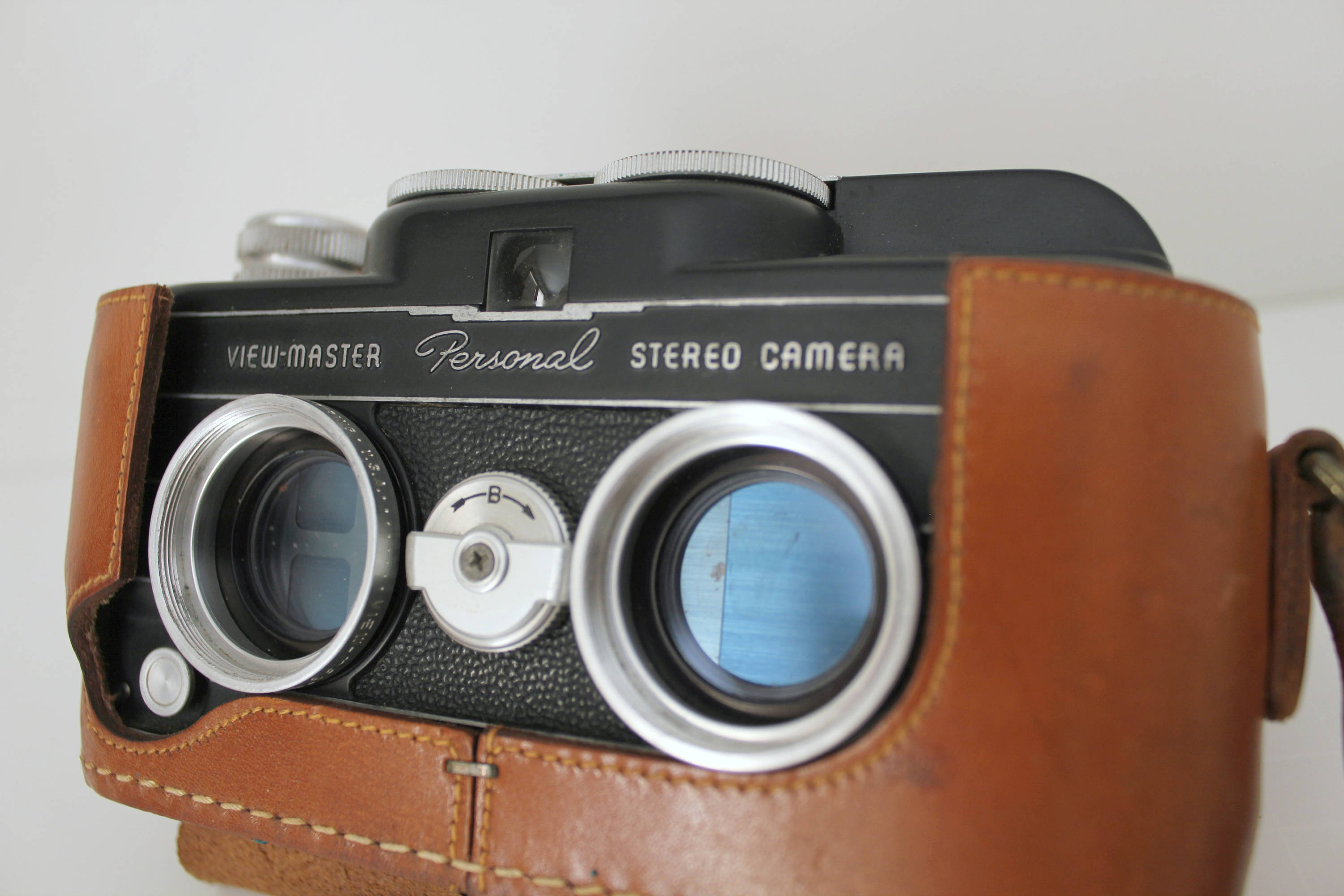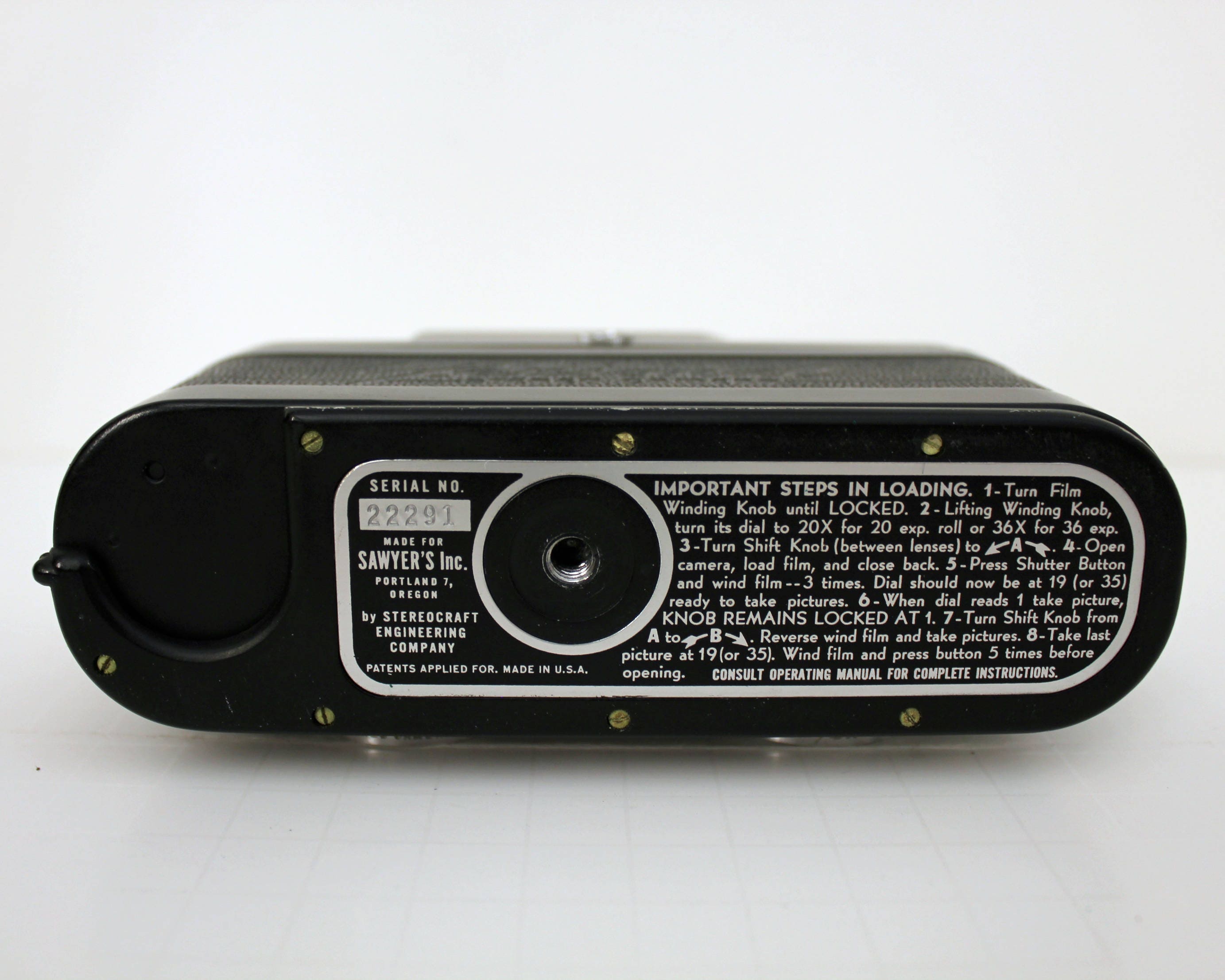 A View-Master Personal Stereo Camera with case. Made for Sawyer's by Stereocraft. This vintage camera appears to be in working order as it cranks and the shutter works. I've taken close up photos of the lenses so you can see the double frame in one as as well as the specks on them.
