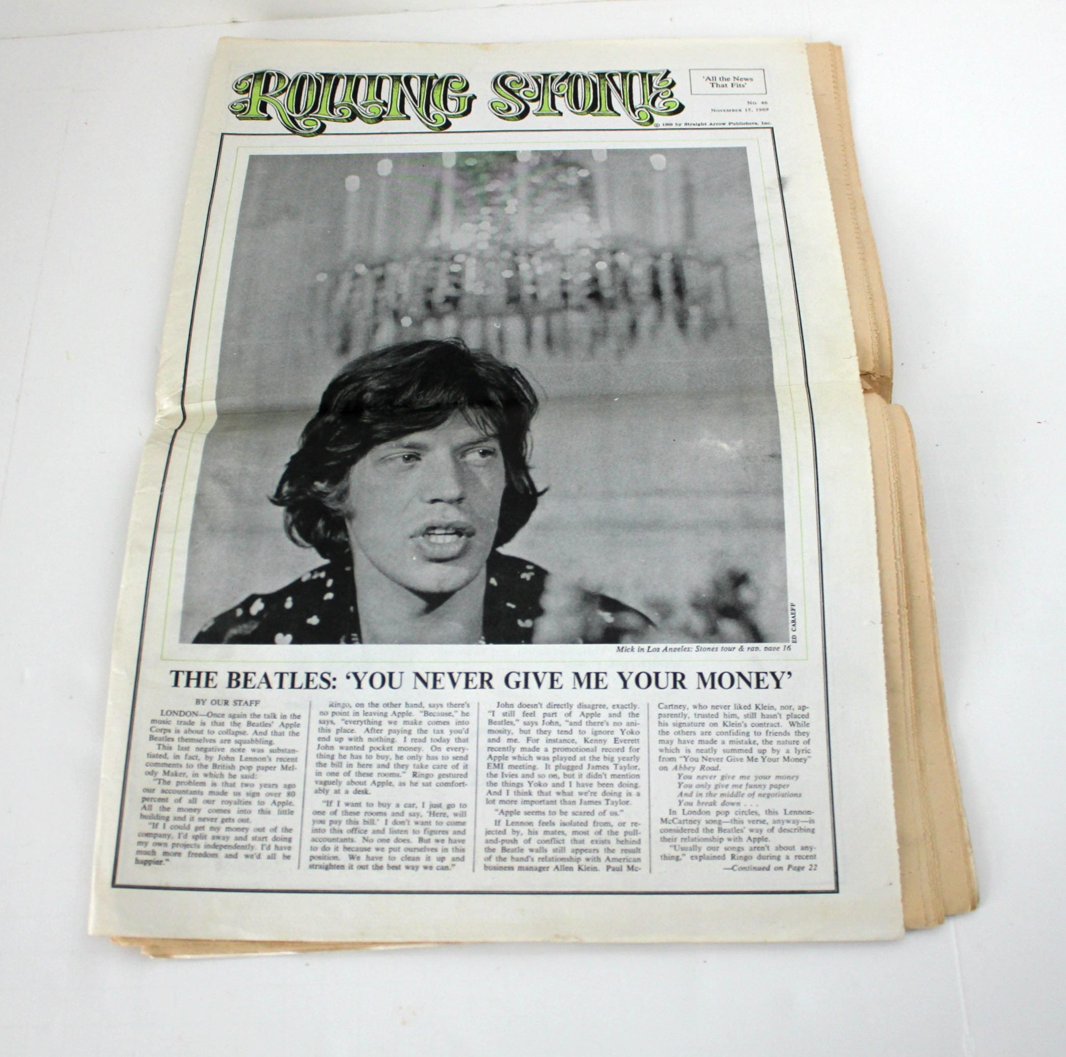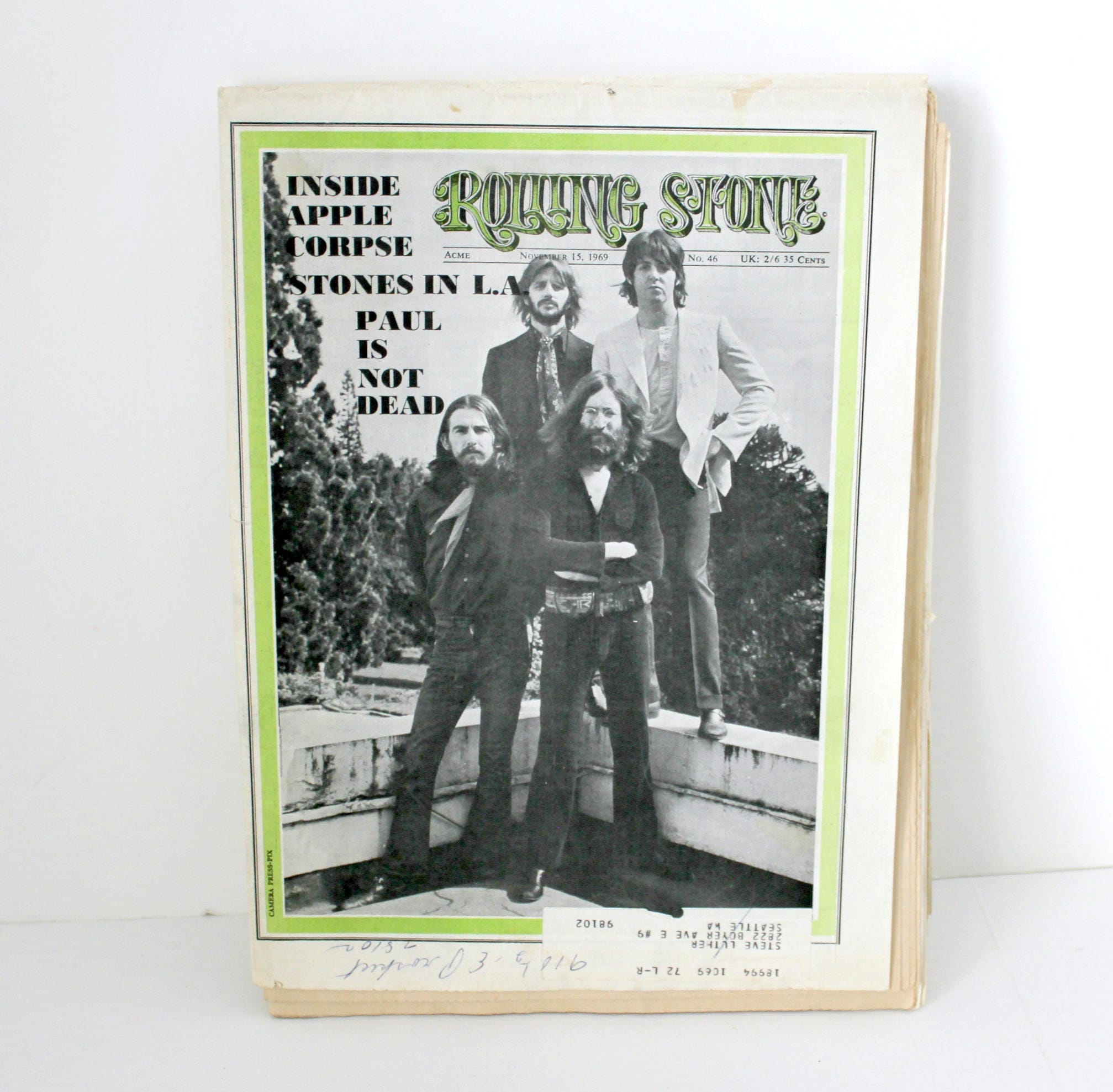 This is the November 15, 1969 No. 46 edition of Rolling Stone featuring the Beatles on the cover. It's in nice shape as you can see from the sample photos. There are lots of other articles on music and musicians inside. Besides the Beatles, there is also a large Jimi Hendrix story.