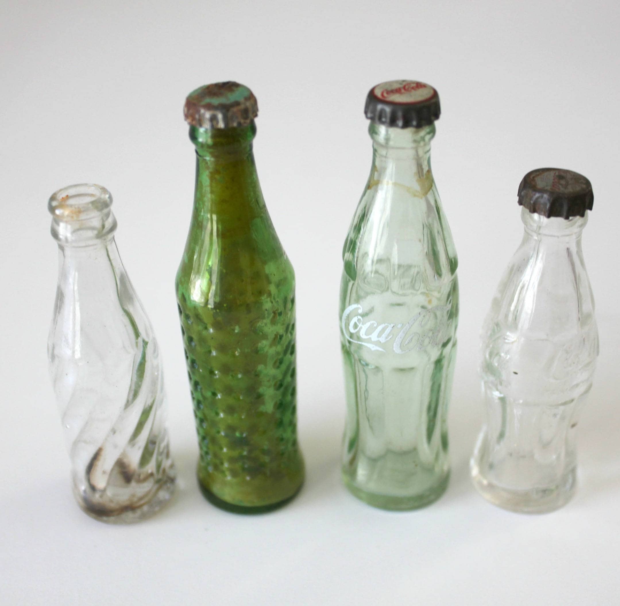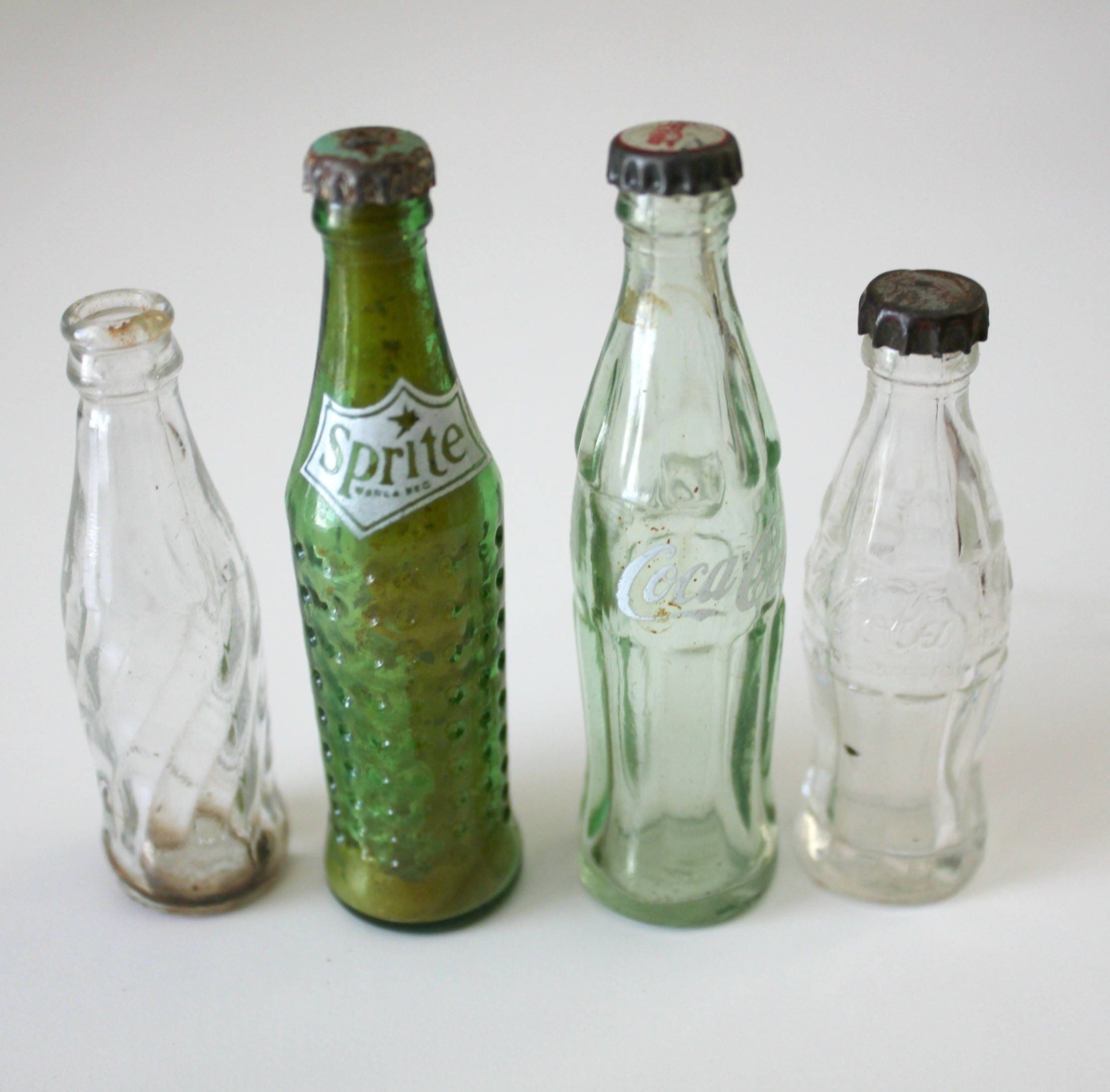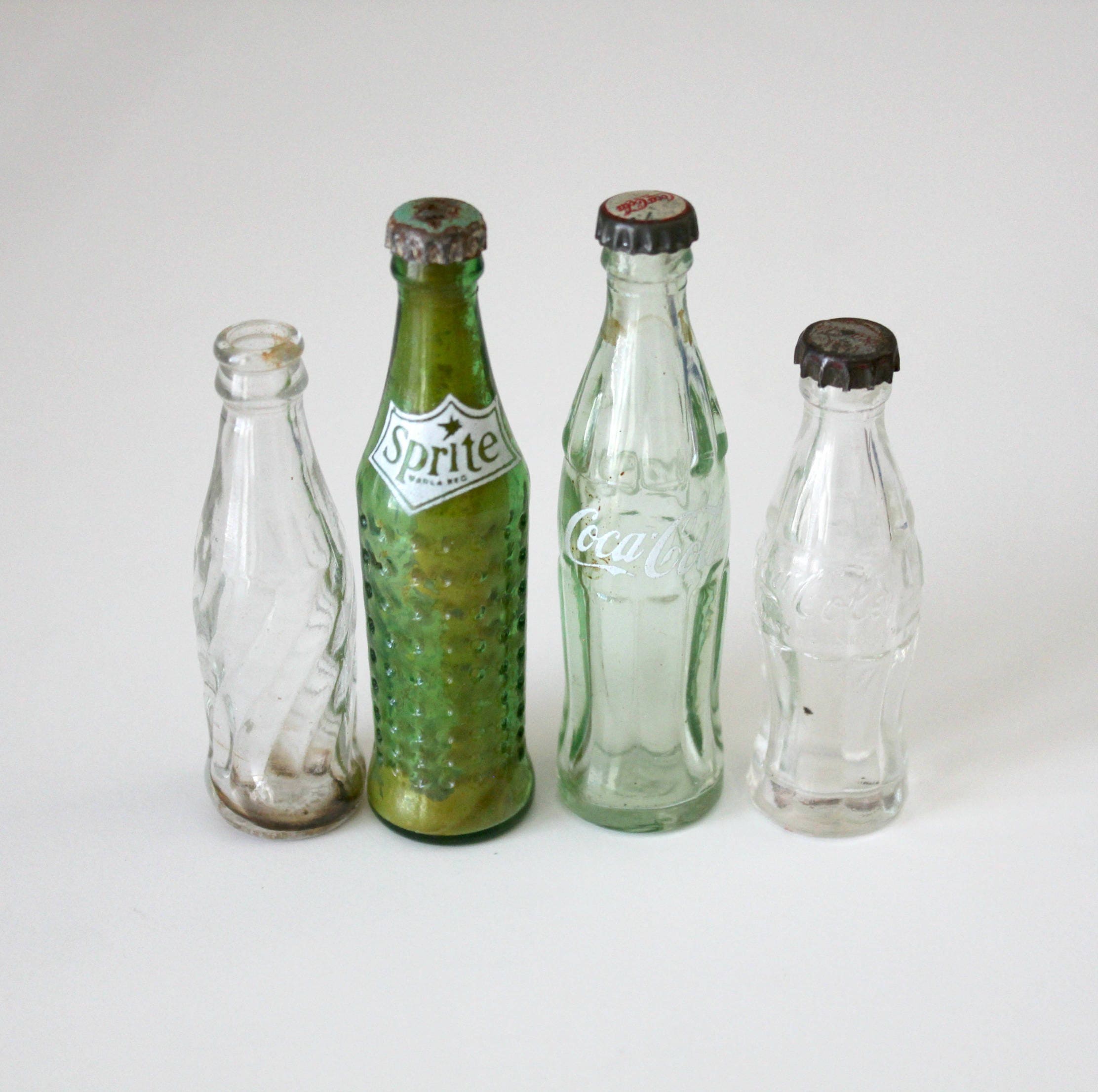 These are 4 vintage miniature glass advertising bottles of Coca Cola, Sprite and I believe Pepsi. They range in height from about 2.5" to a little over 3" tall. You get a green Sprite, a light green and clear Coca Cola and a clear swirl bottle that is the type Pepsi used. There is raised lettering on the bottom that I can't quite make out except "mfg co".