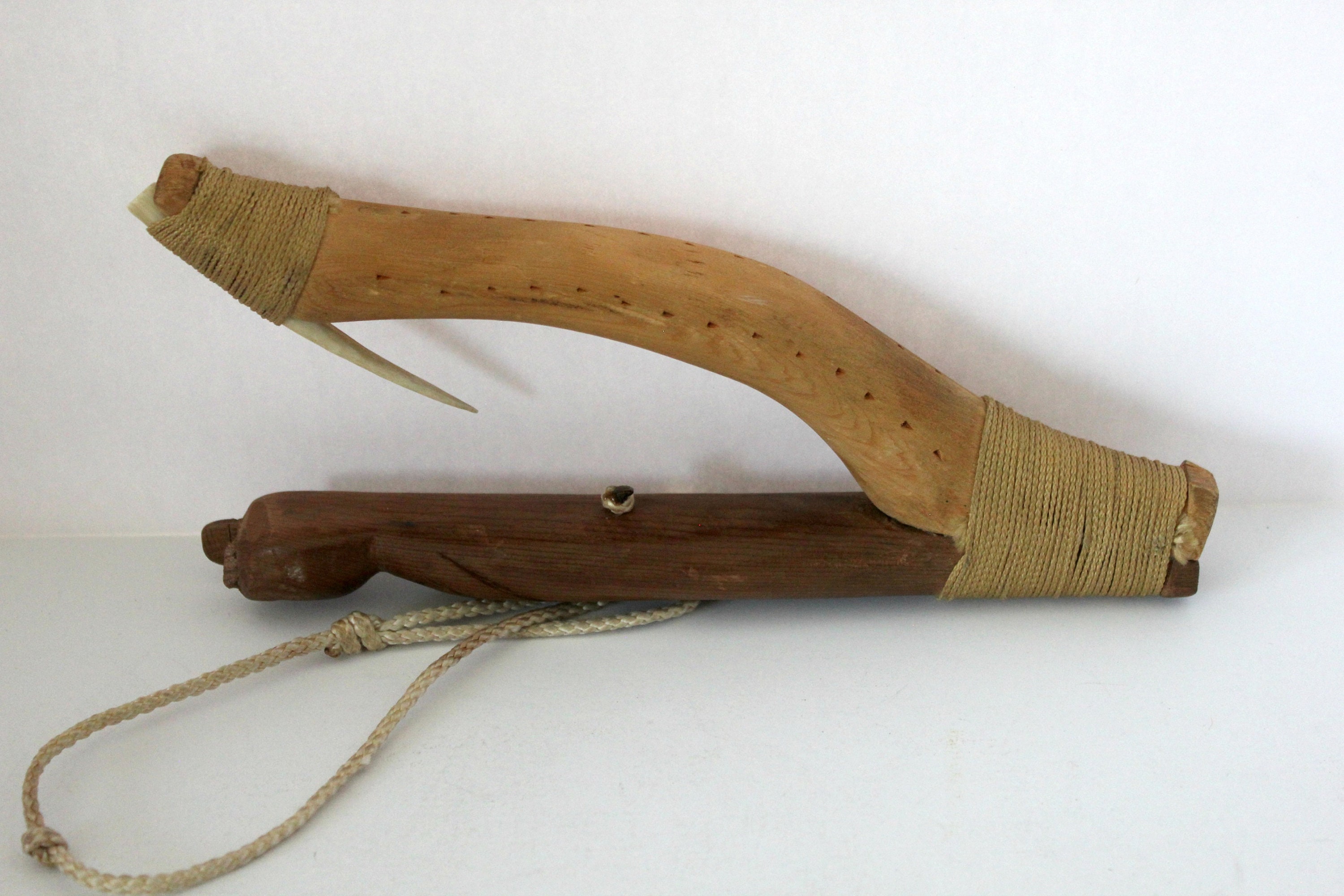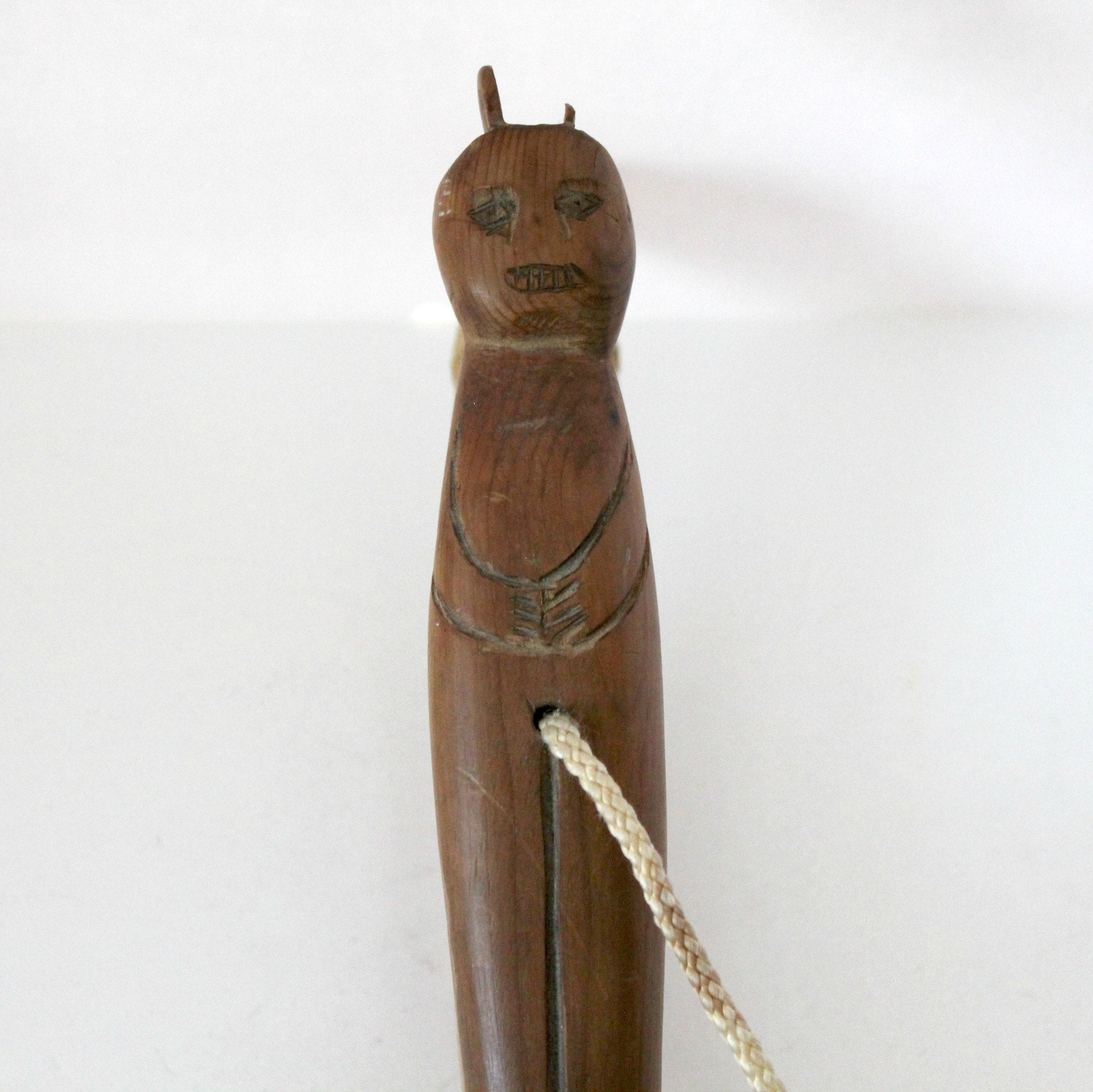 This is a vintage native Inuit halibut hook from the northwest. It is signed with what appear to be initials R and possibly an I and then '92 I think. It measures about 9.75" long. The hook is bone I believe. The darker brown side has a carving on the outside. These were used to catch an appropriate sized halibut, leaving the too large and too small unable to get hooked and therefore not wasted and left to live in the waters.