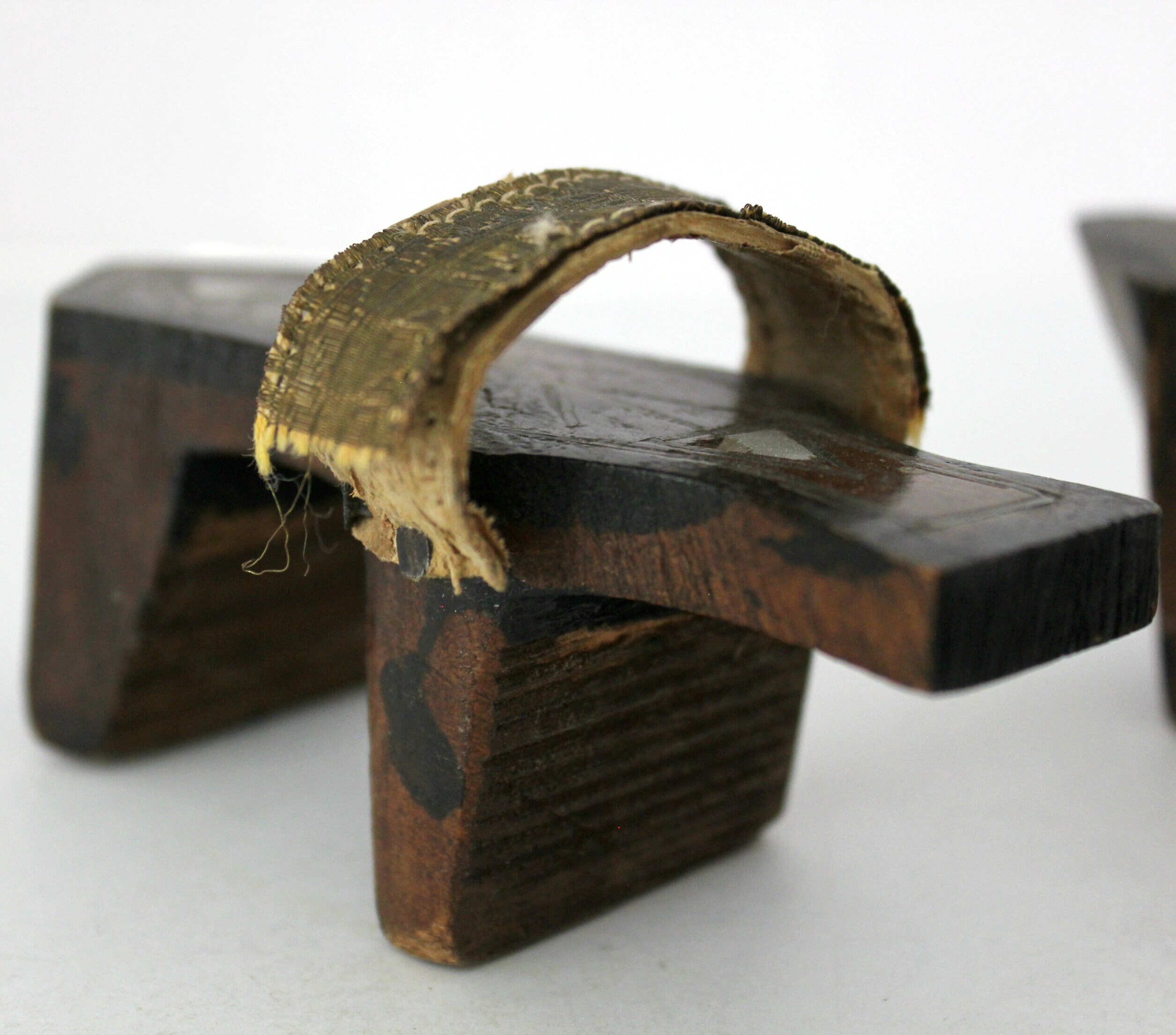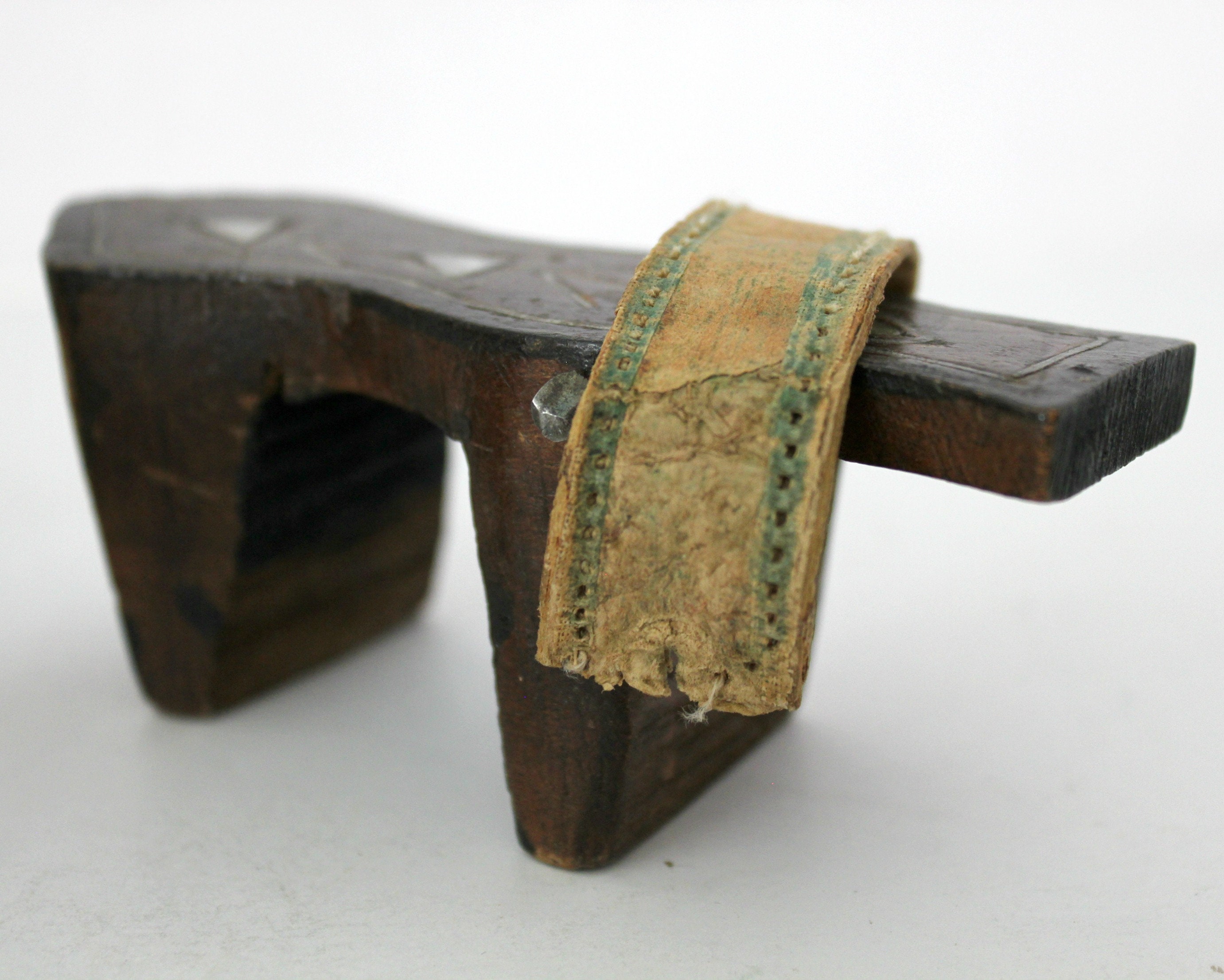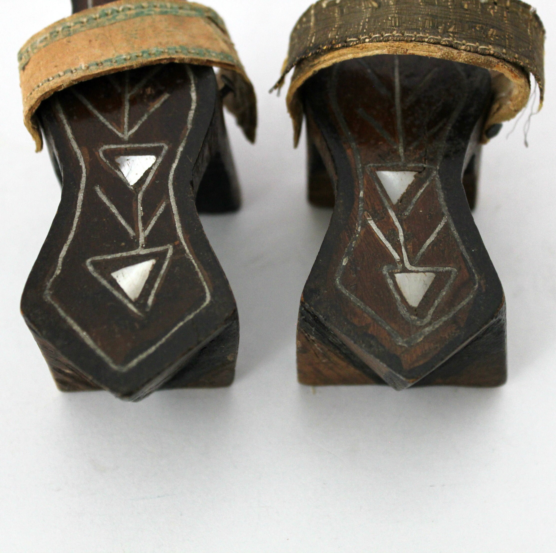 Both shoes have age and use signs. The strap on one has torn away from the nail and the outer strap covering is also missing. The other shoes strap is coming apart but is still attached at both sides. The triangle inlay looks like mother of pearl on the shoe tops.