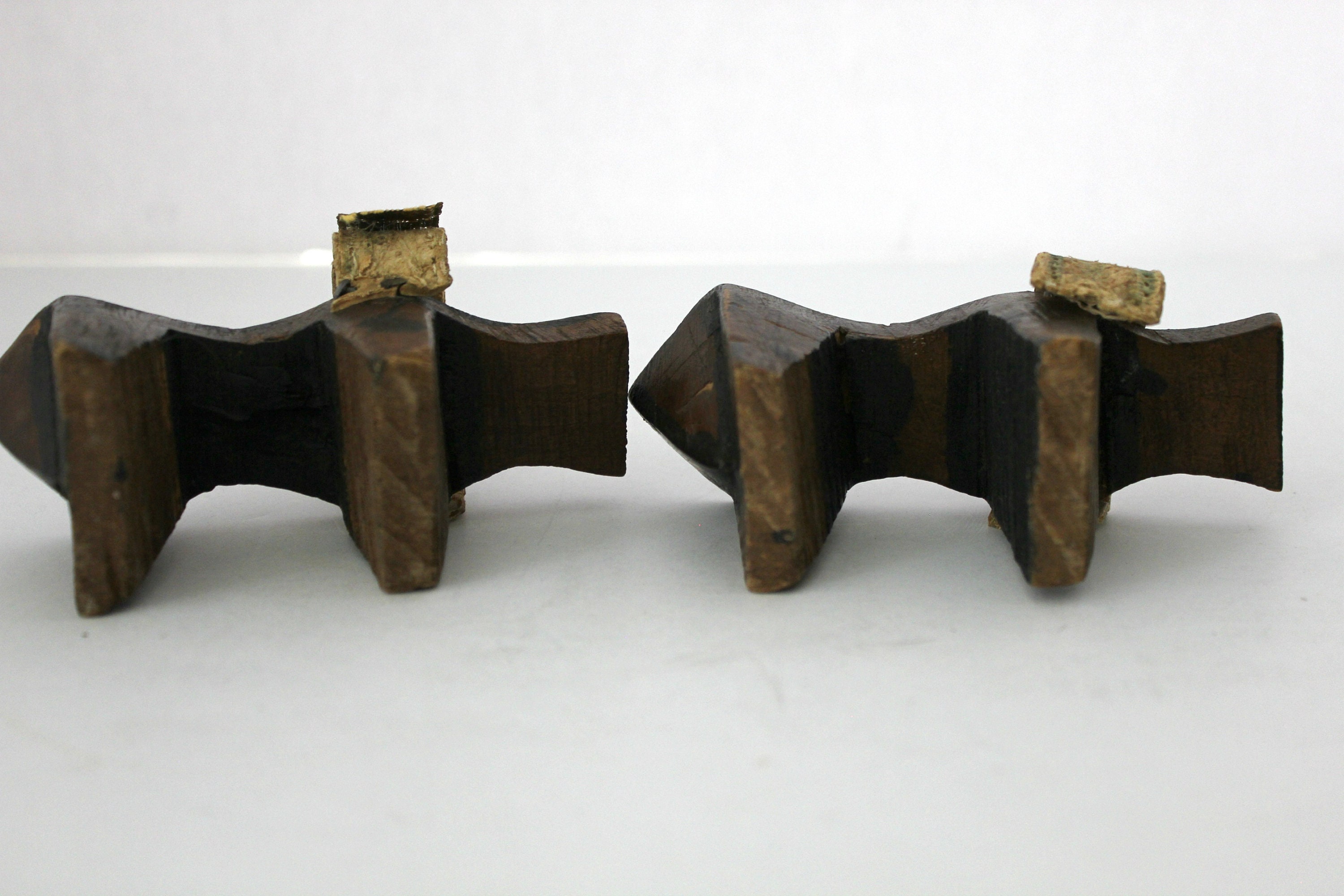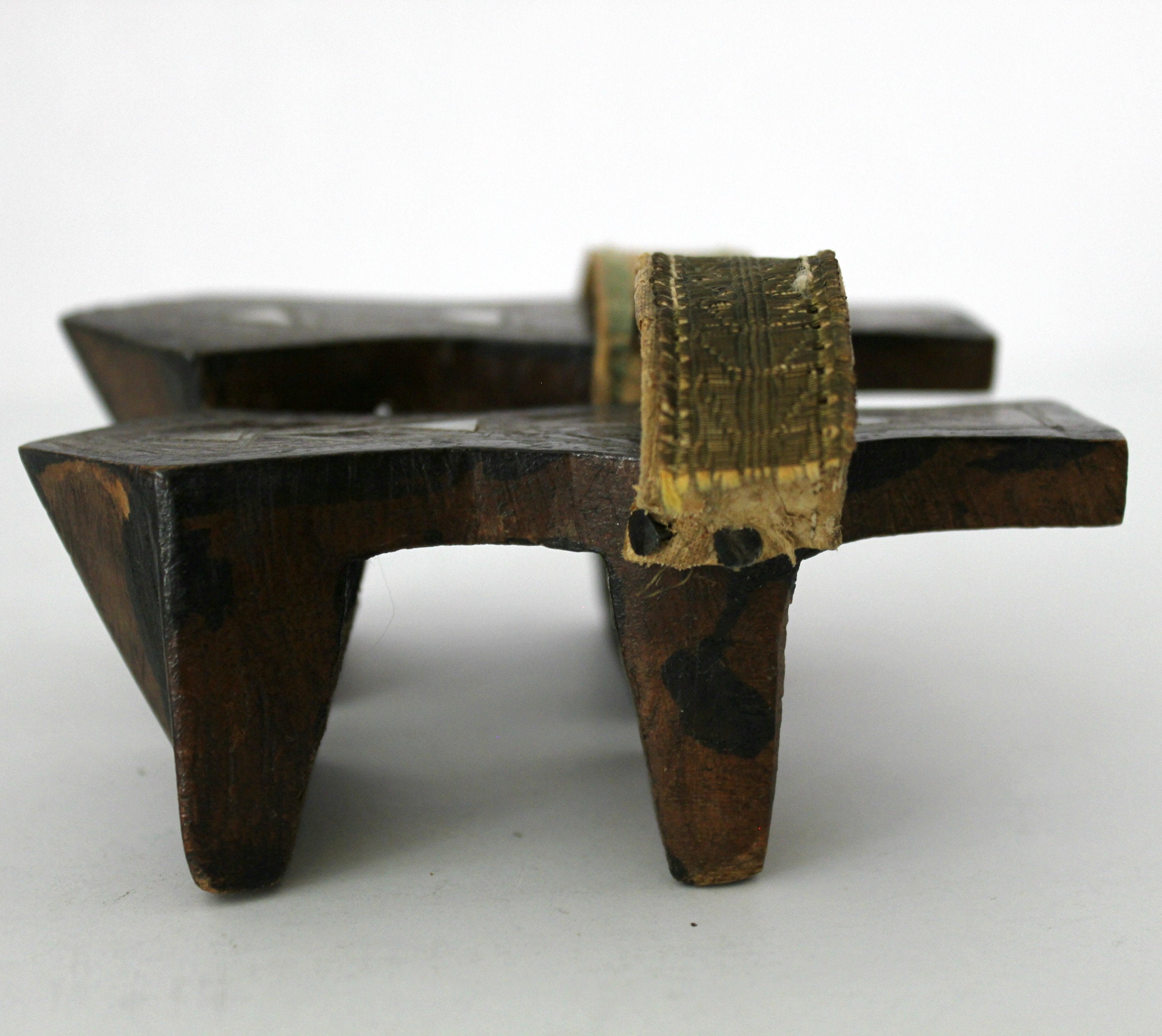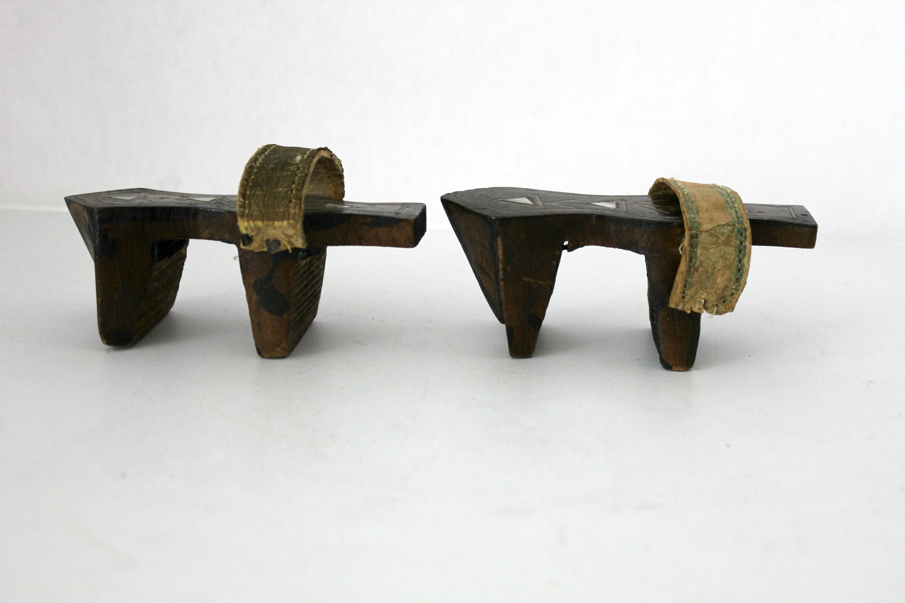 Both shoes have age and use signs. The strap on one has torn away from the nail and the outer strap covering is also missing. The other shoes strap is coming apart but is still attached at both sides. The triangle inlay looks like mother of pearl on the shoe tops.