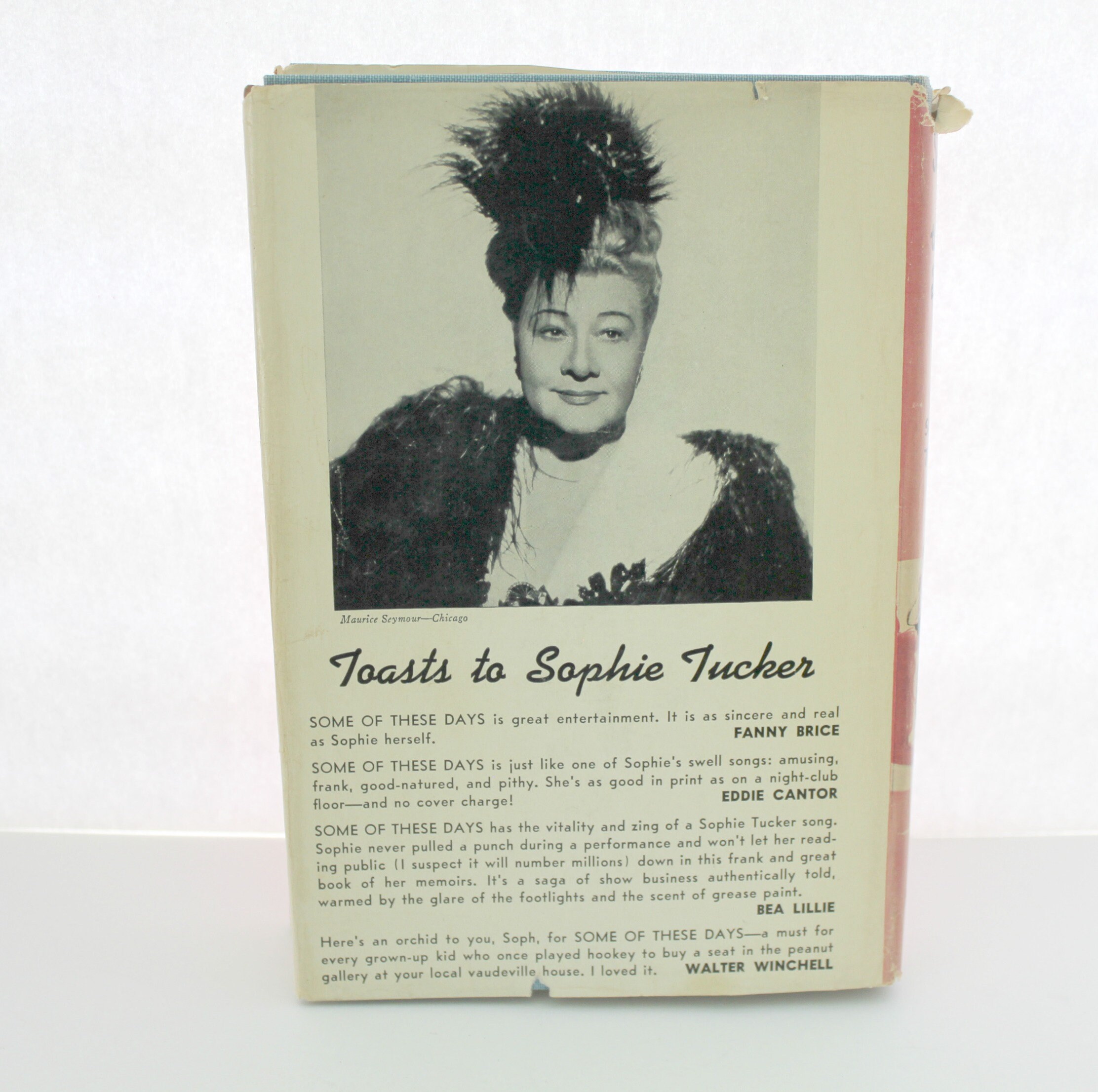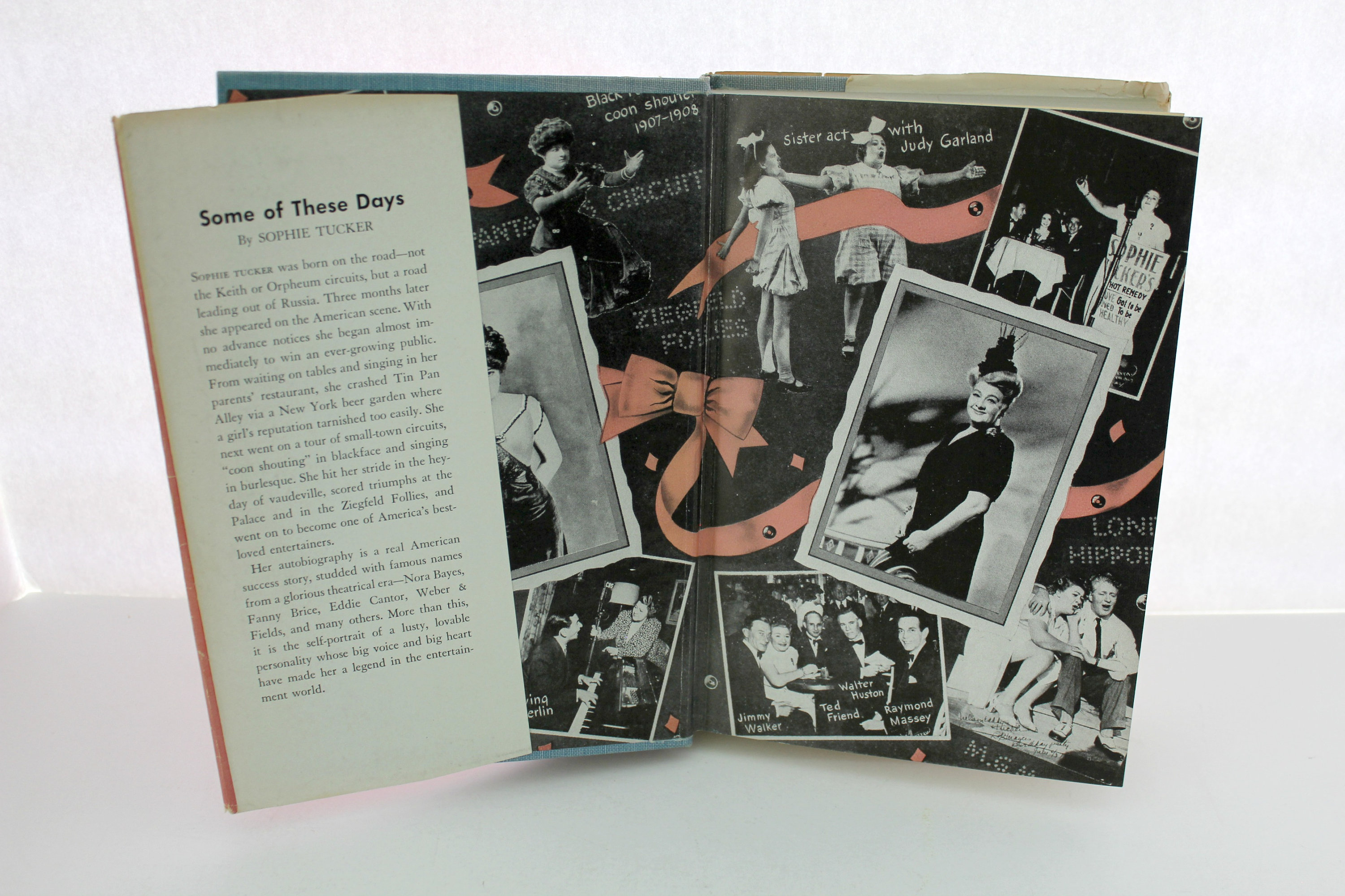 This is a signed hard back book titled Some of These Days - The Autobiography of Sophie Tucker with dust jacket. Copyright 1945. Signed by Sophie on July 3, 1954 on the dedication page. 309 pages.