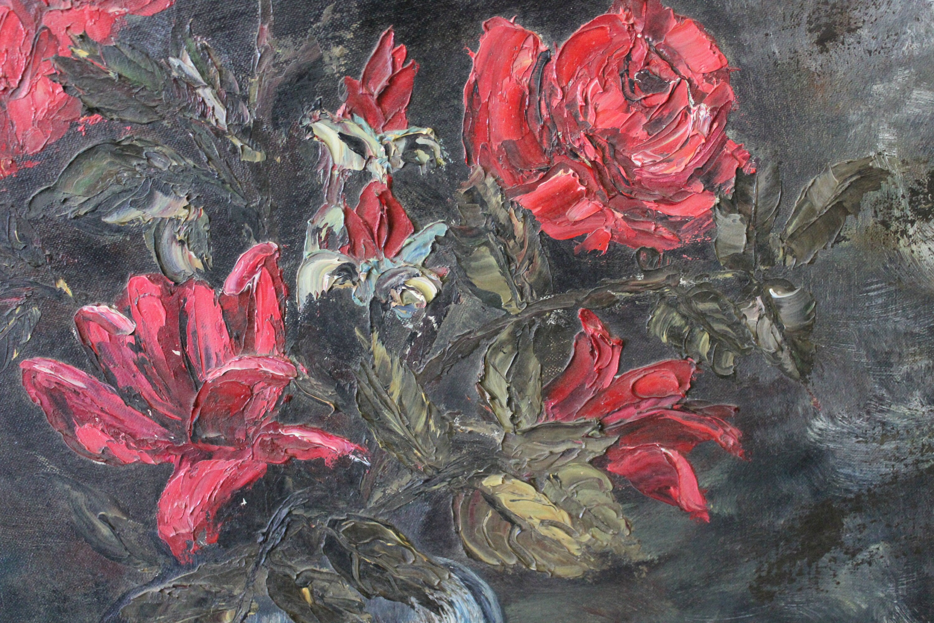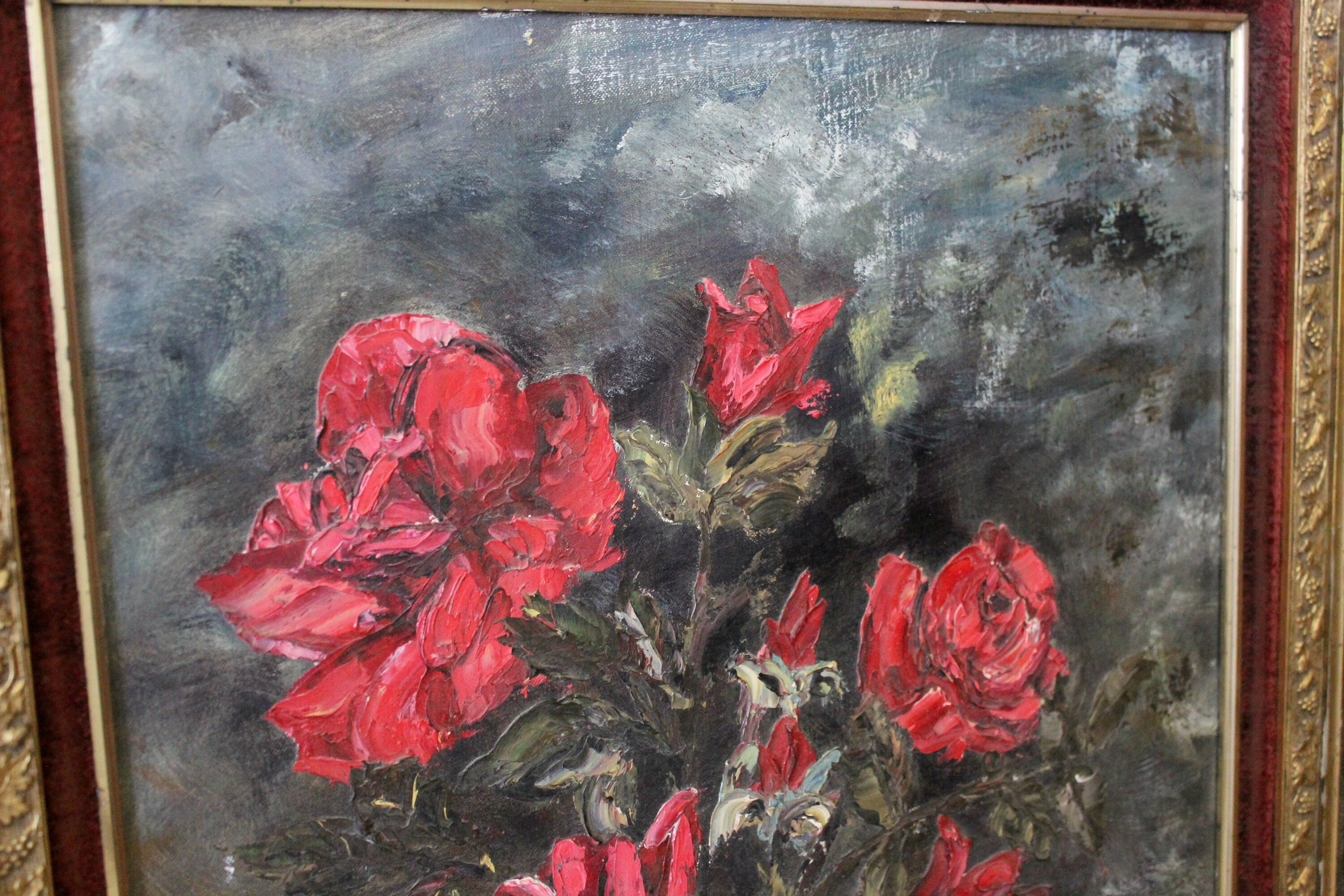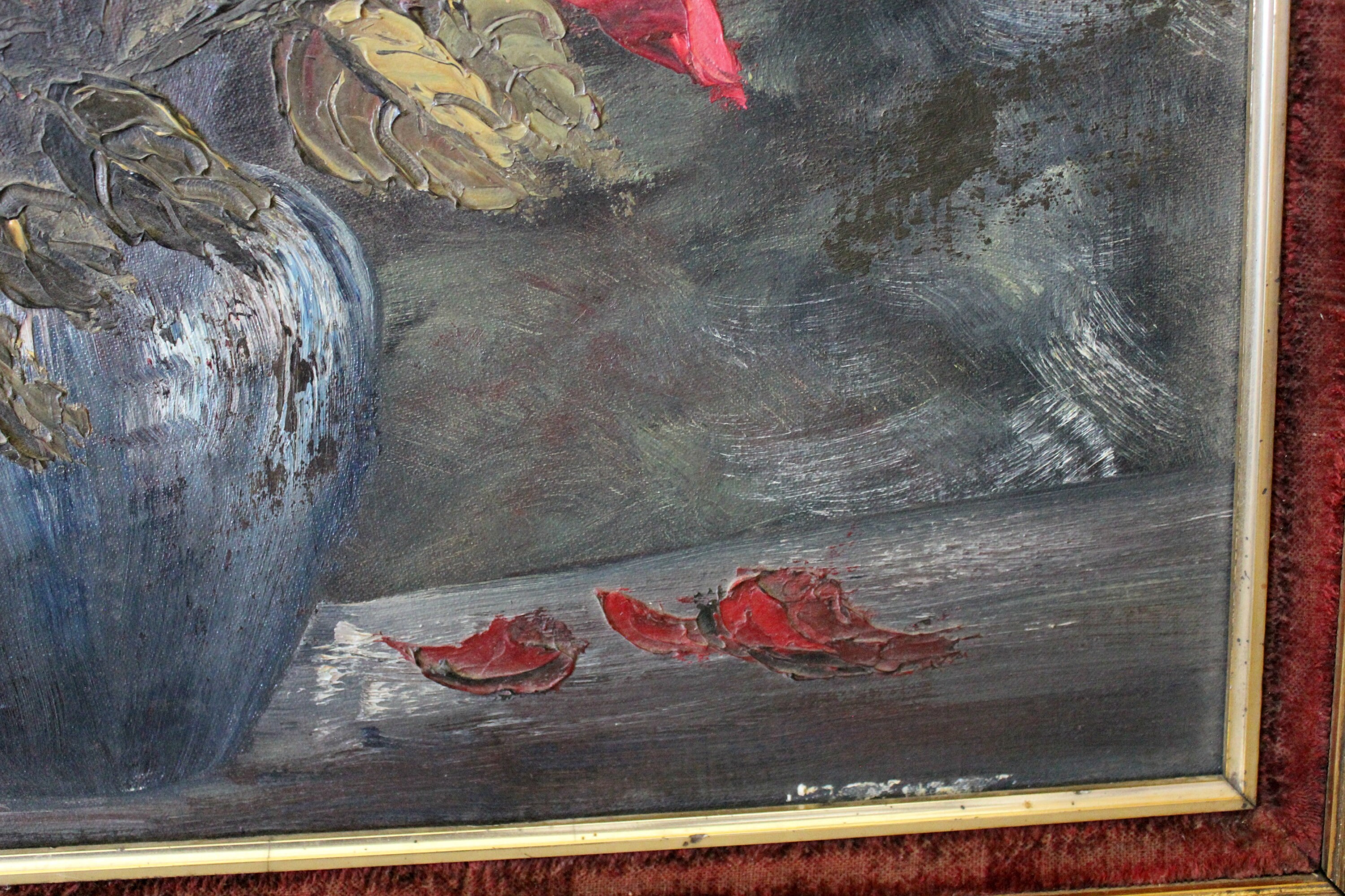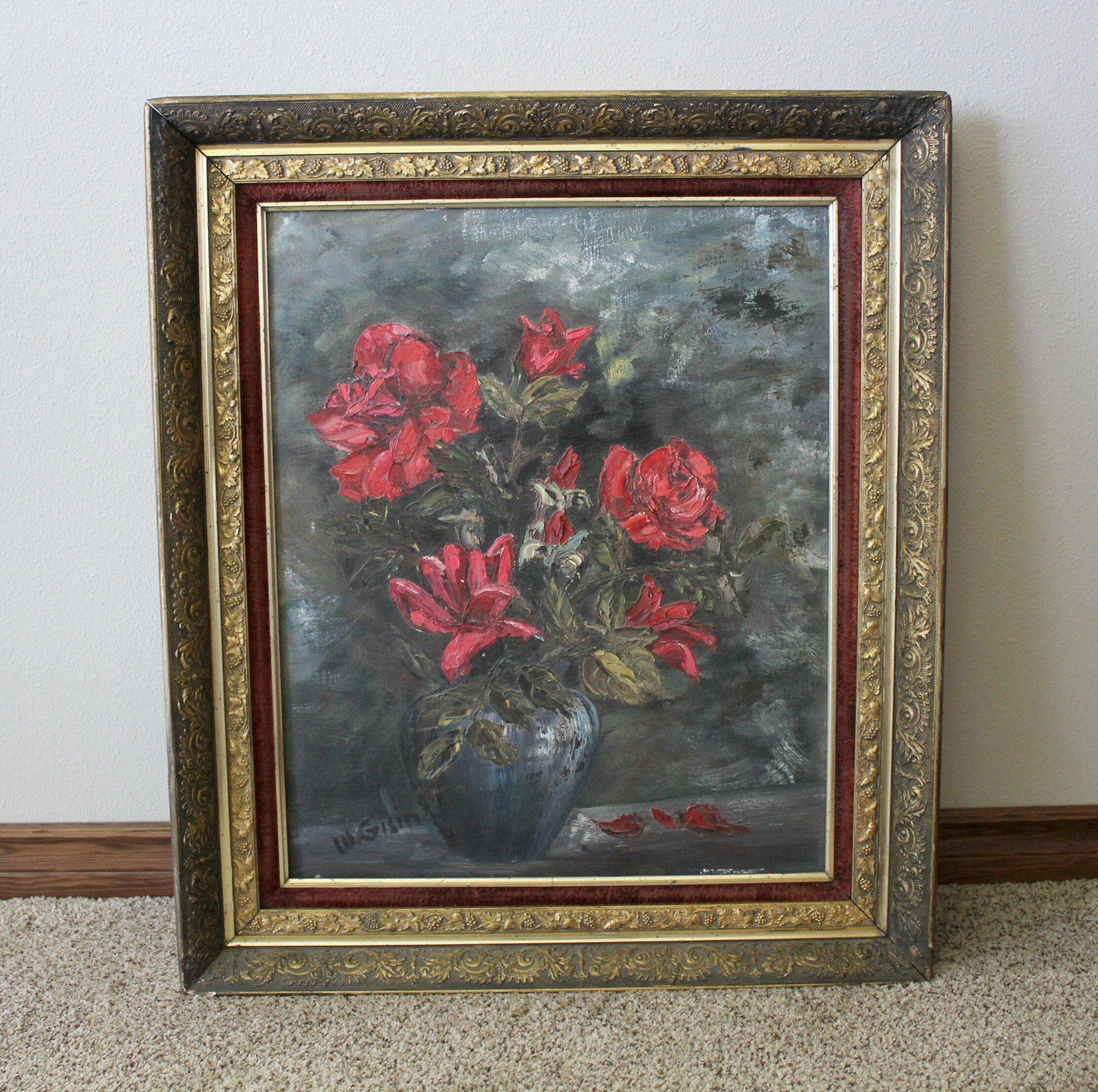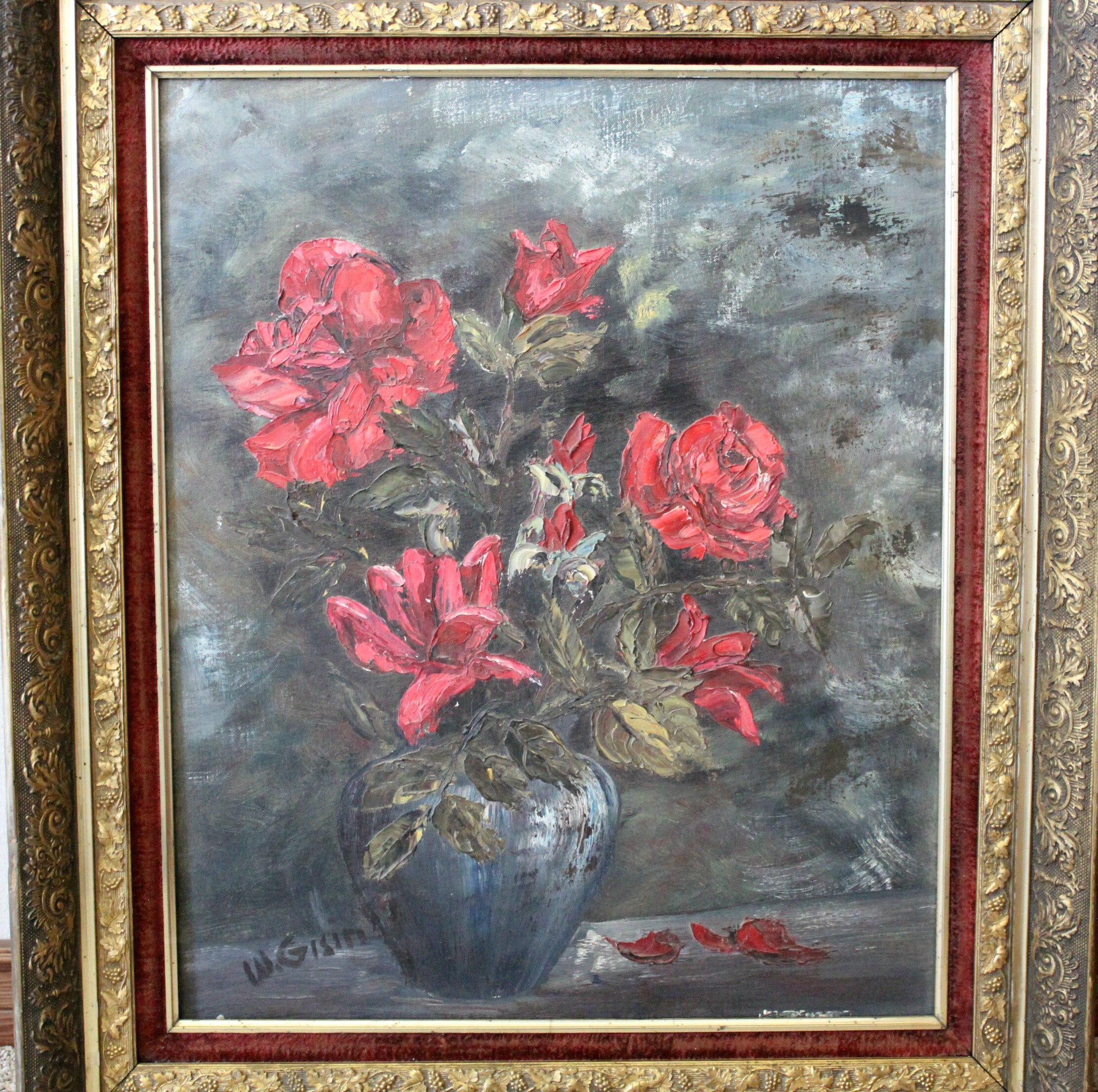 This is a vintage Willy Gisin original oil painting of a bouquet of red flowers with greenery in a blue vase. Signed by the artist in the lower left corner. Ornate gold gilded frame with red velvet inner border.