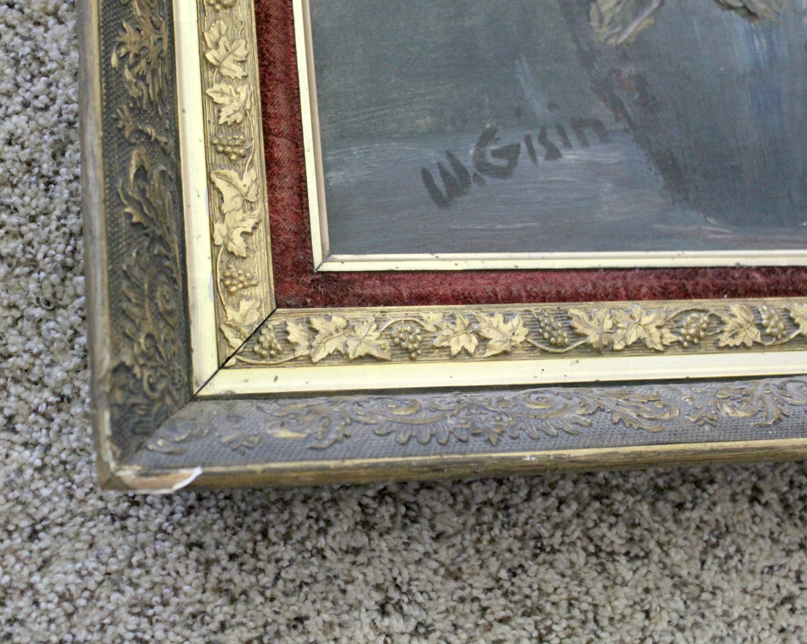 Condition: Nice for its age, with a few small areas of paint loss. Could use a good overall cleaning. Frame has wear, nicks and most noticeably a damaged lower left corner. Velvet like red material shows wear. Please view all photos carefully.