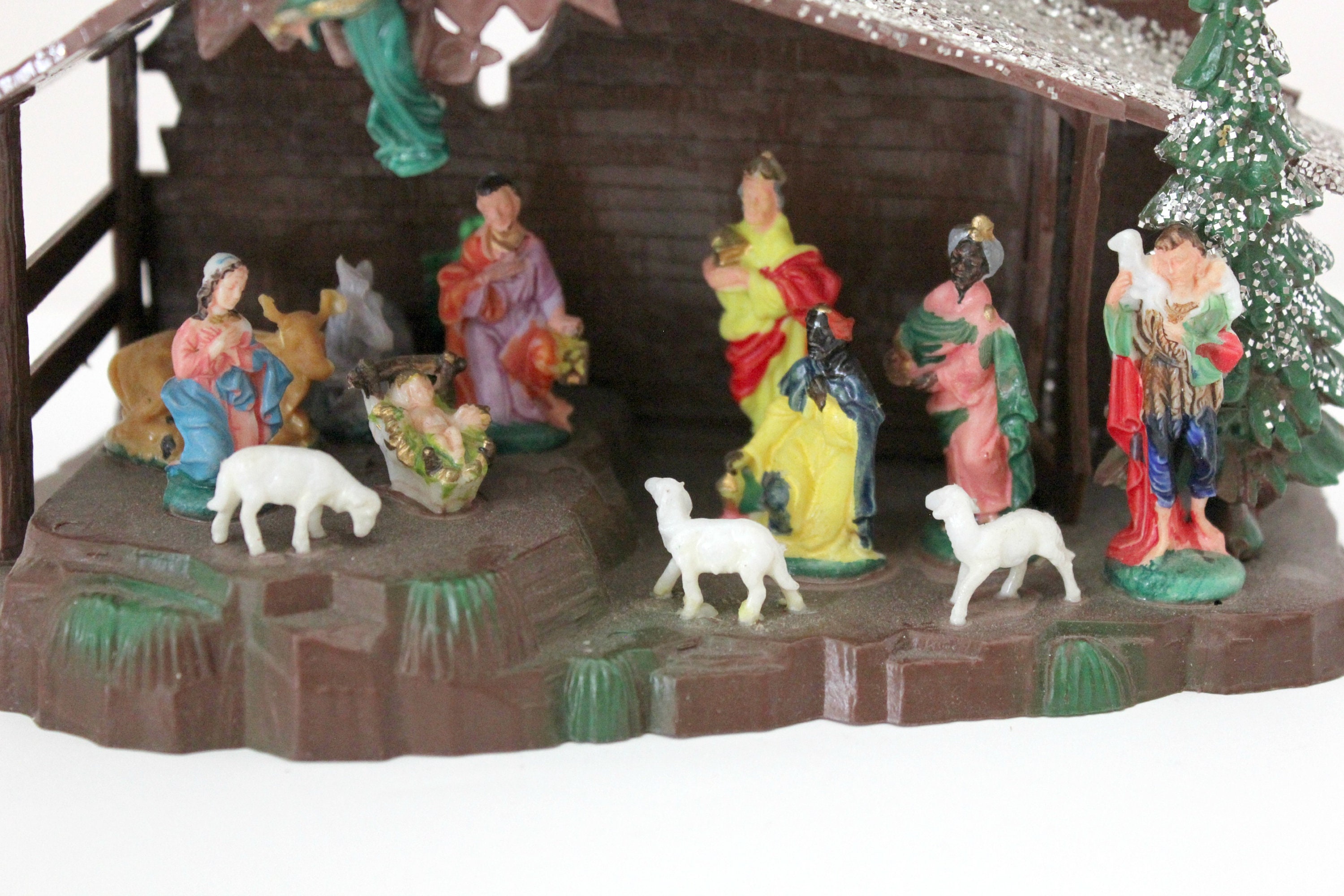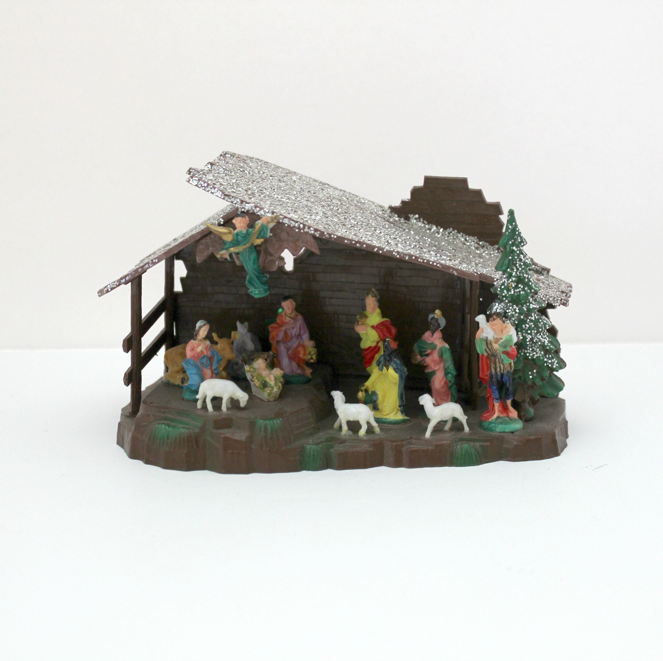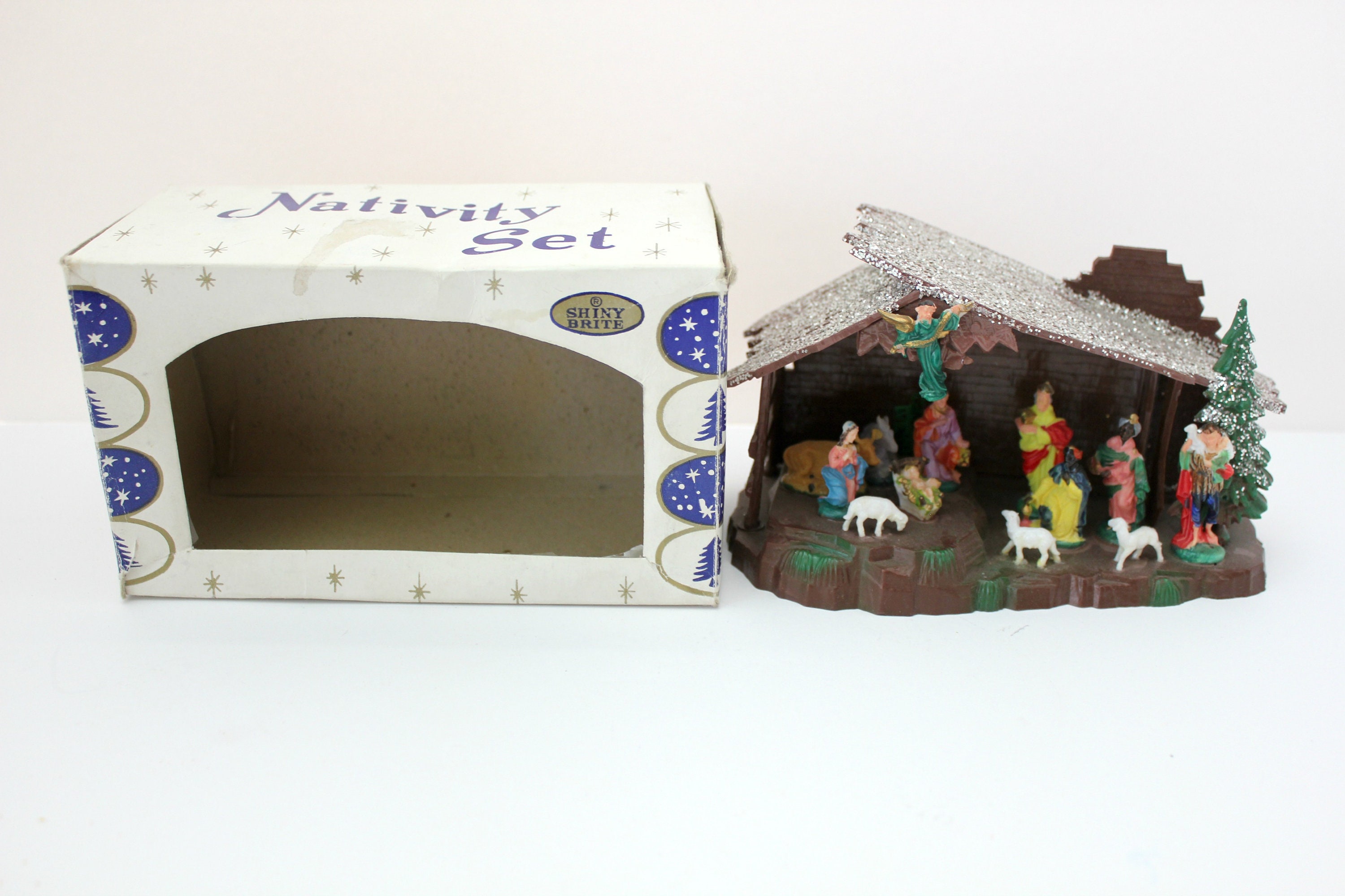 A nice miniature vintage Shiny Brite Nativity Set in box from about the 1970s, made in Hong Kong. It measures 6.5" x 3.5" x 3" and is made of plastic with glitter accent on the manger roof and tree. Figures are very detailed and include Mary, Joseph, Baby Jesus, the three kings, shepherd and several animals.