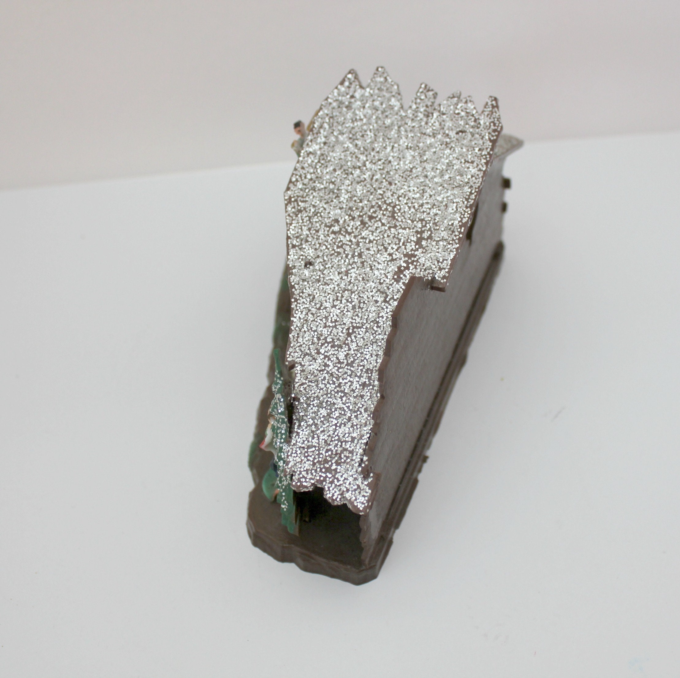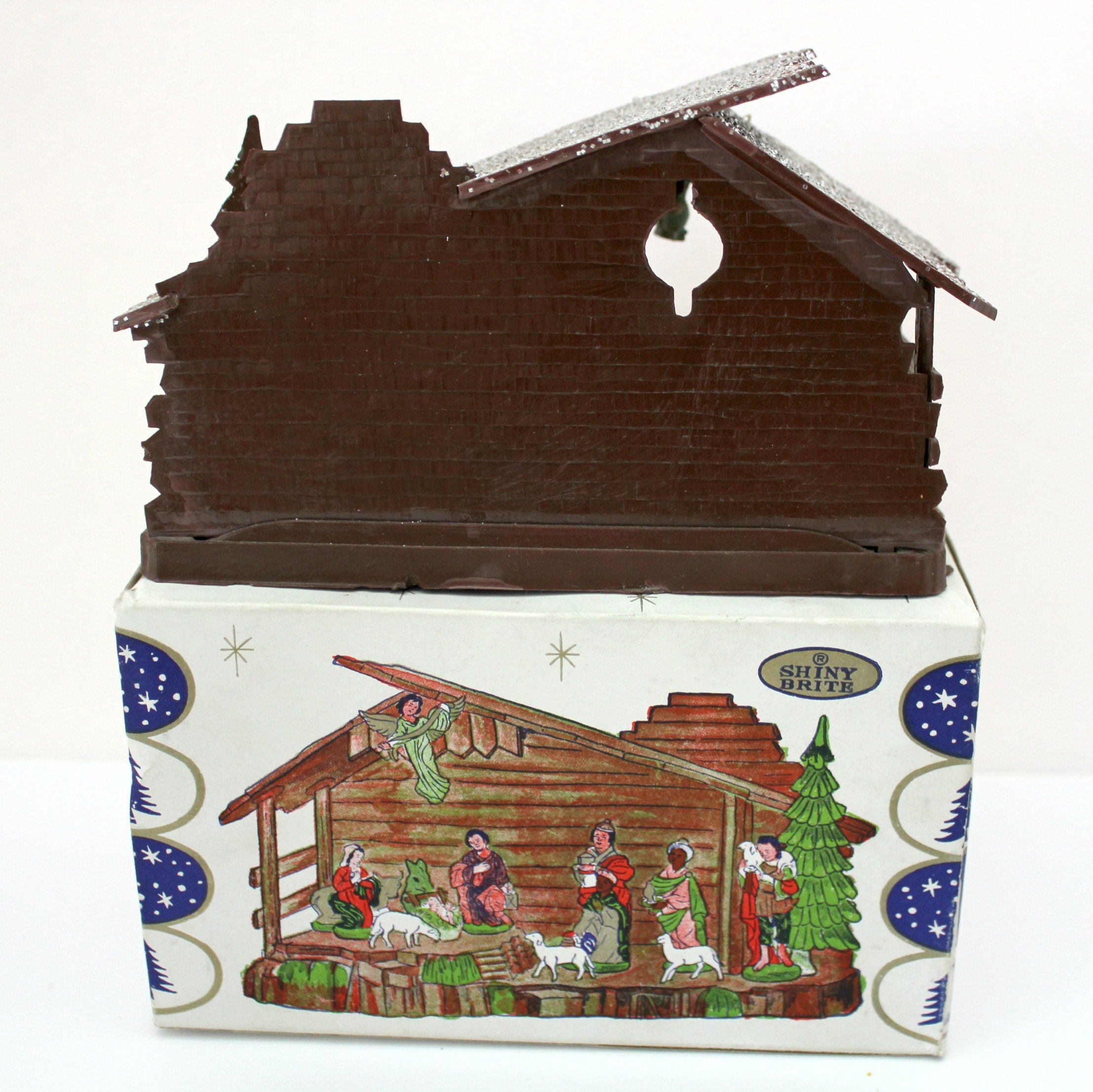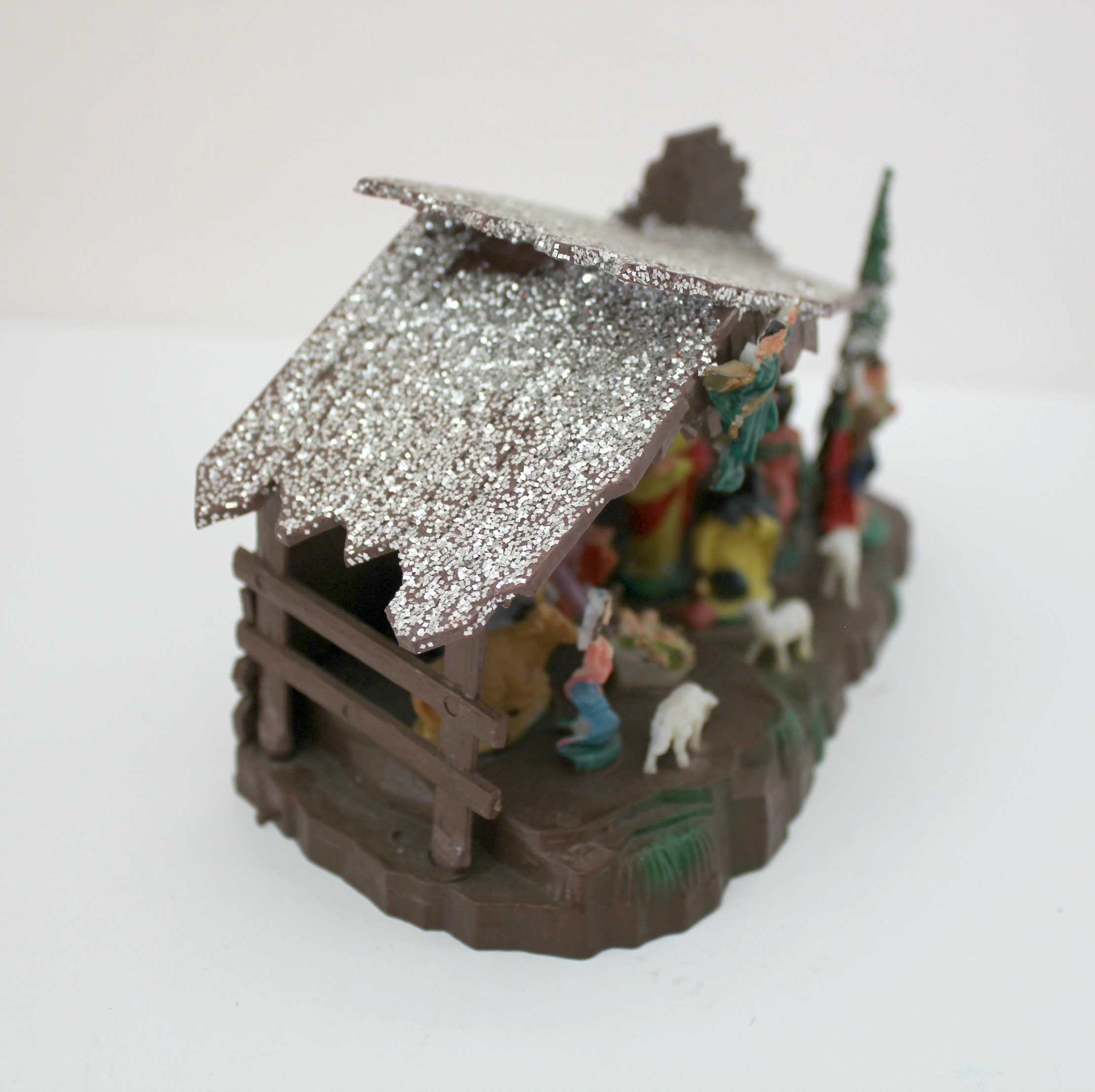 A nice miniature vintage Shiny Brite Nativity Set in box from about the 1970s, made in Hong Kong. It measures 6.5" x 3.5" x 3" and is made of plastic with glitter accent on the manger roof and tree. Figures are very detailed and include Mary, Joseph, Baby Jesus, the three kings, shepherd and several animals.