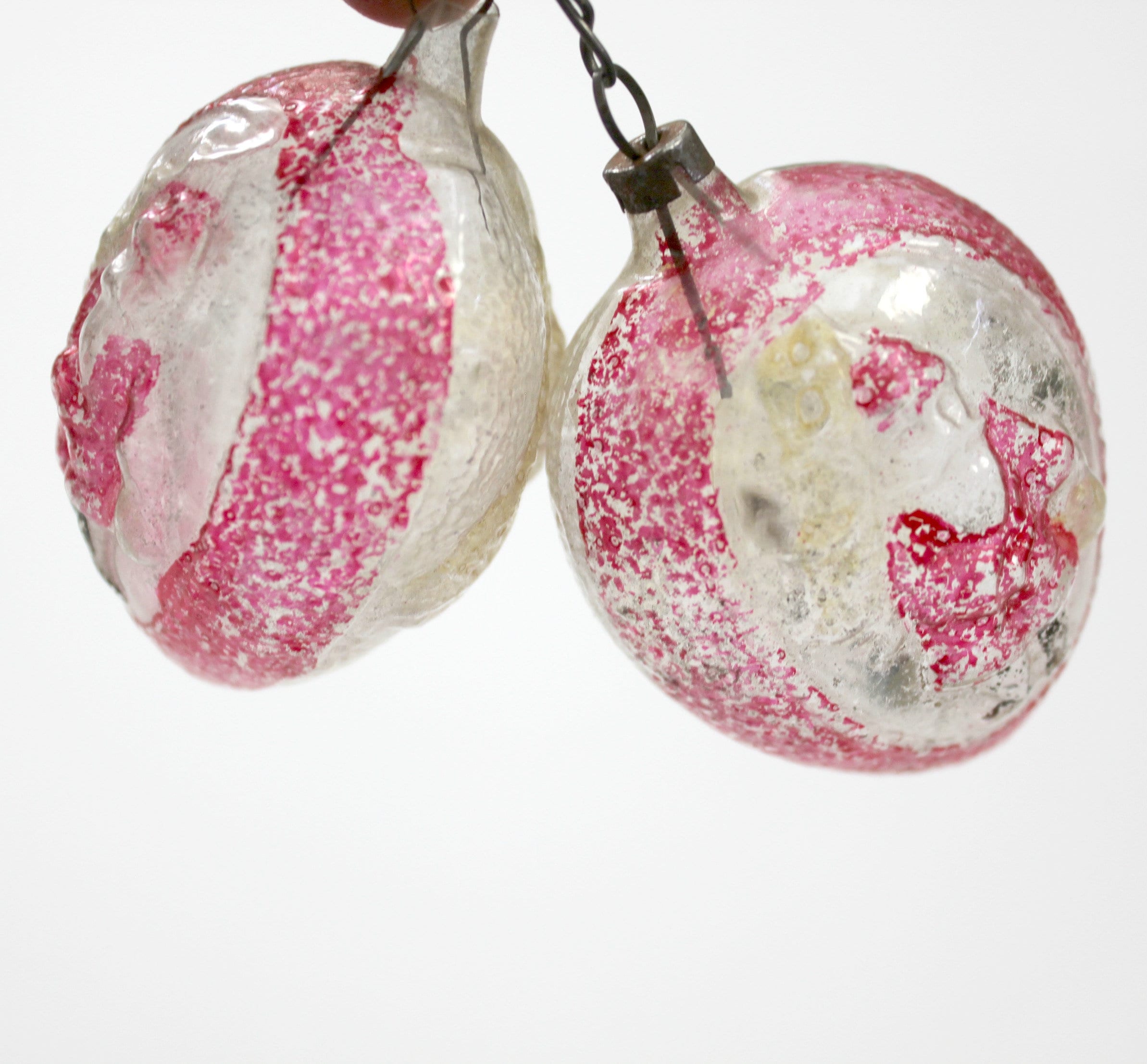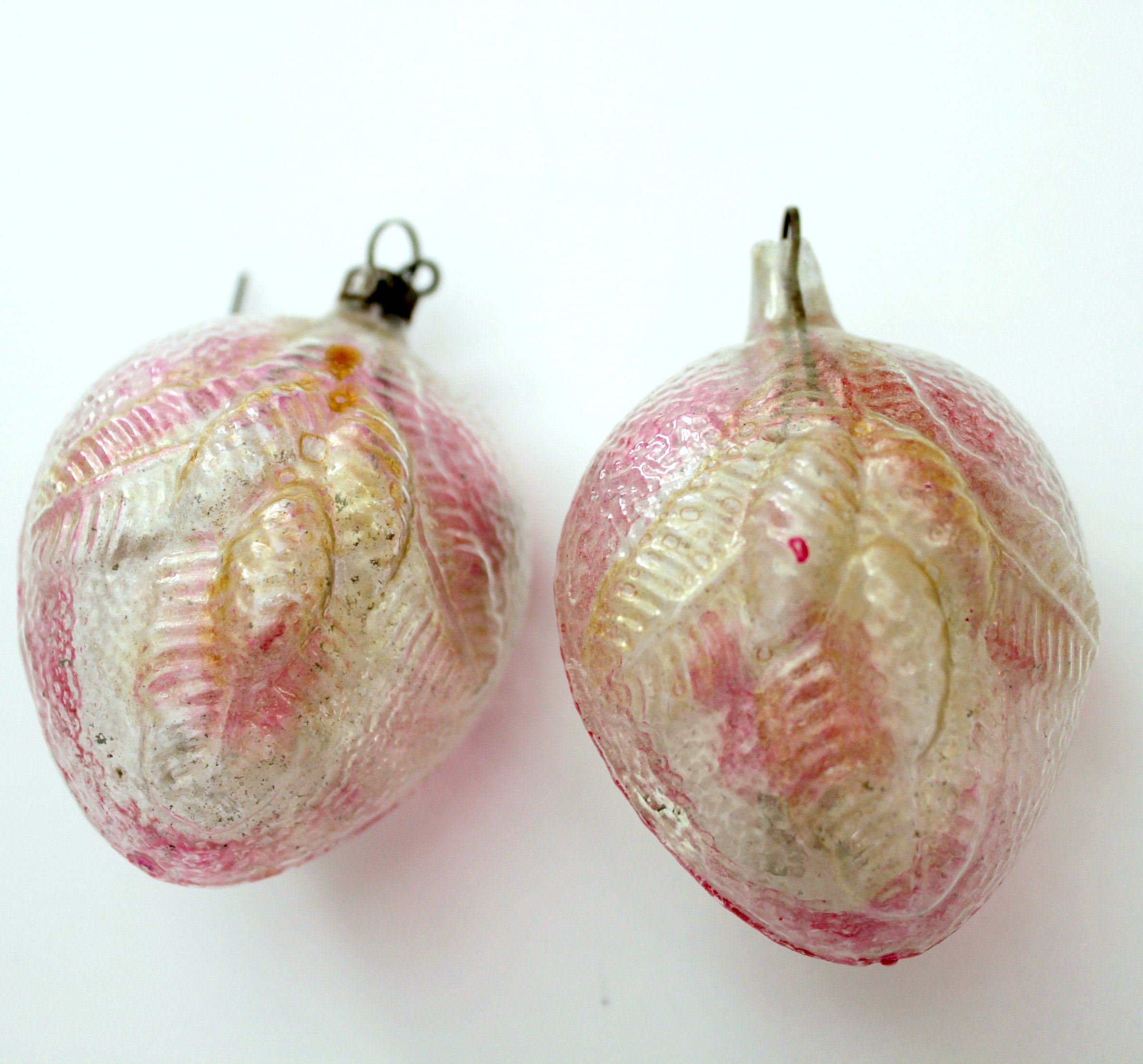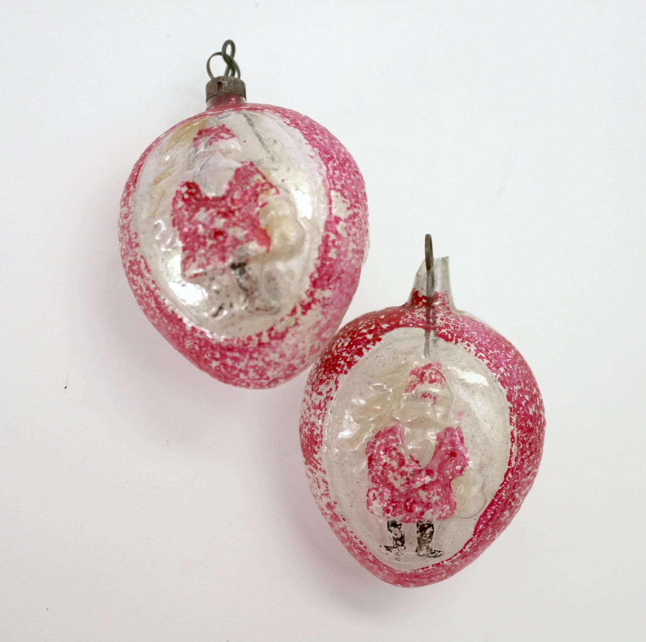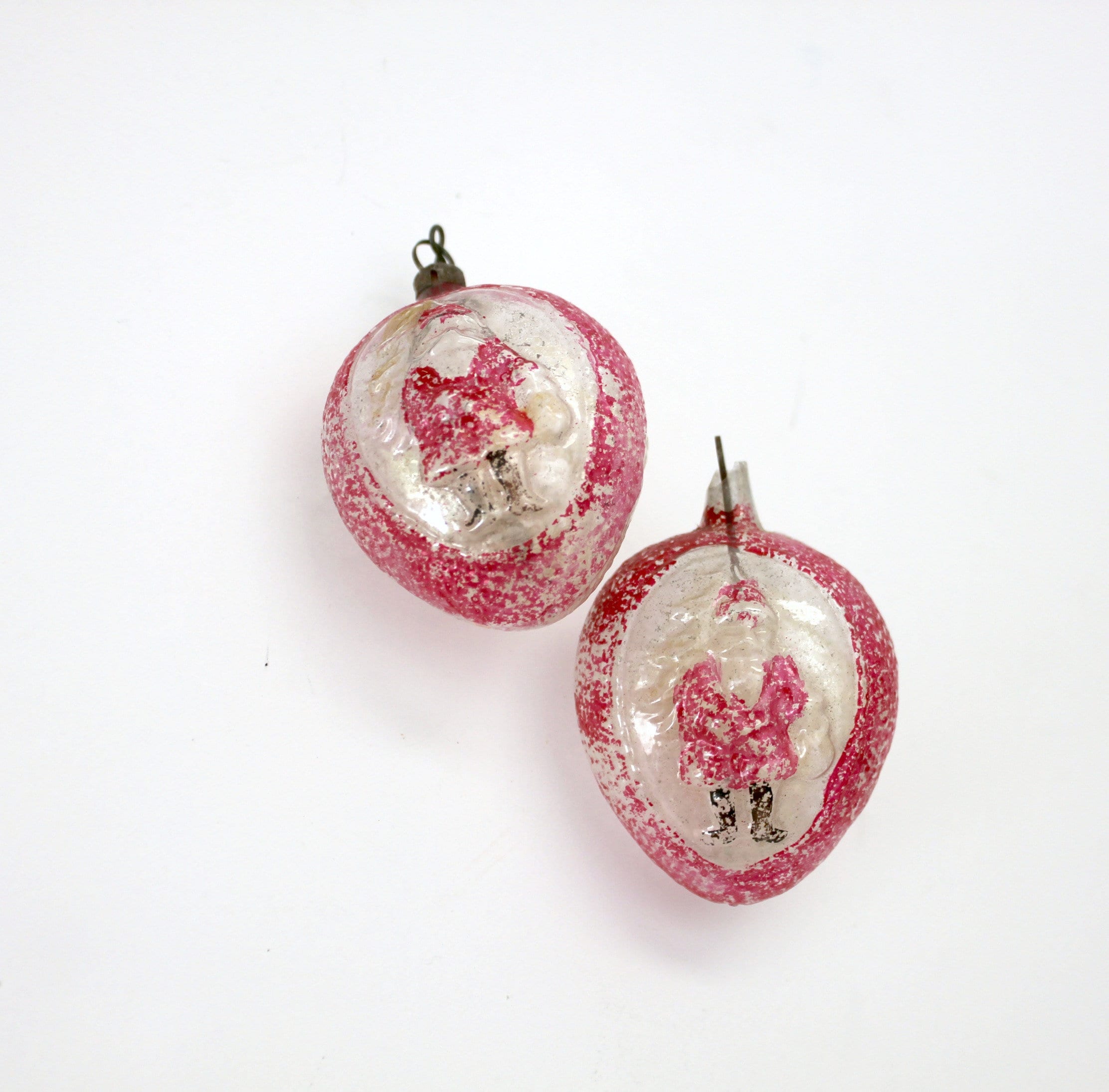 A vintage Lot of 2 glass ornaments with a Belsnickel Santa and acorn on the sides of the mostly red and clear ornaments for your Christmas tree. They are 2.5" tall egg shaped with raised detailing on both sides.