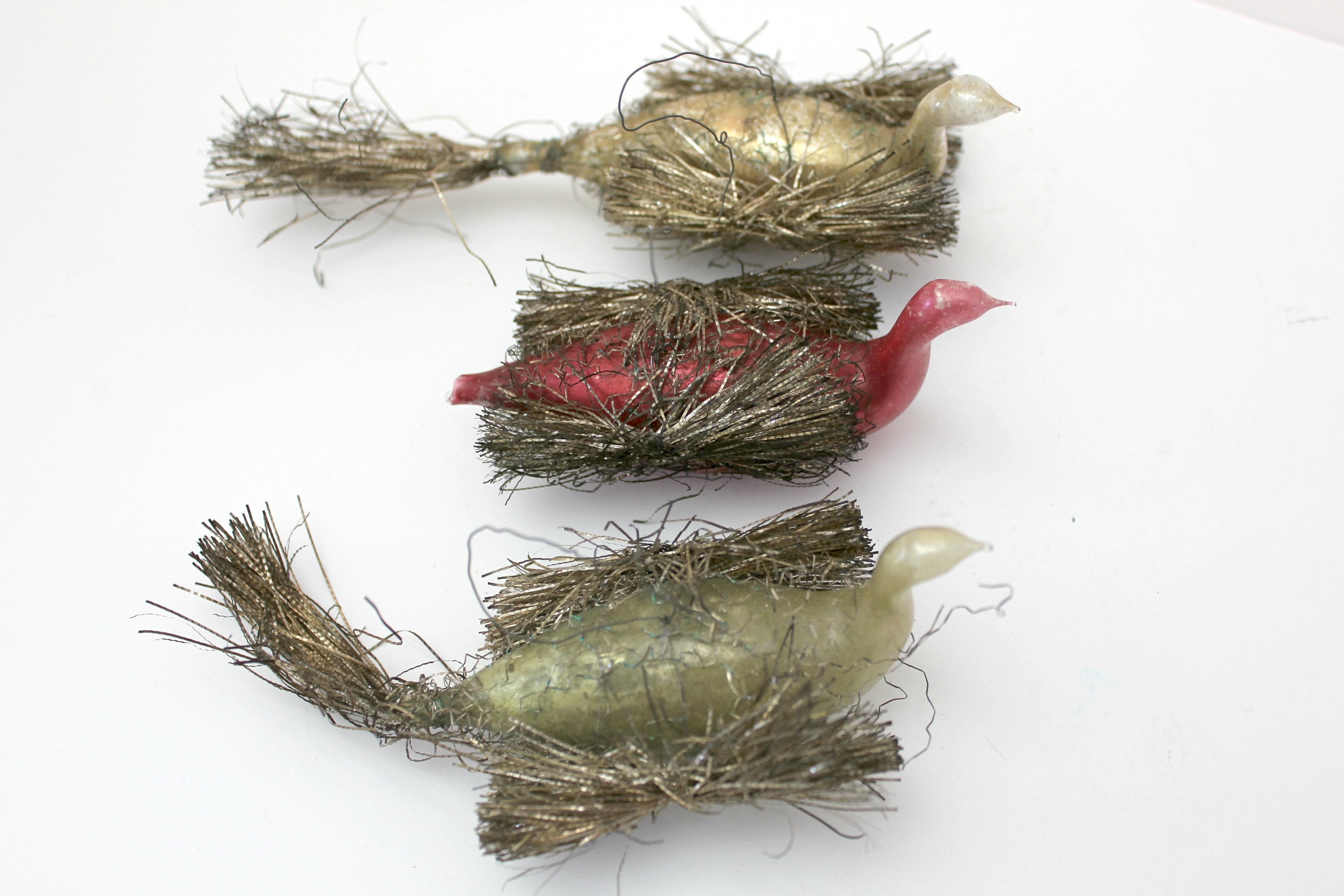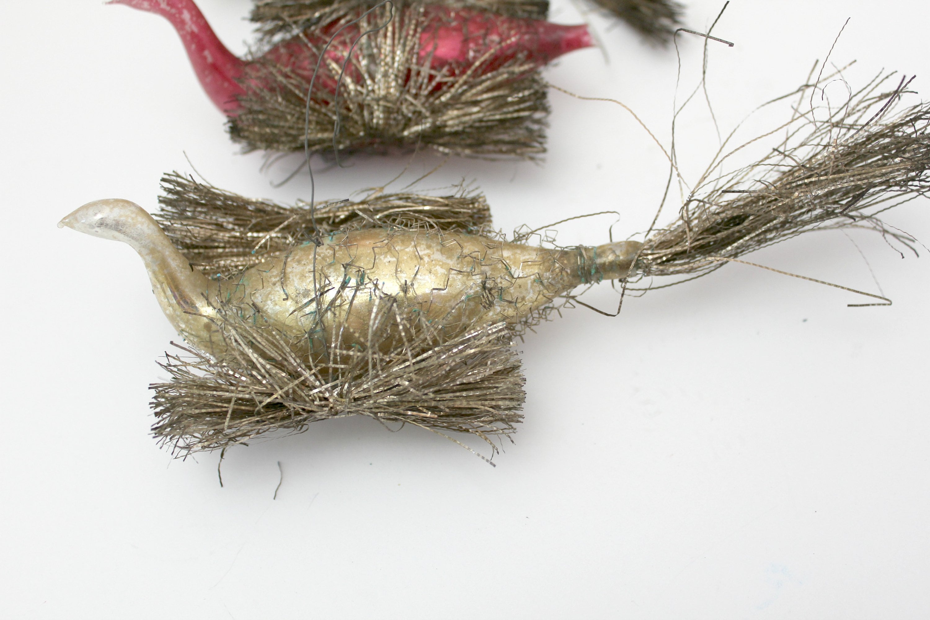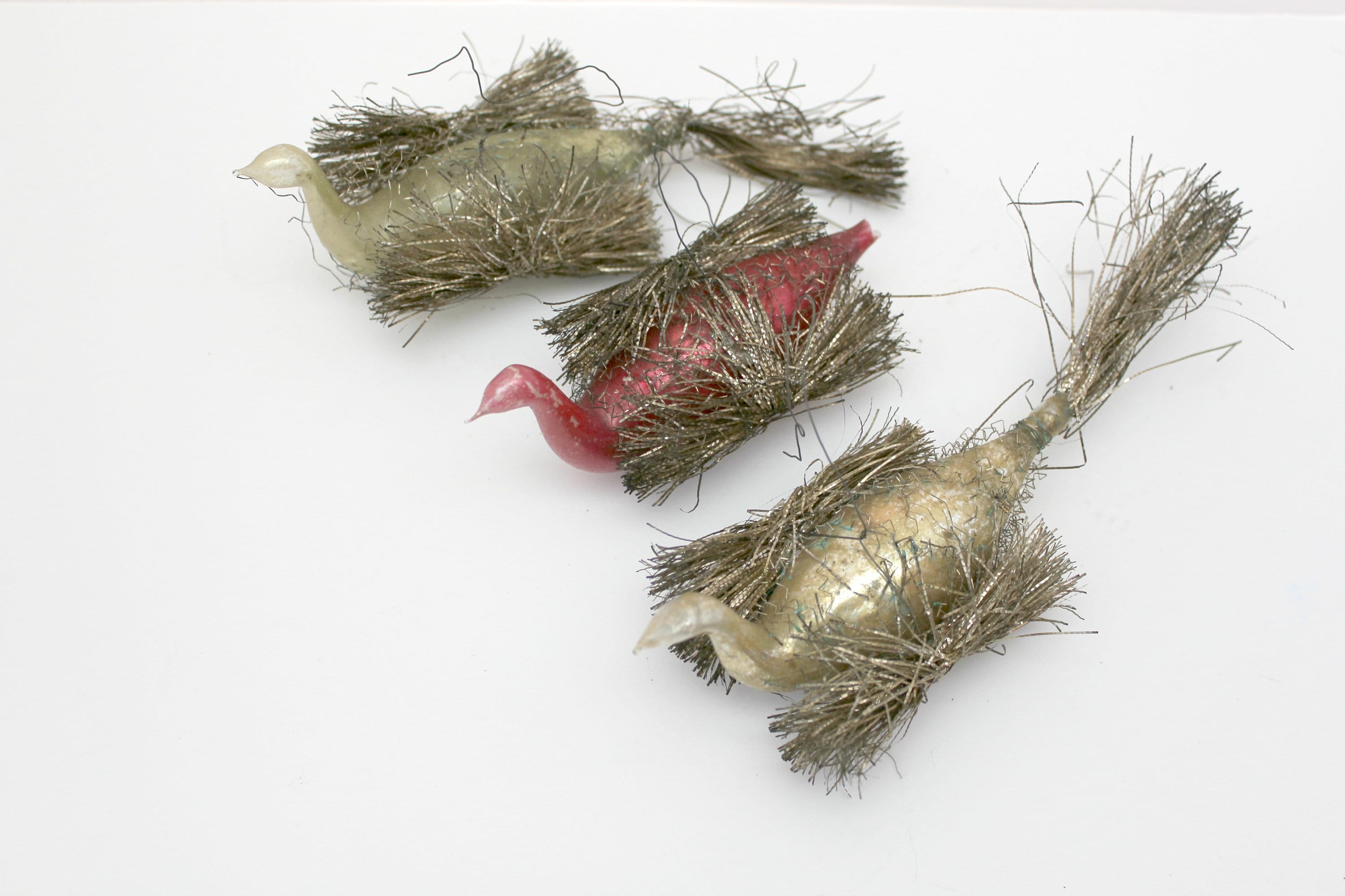 An antique lot of 3 wire wrapped swan glass Christmas tree ornaments from around 1900. The two birds with tails are about 6.5" long and the red one with it missing is 4" long.