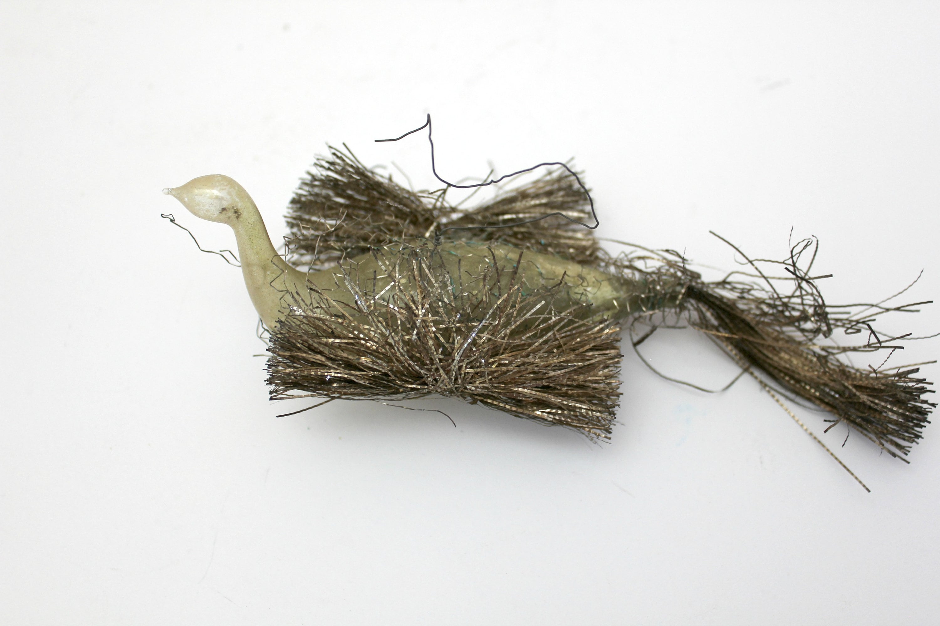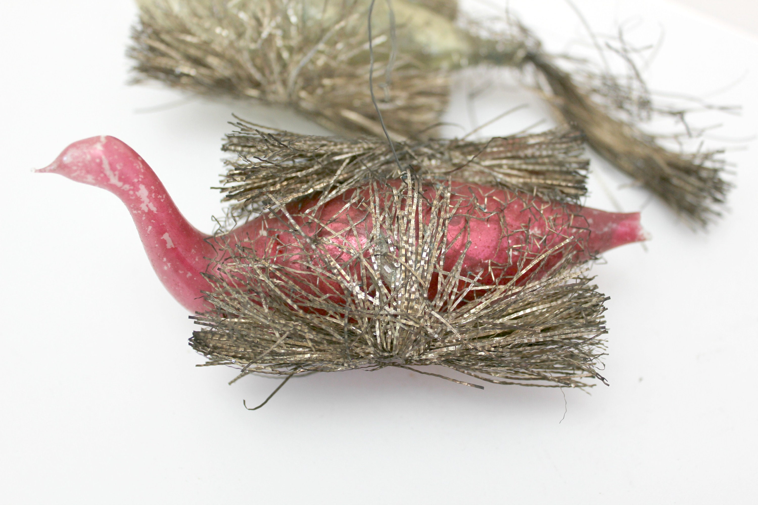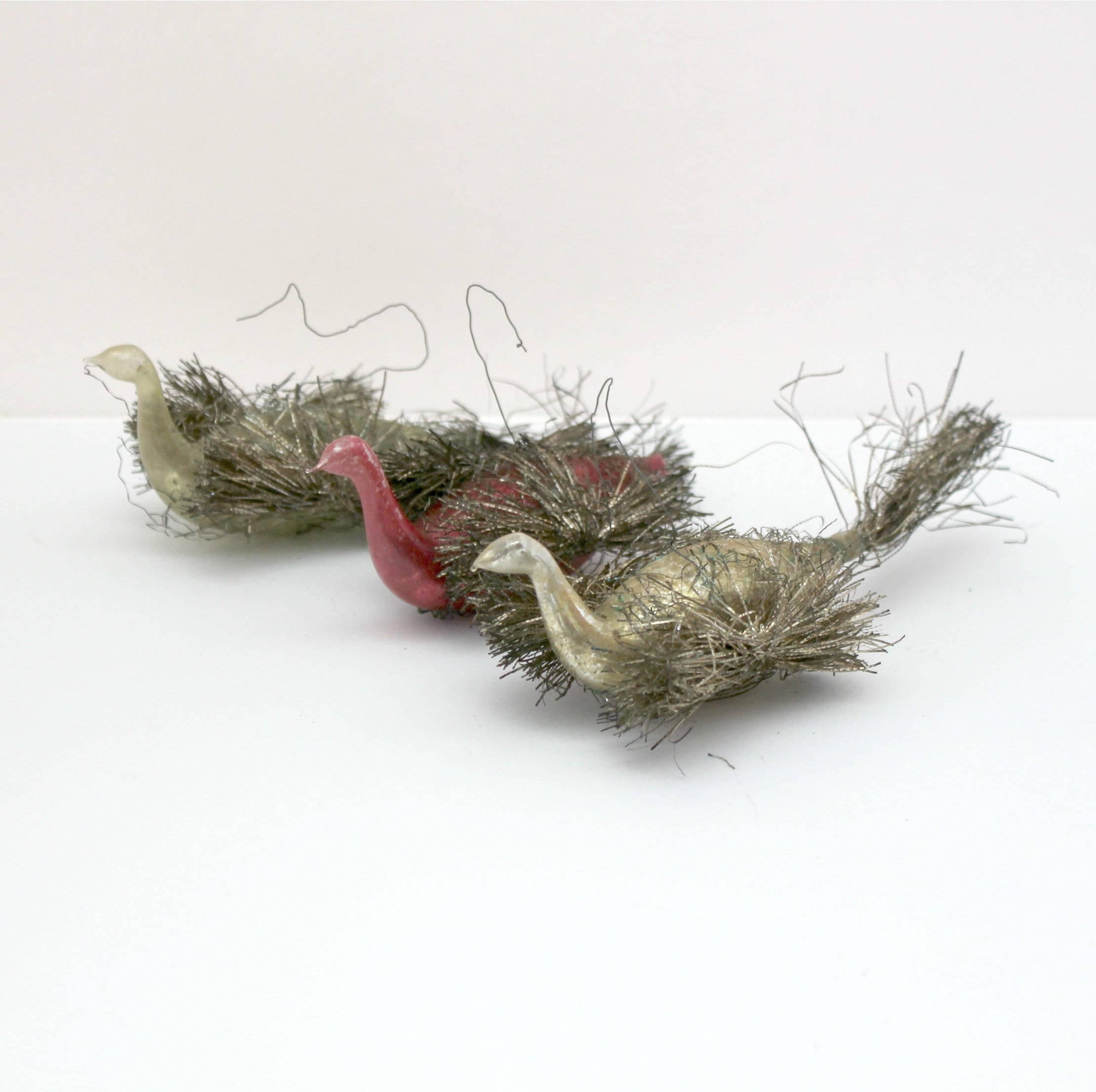 An antique lot of 3 wire wrapped swan glass Christmas tree ornaments from around 1900. The two birds with tails are about 6.5" long and the red one with it missing is 4" long.