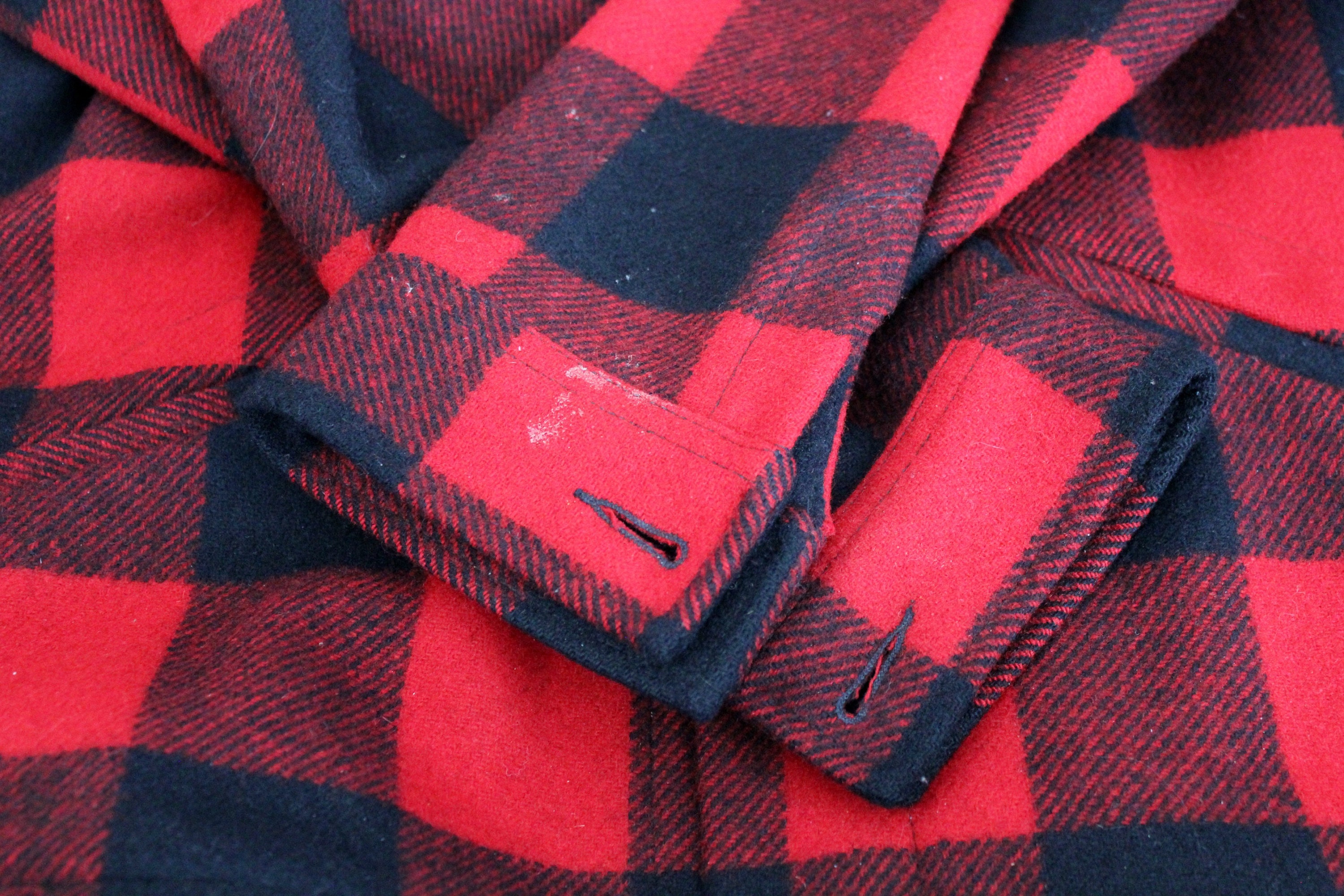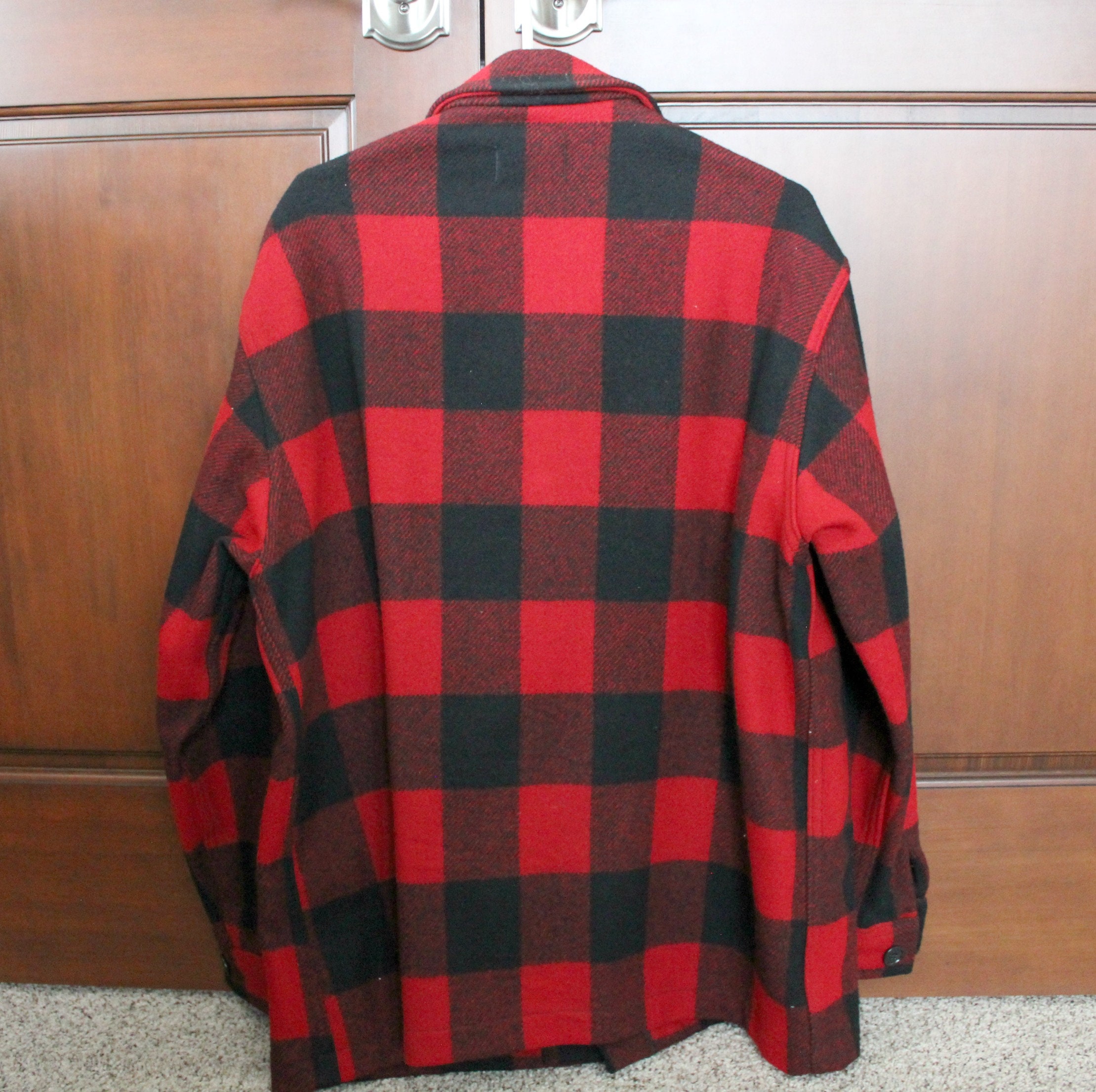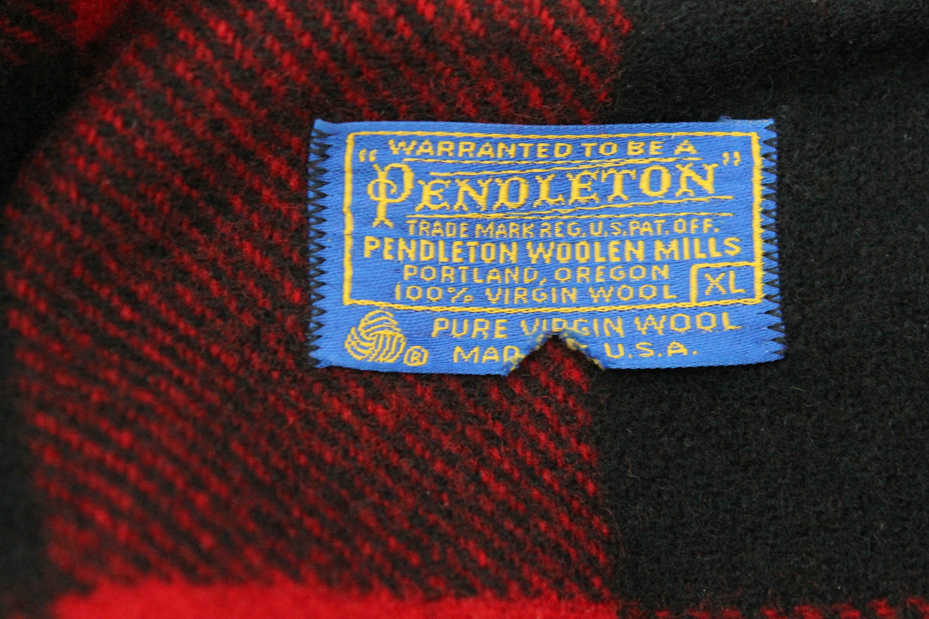 A nice vintage 1960s men's Pendleton wool black and white plaid or buffalo check jacket. This coat buttons up the front, has a 4 pocket front with the two on the chest being a snap flap. Button cuffs. It is not lined and made of 100% wool in a size XL.