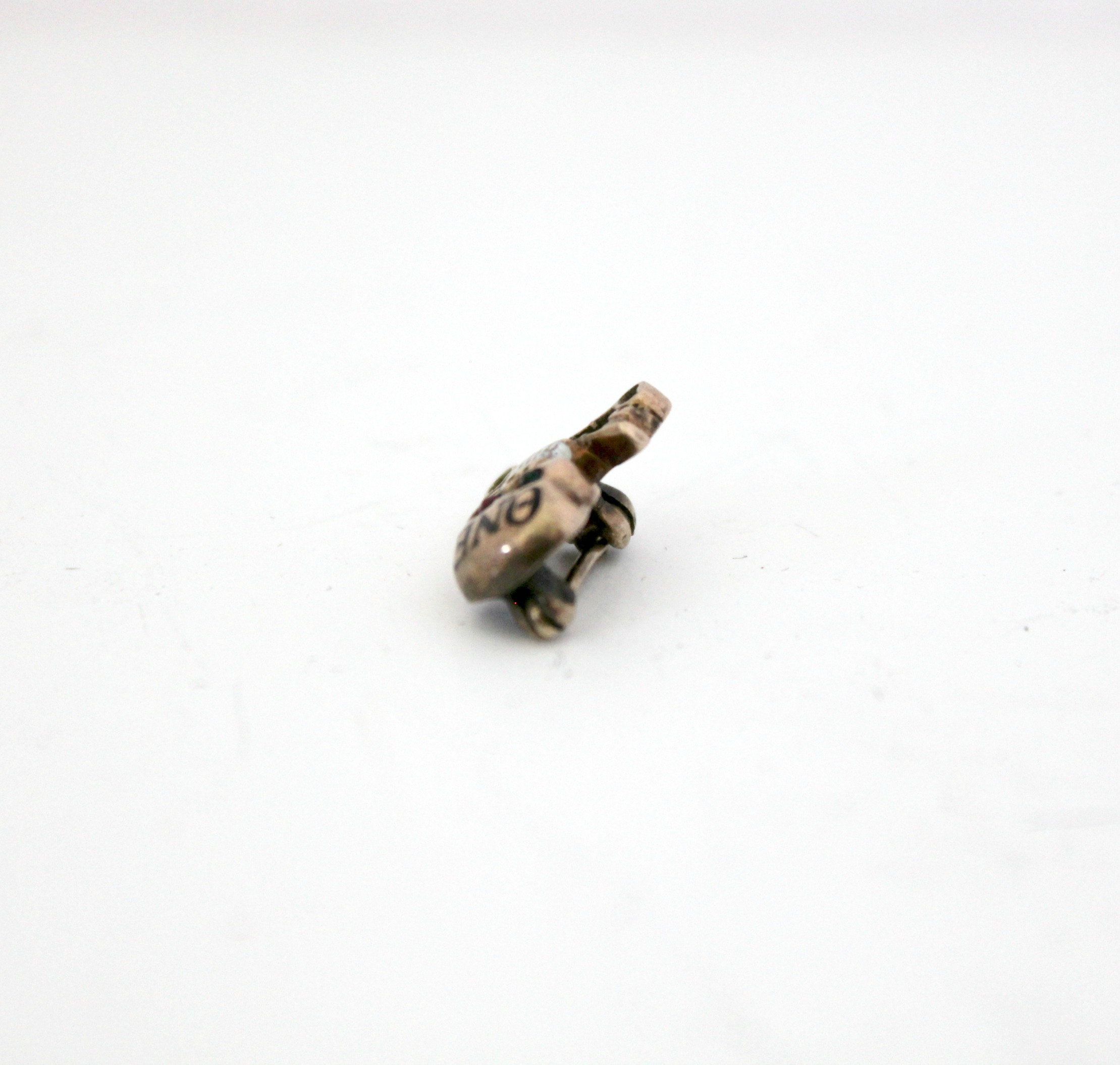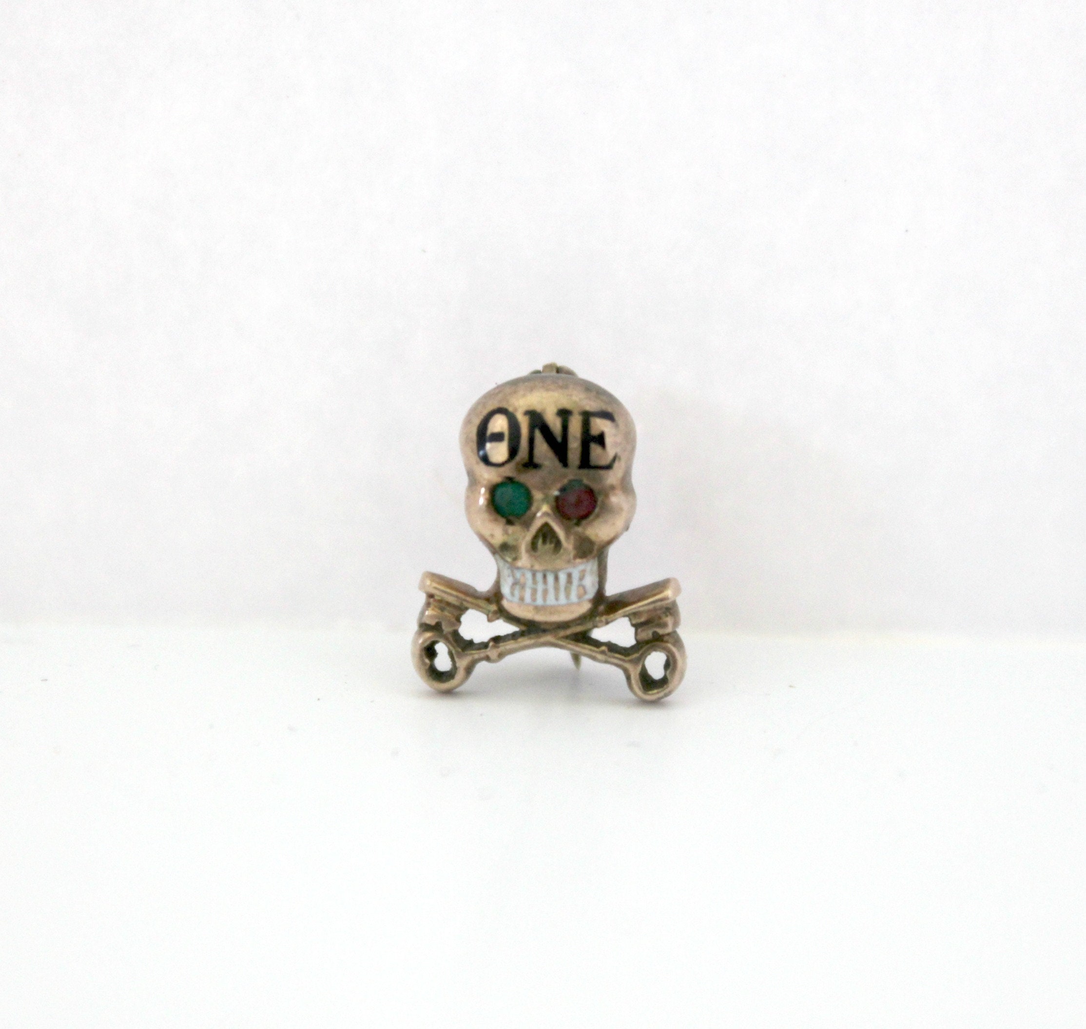 This is a tiny vintage Theta Nu Epsilon skull with crossed keys fraternity pin. Marked 10K on the back. Gold with Greek letters on the head, one red and one green eye most likely made of glass, white enamel teeth, and the crossed keys below the skull.