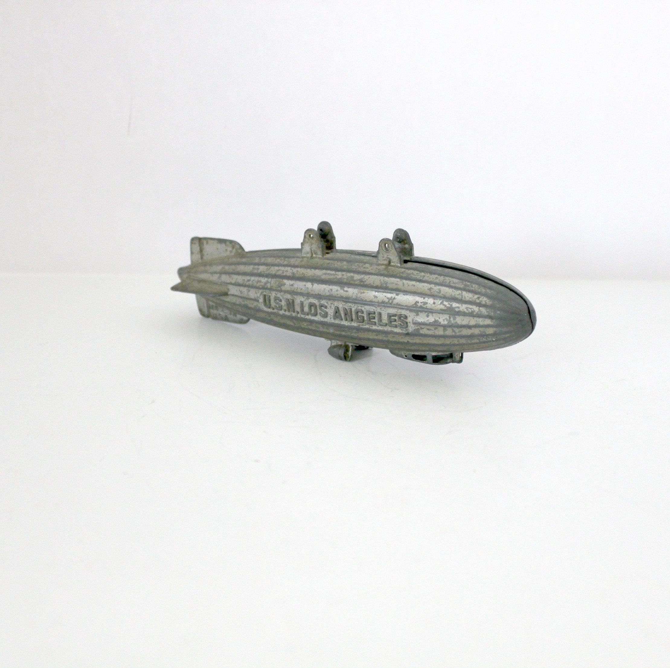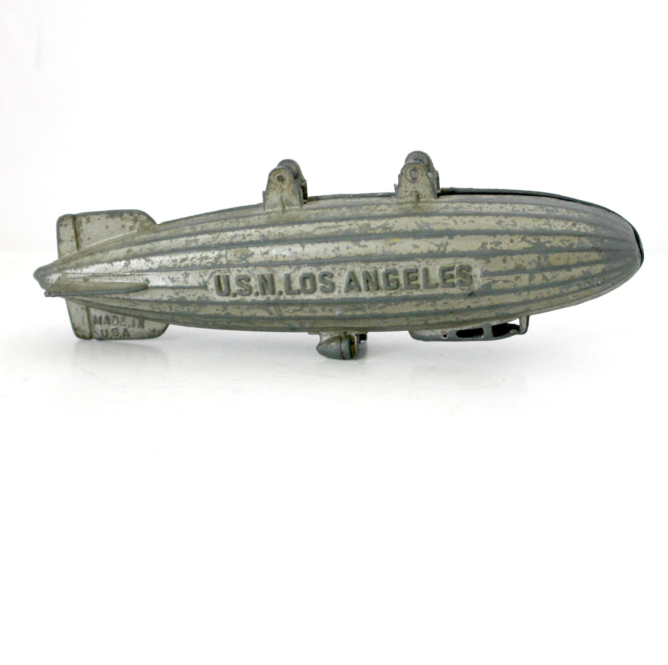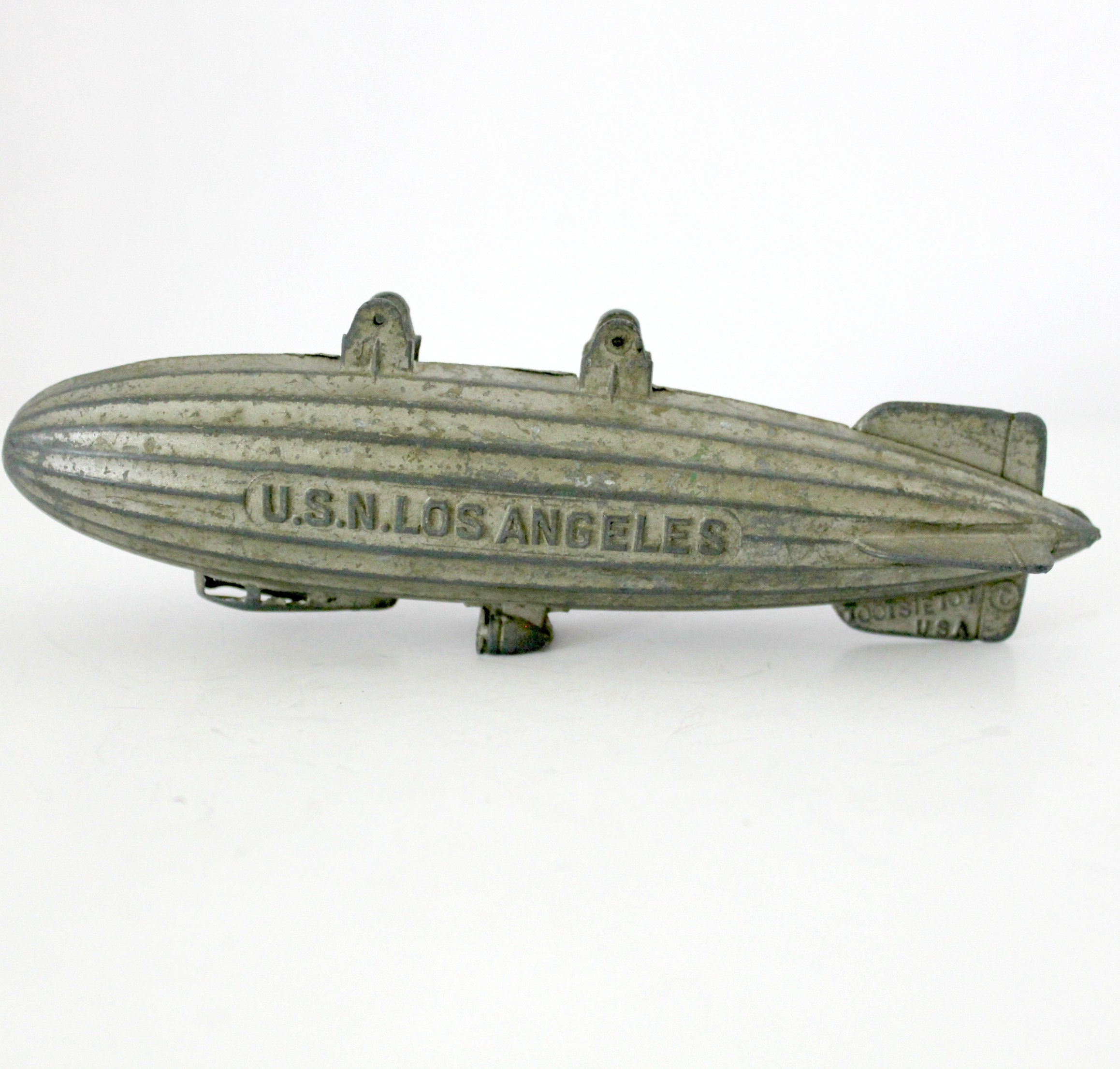 This is a 1930s vintage Tootsie Toy USN Los Angeles metal blimp or zeppelin. United States Navy aircraft.