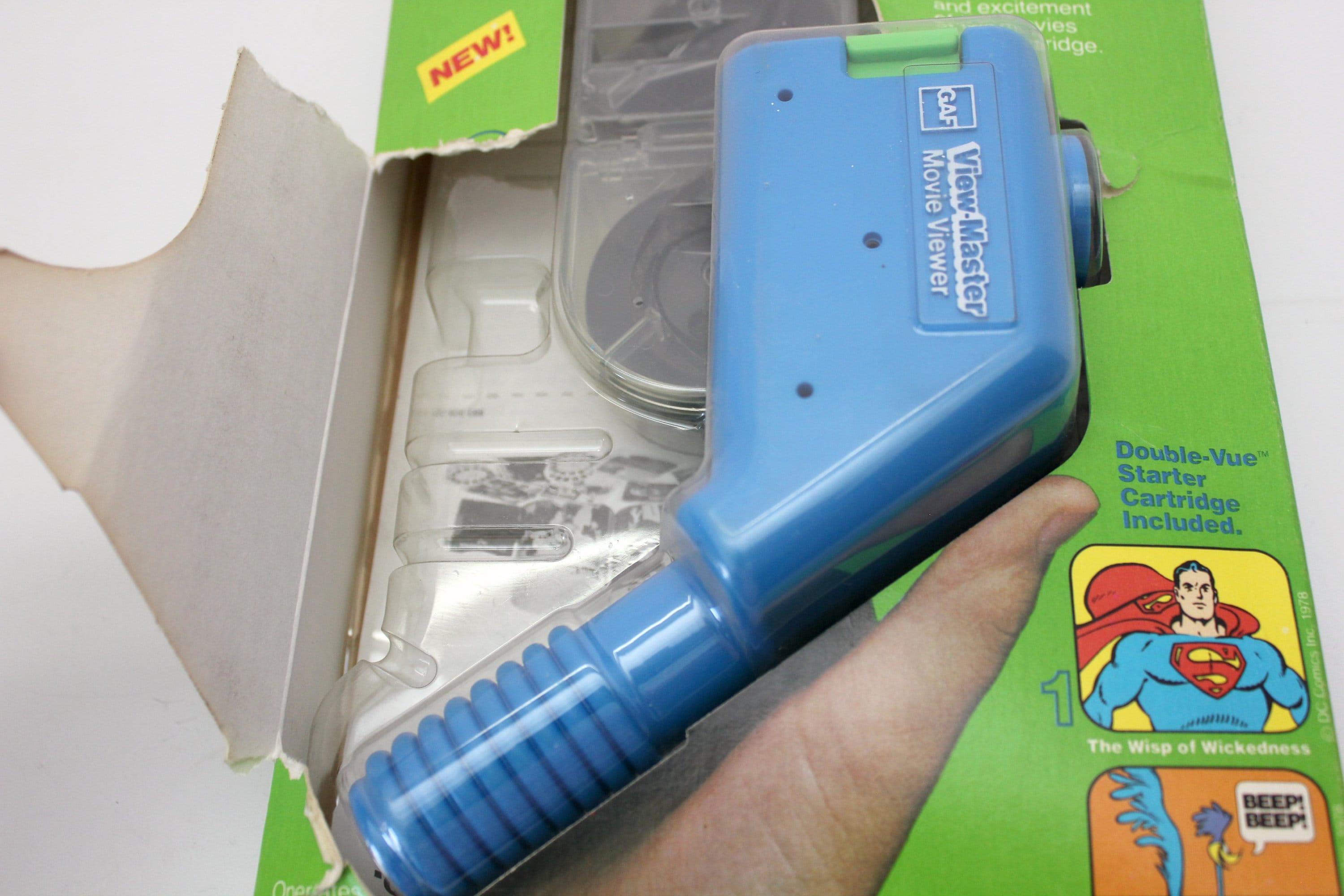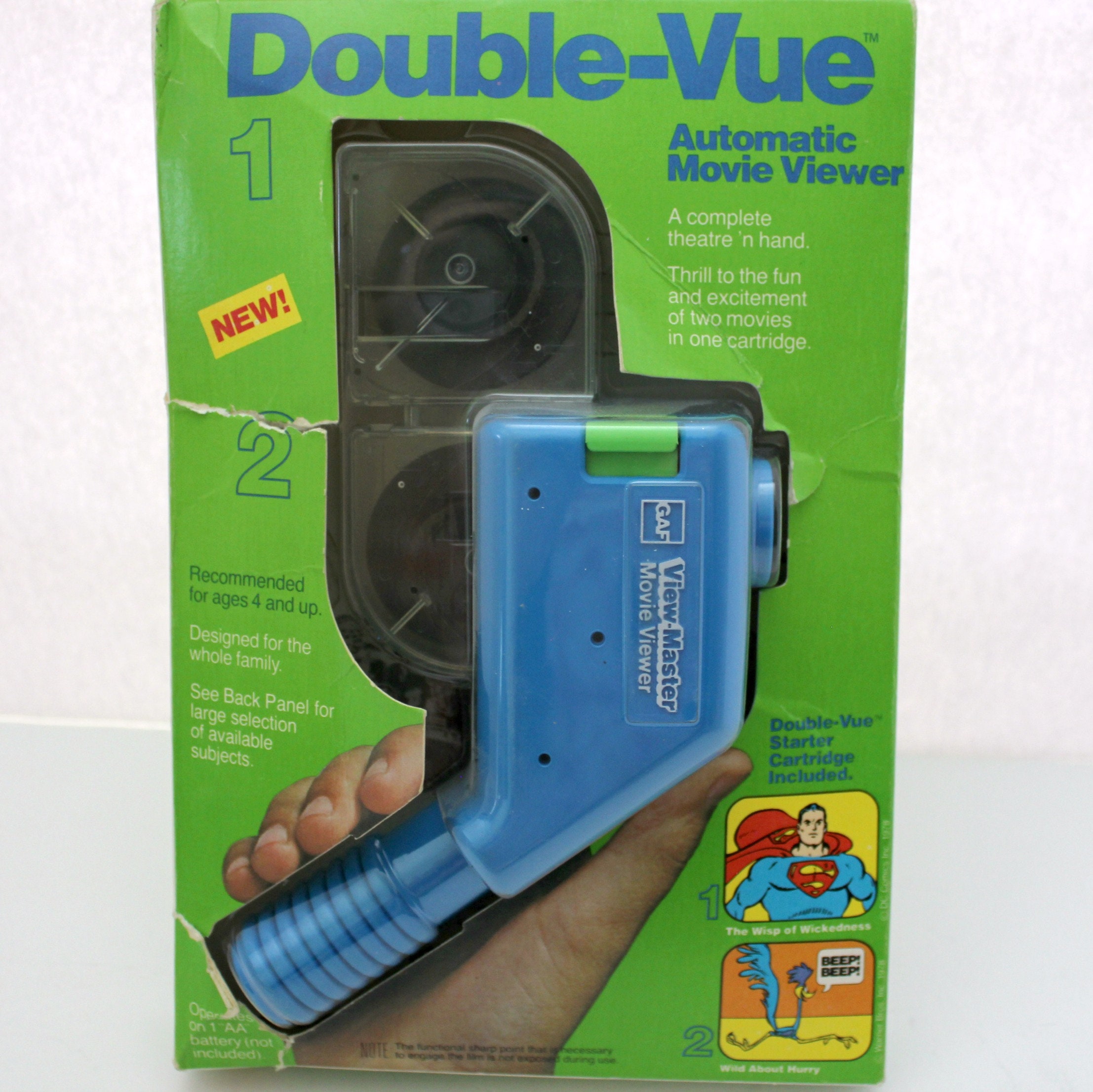 This is a vintage 1970s View-Master Double Vue automatic movie view by GAF. It is still in its original box, never removed or used. It requires one AA battery to operate, which is not included.