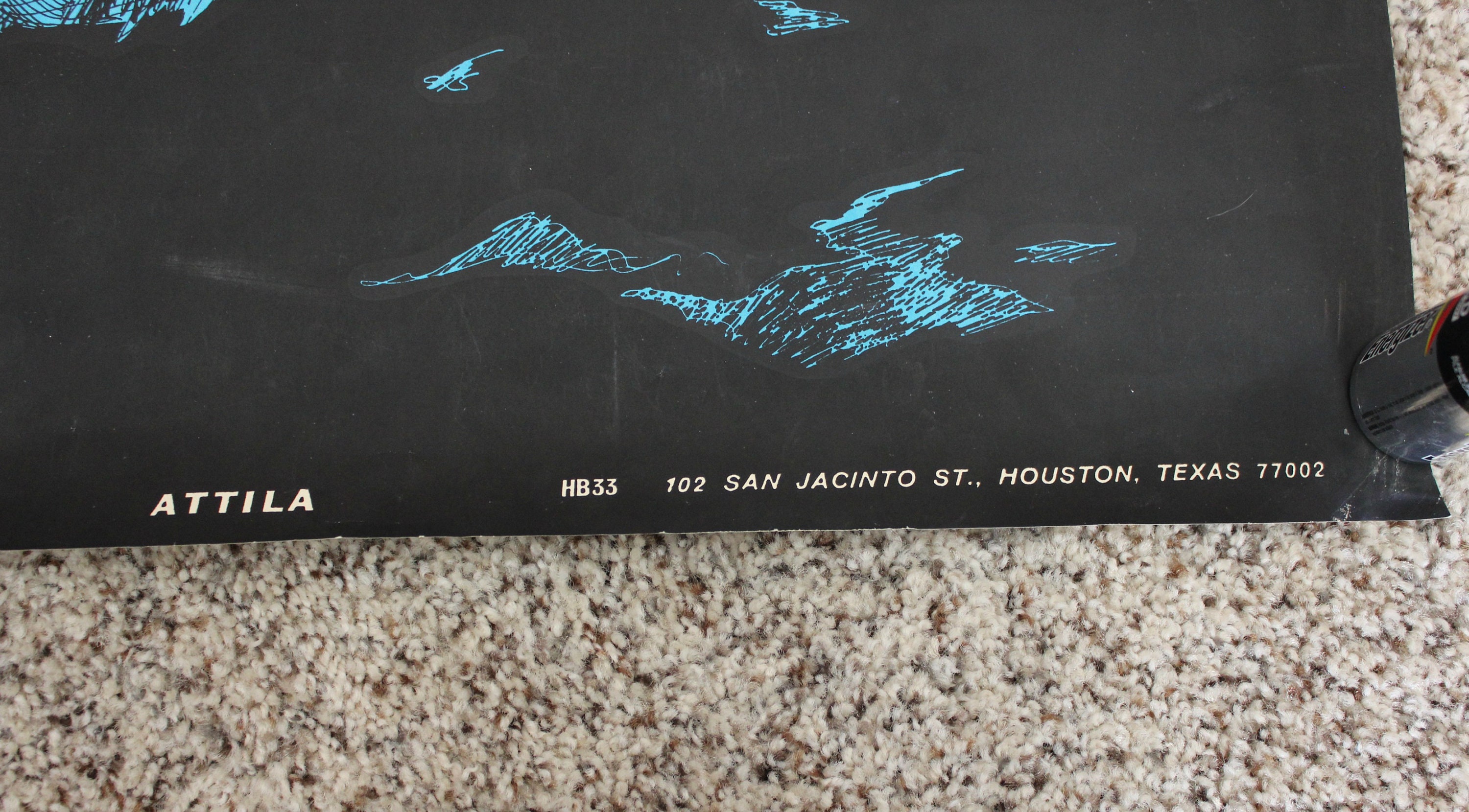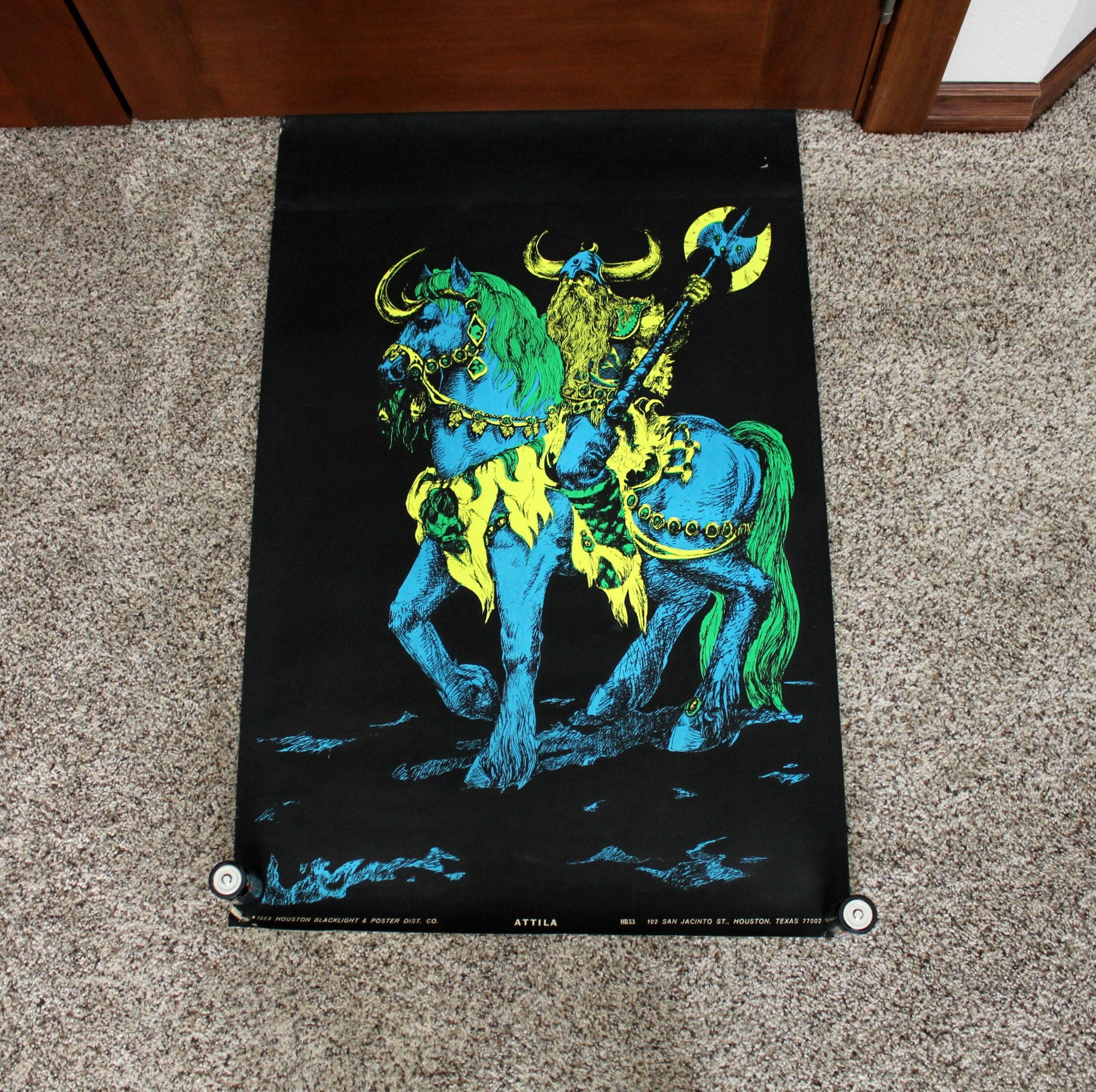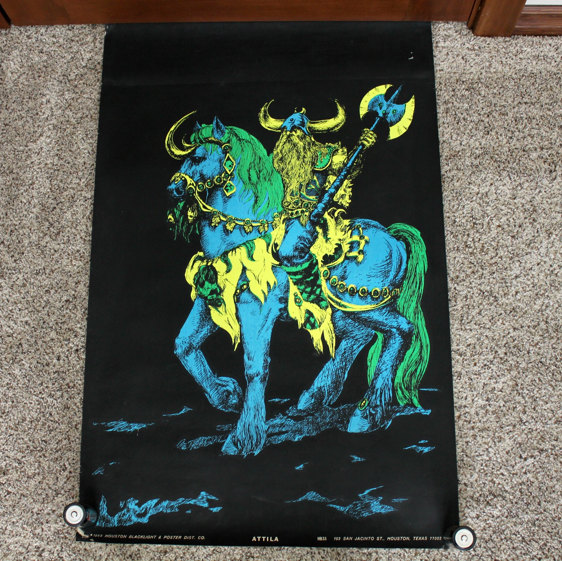 A vintage original blacklight poster titled Attila, probably based on the movie in the 1950s of the same name. Features a Roman looking warrior on a horse.