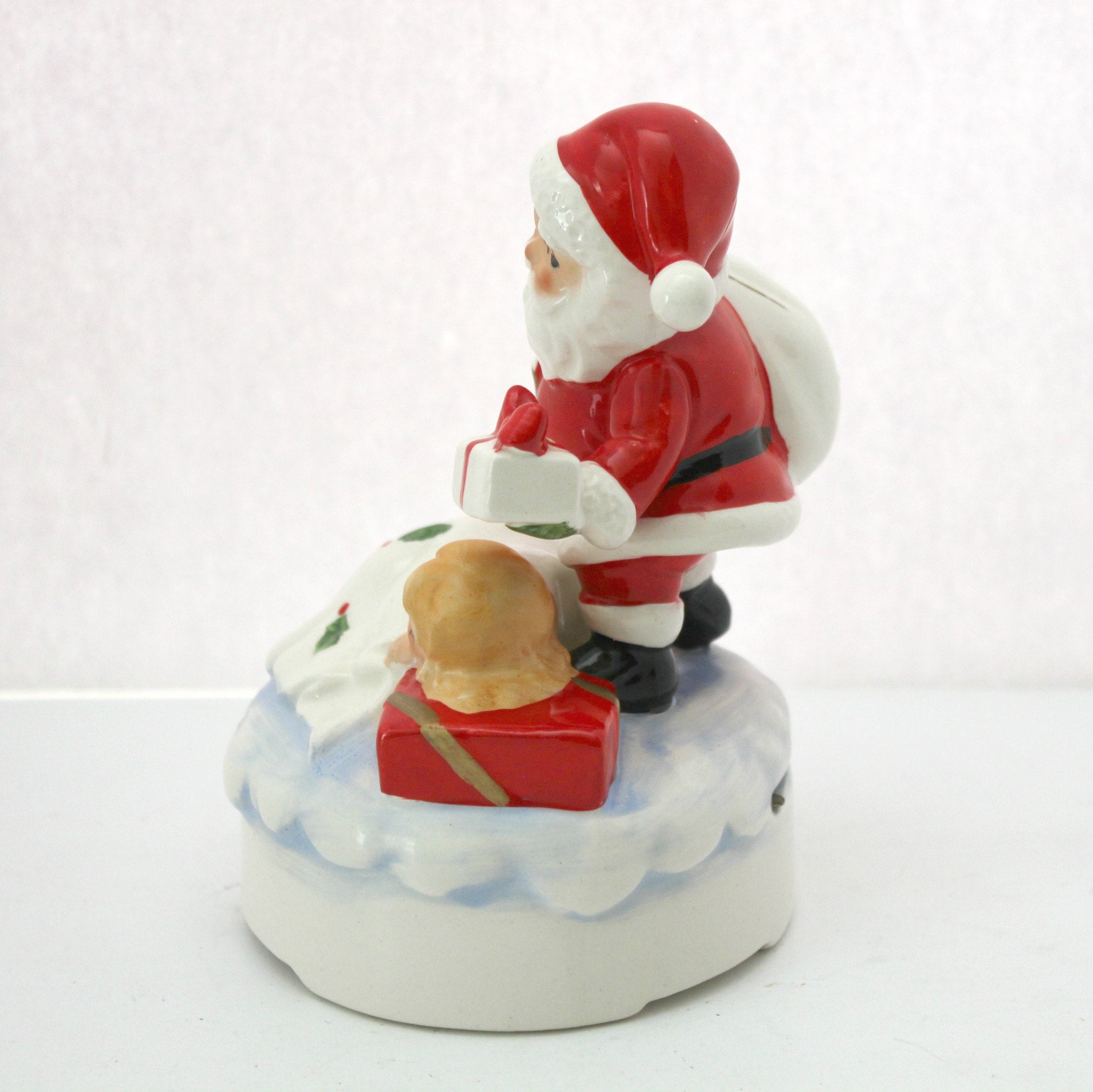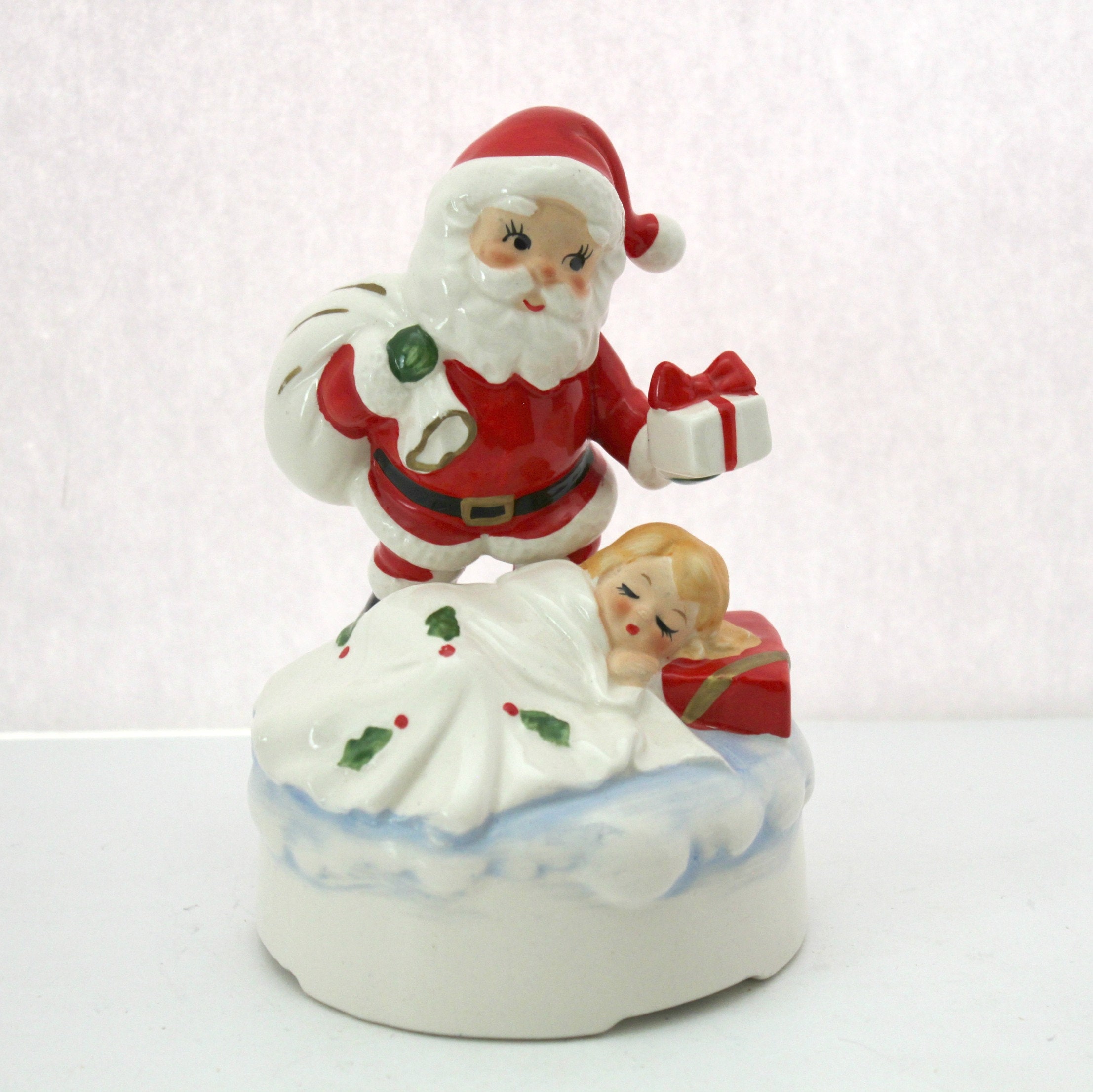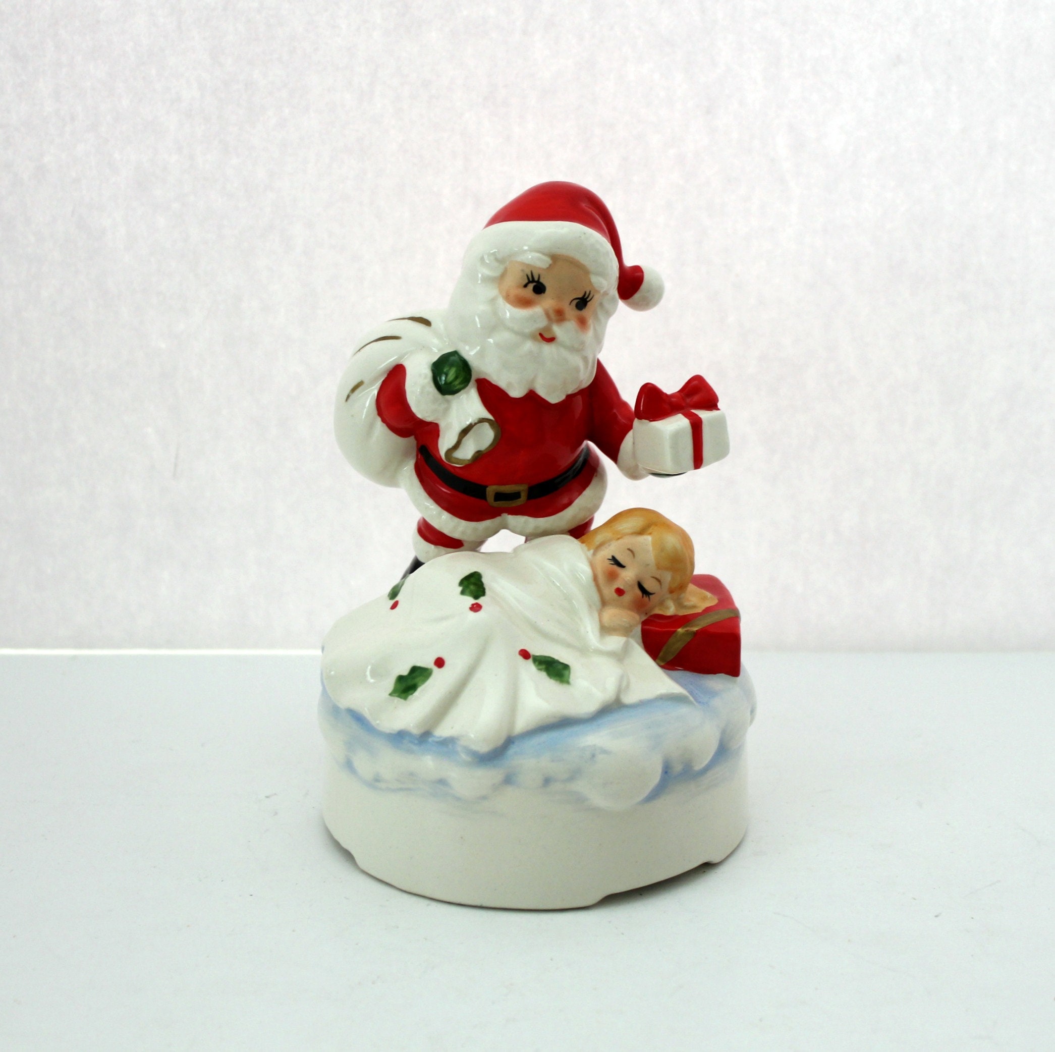 A nice 1960s vintage Lefton Santa ceramic music box figurine with a sleeping child under a white blanket with holly on it. It plays White Christmas when you wind it at the bottom and then use the switch in back to turn the music on or off. The figurine stands about 6" tall.