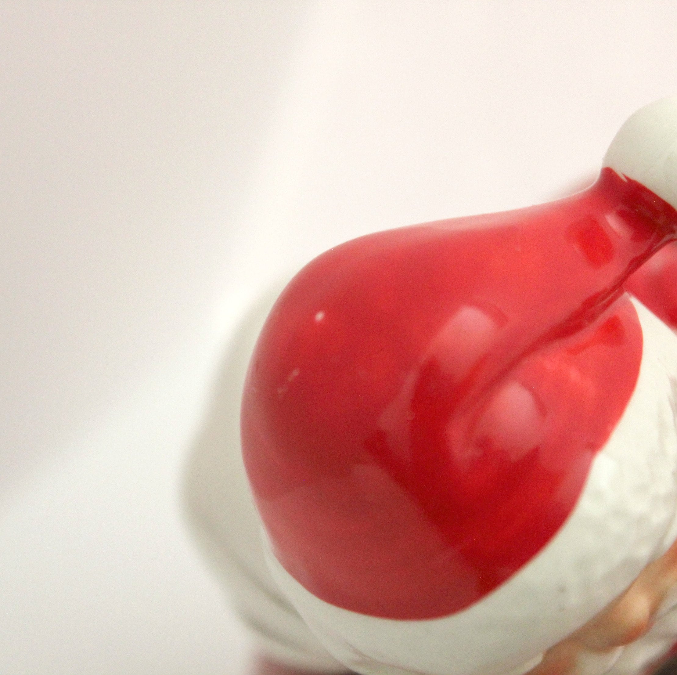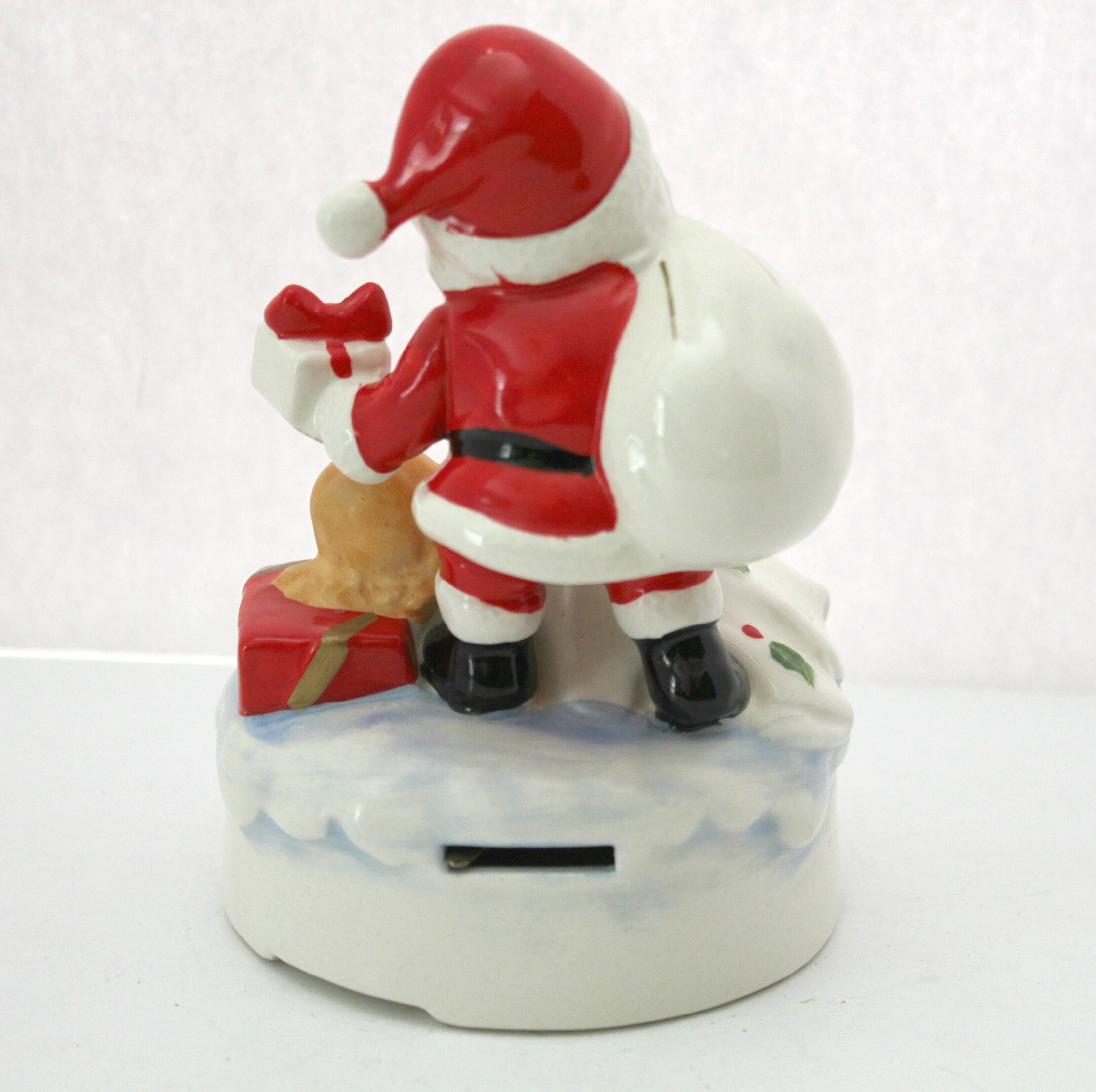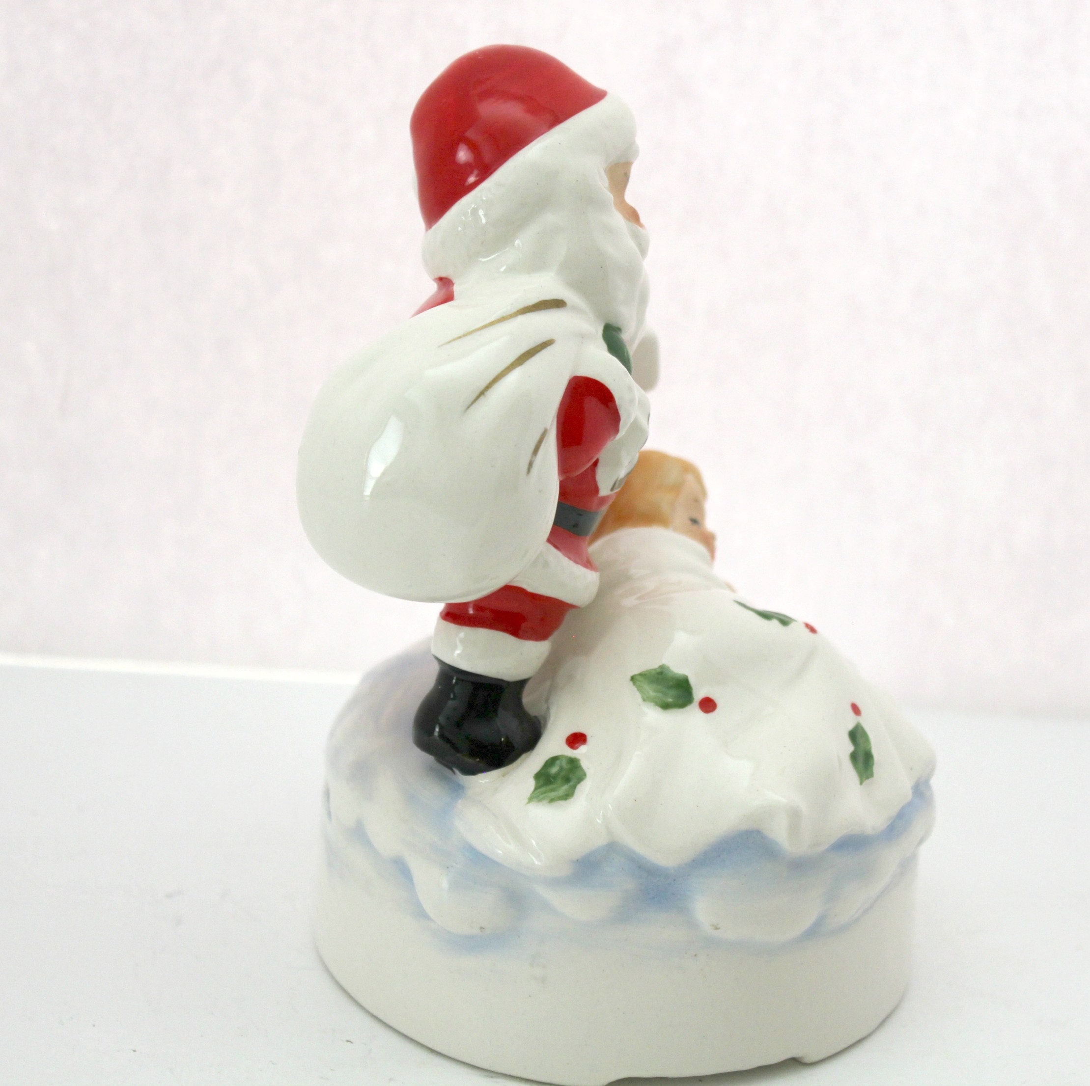A nice 1960s vintage Lefton Santa ceramic music box figurine with a sleeping child under a white blanket with holly on it. It plays White Christmas when you wind it at the bottom and then use the switch in back to turn the music on or off. The figurine stands about 6" tall.