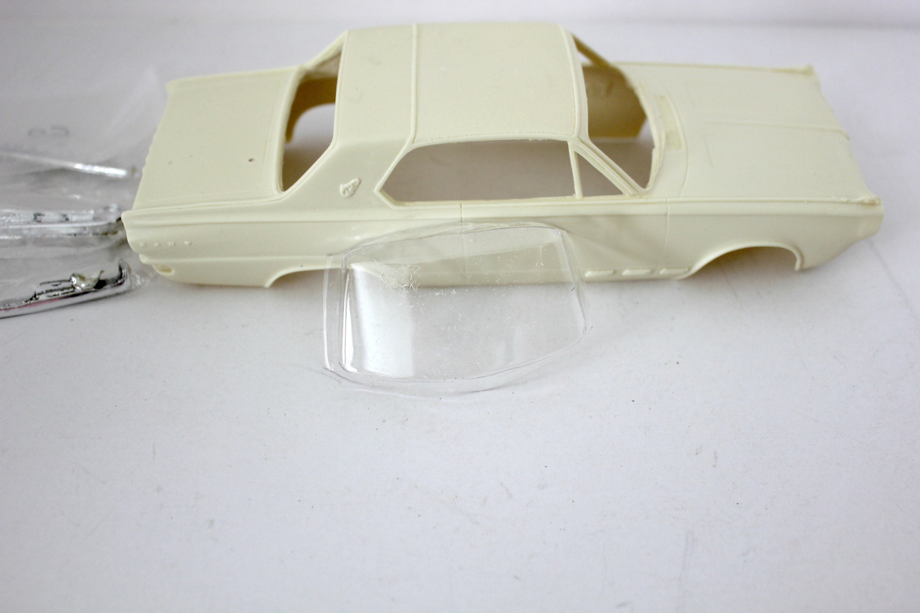 A vintage 1965 Dodge Dart model kit. The car body is a resin type material. You get only what you see in the photo. Three main body parts, windshield and rear window, three chrome colored pieces.