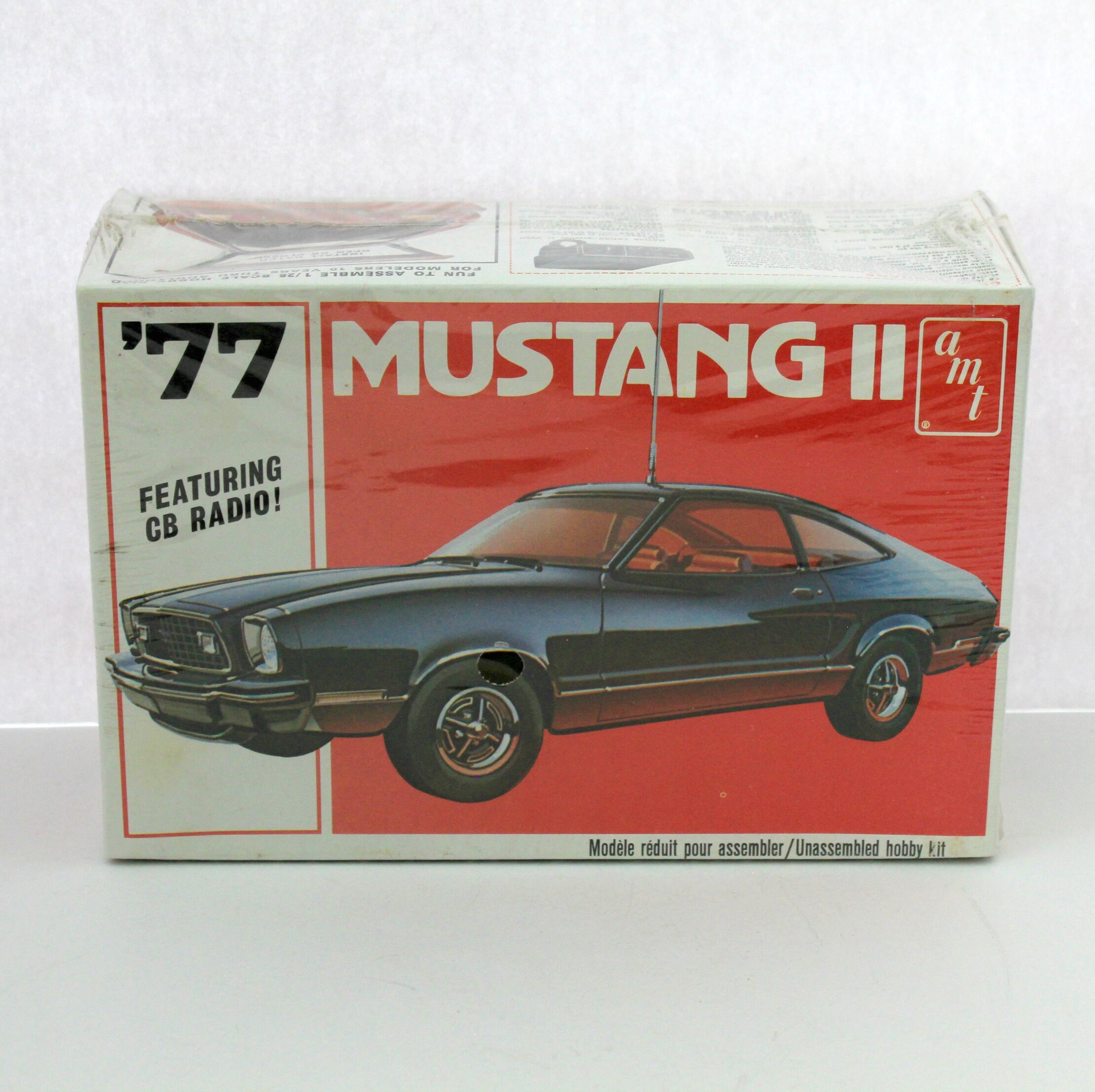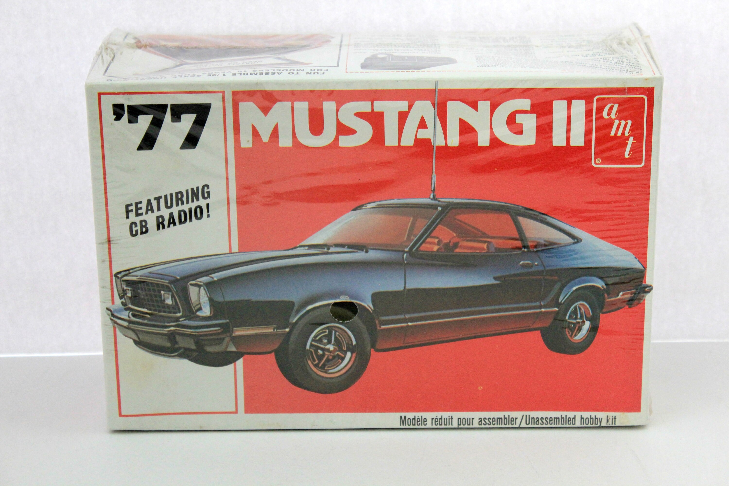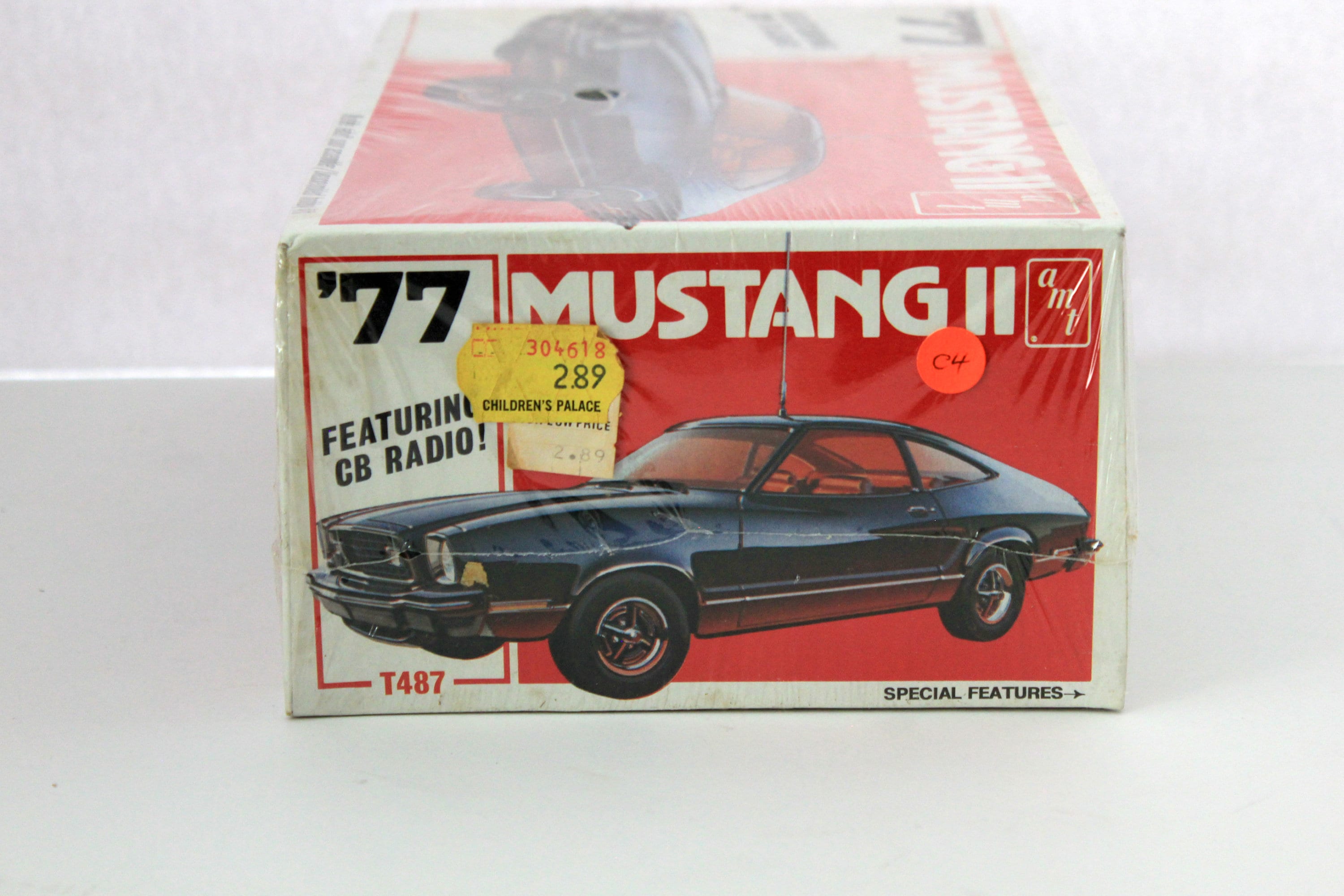 A vintage NOS sealed '77 Ford Mustang II model kit T487 by AMT. Recommended for ages 10 years to adult. Includes CB Radio for the model car.
