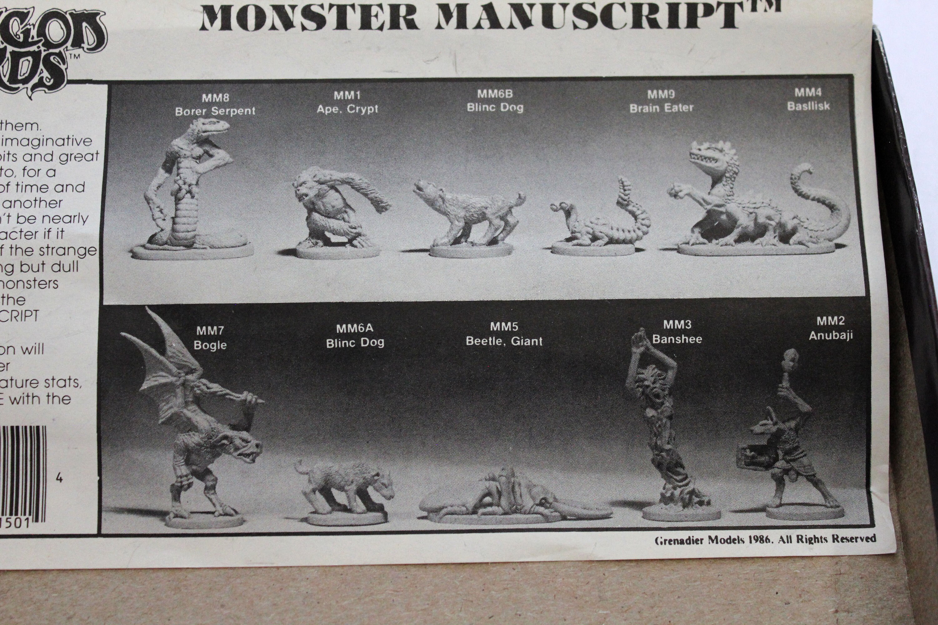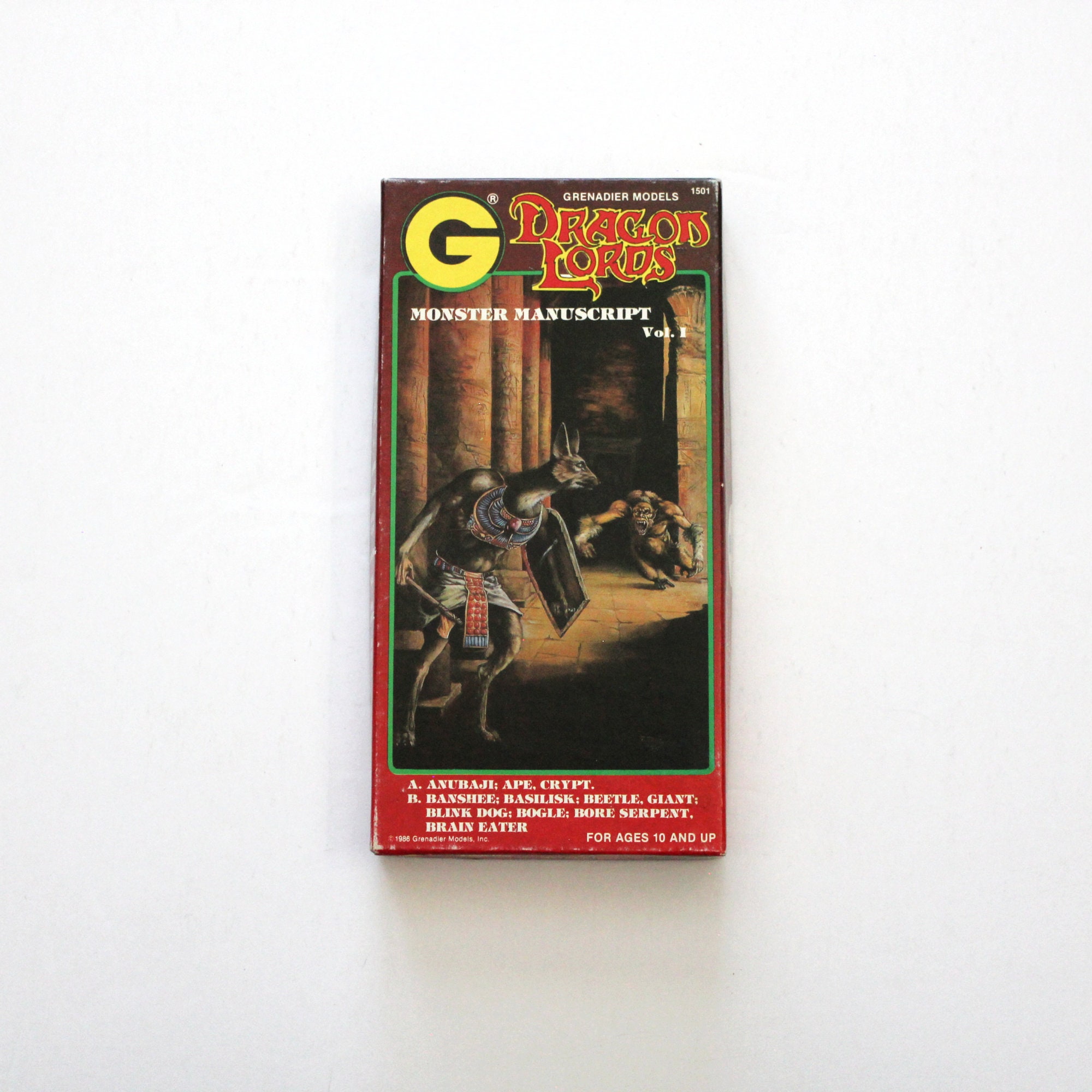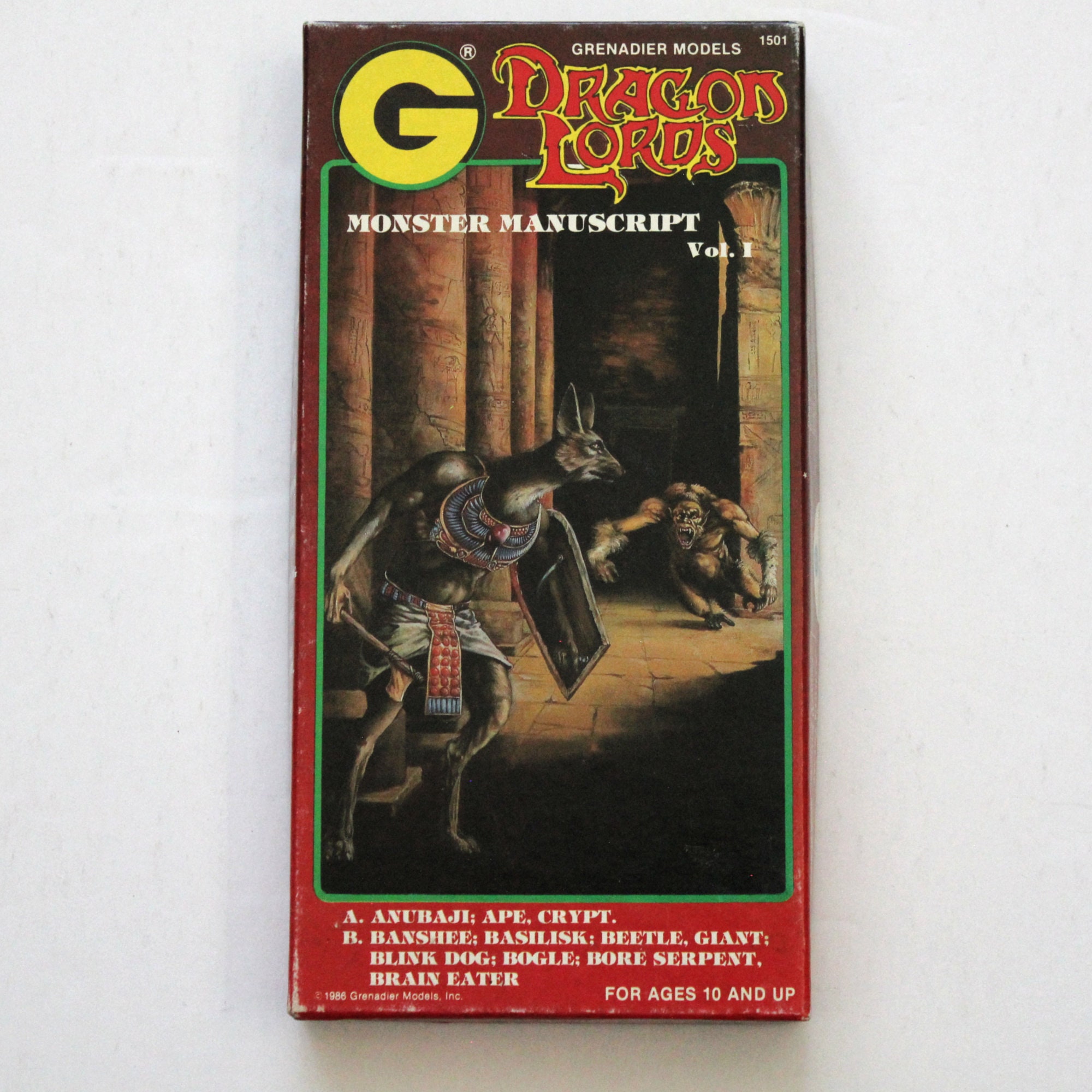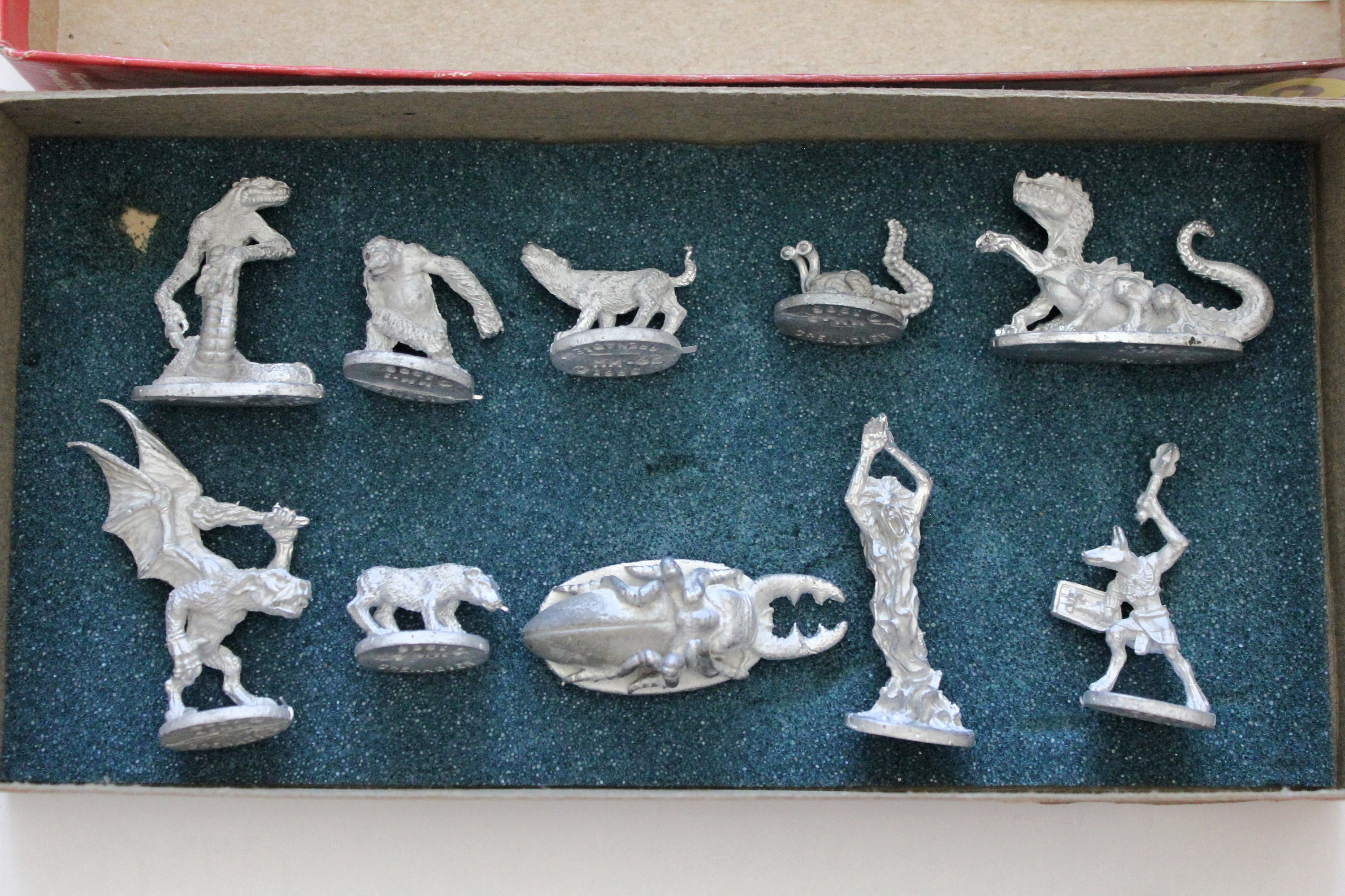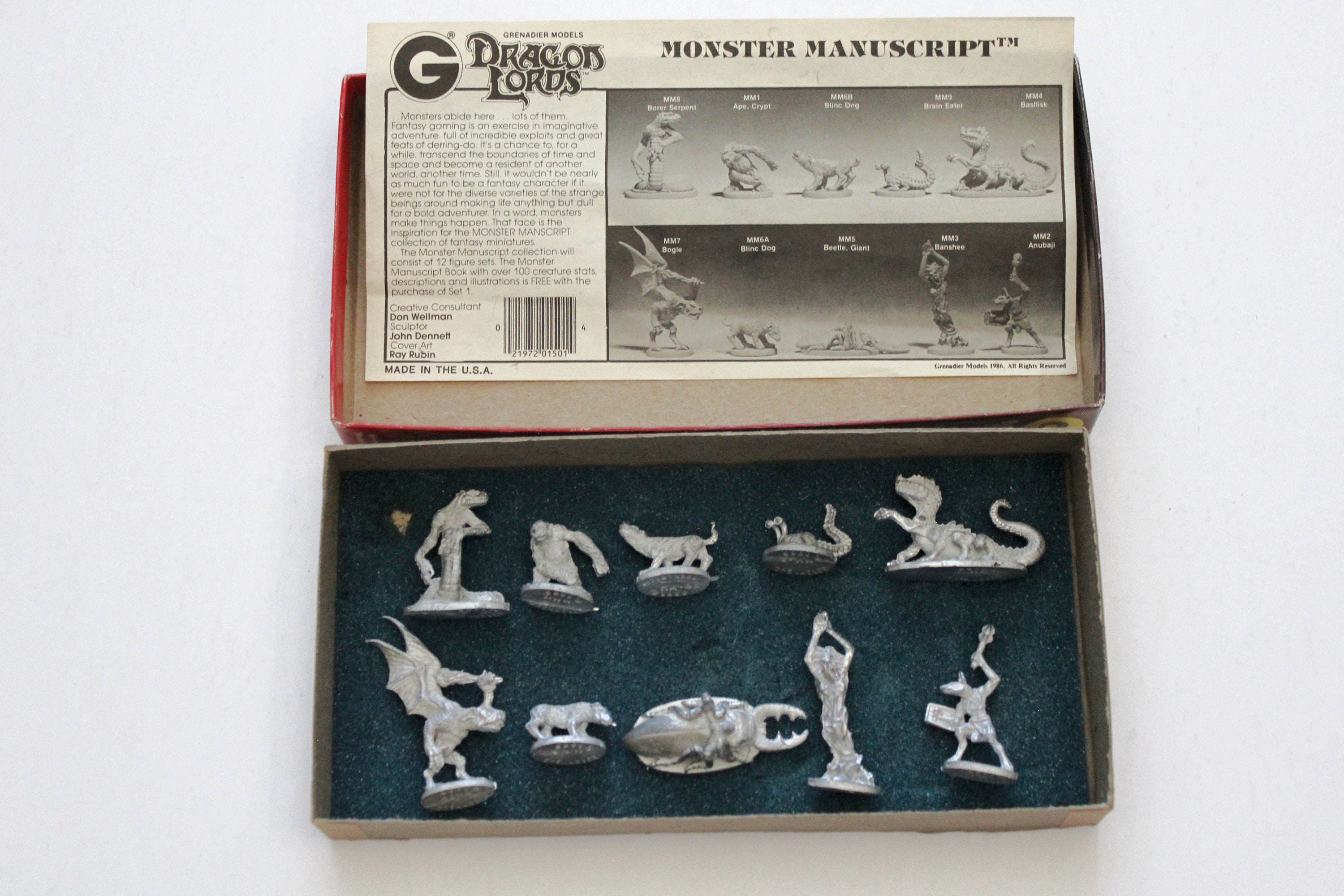 A vintage 1986 Dragon Lords Monster Manuscript Vol 1 set of 10 metal miniature figures for role playing games.